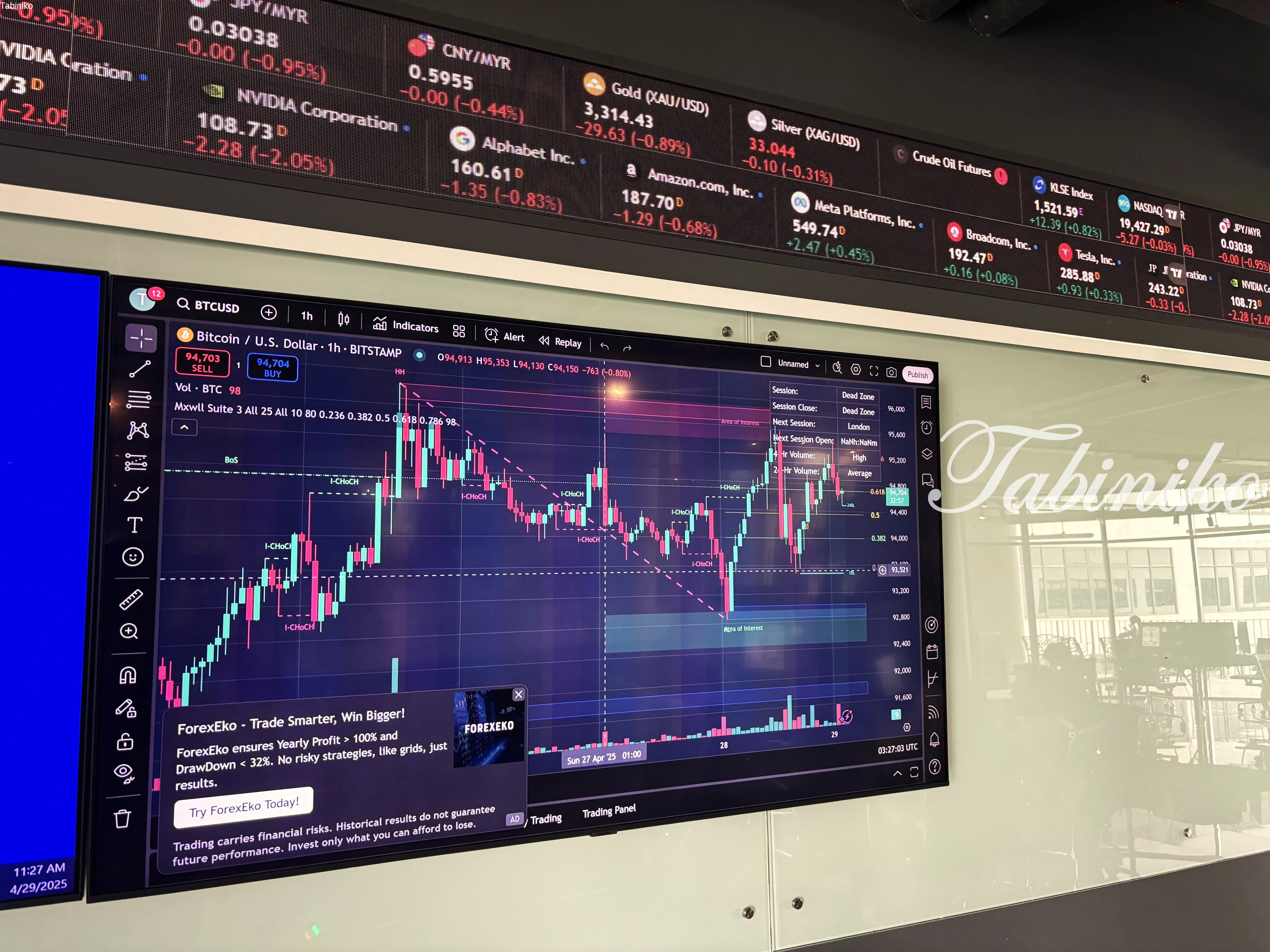 Stock tickers displaying share prices lined the walls, and there were six clocks showing the time in different countries around the world.