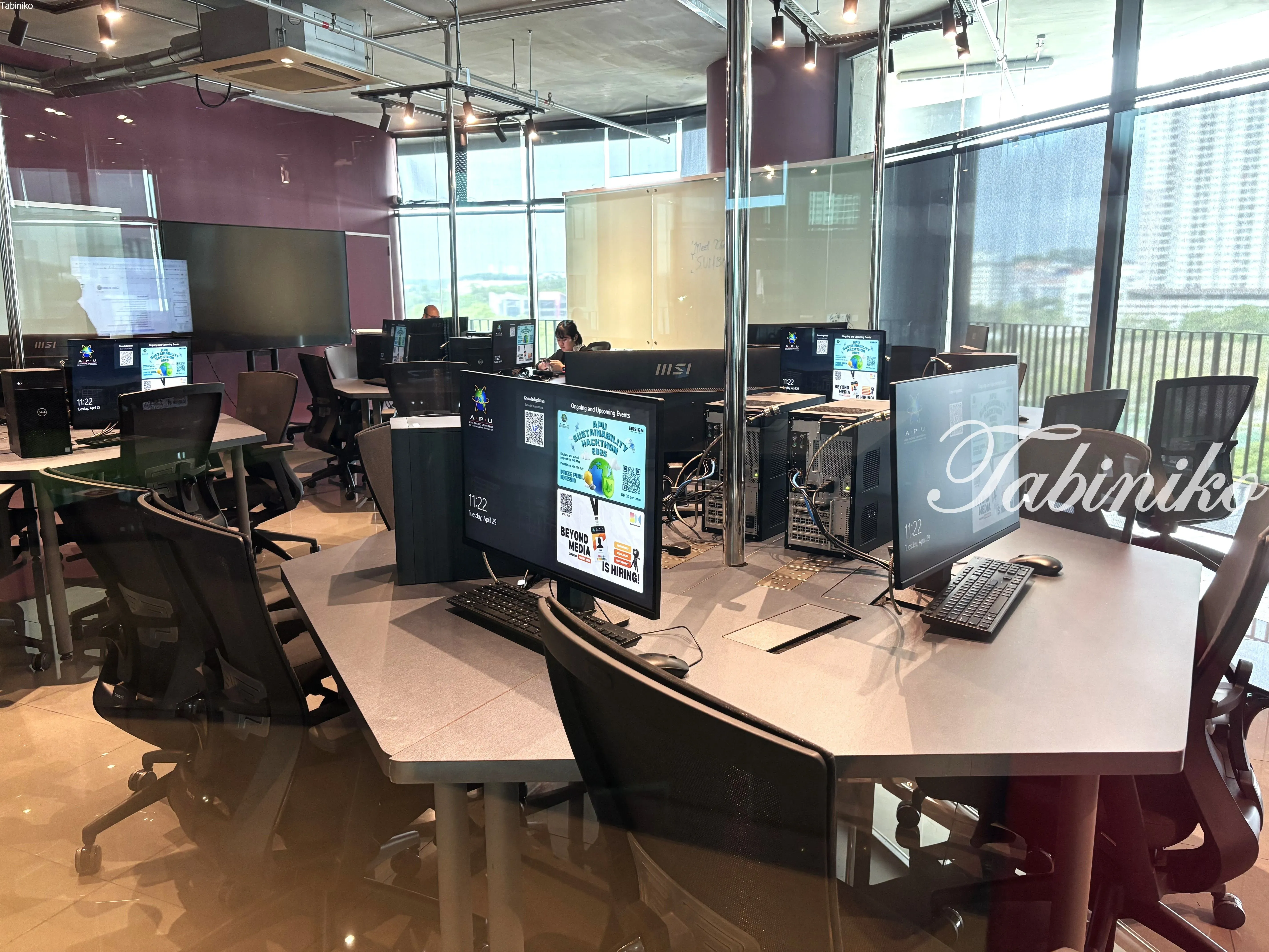 The official name of APU is Asia Pacific University of Technology & Innovation, and just as its name suggests, it’s a futuristic university with a strong focus on IT and innovation! It honestly felt like stepping into another dimension. The number of computers, the atmosphere of the classrooms — everything was on another level! Many of the classrooms had glass walls, so we could clearly see students working on computers during their lessons.