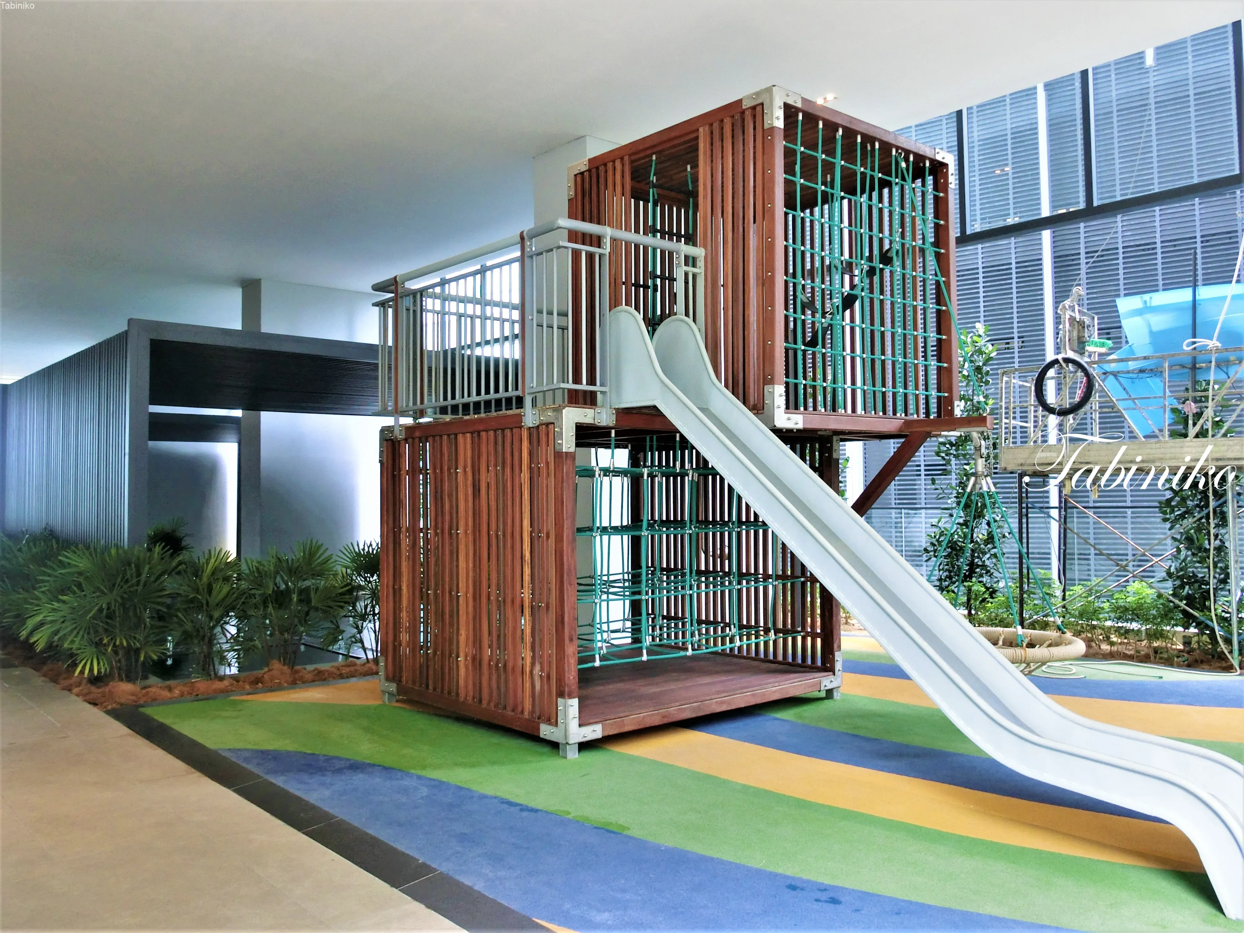 Rest area. You can play on the artificial lawn It’s good for letting small children play here.