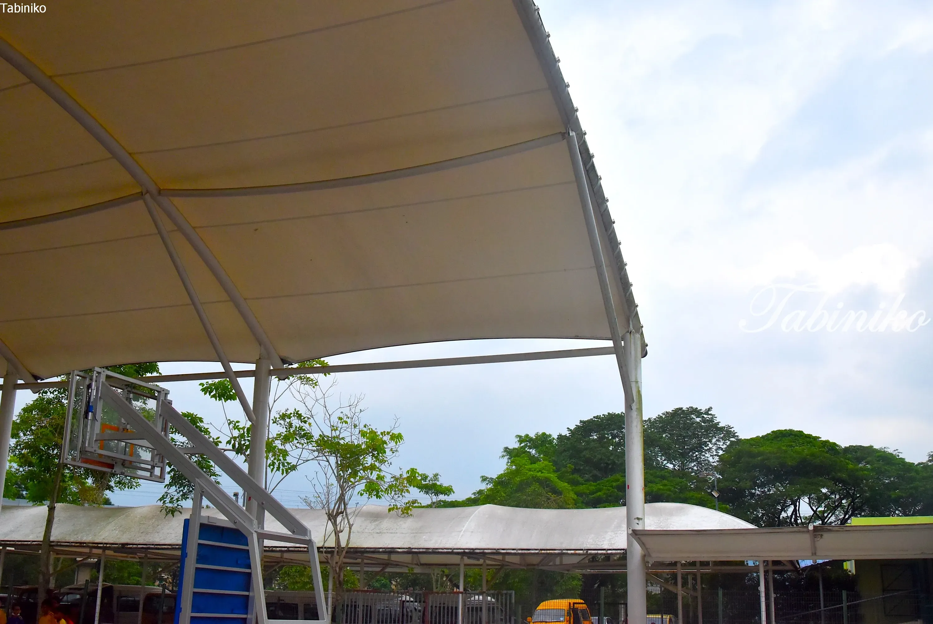 It is a semi-outdoor basketball court with a roof.