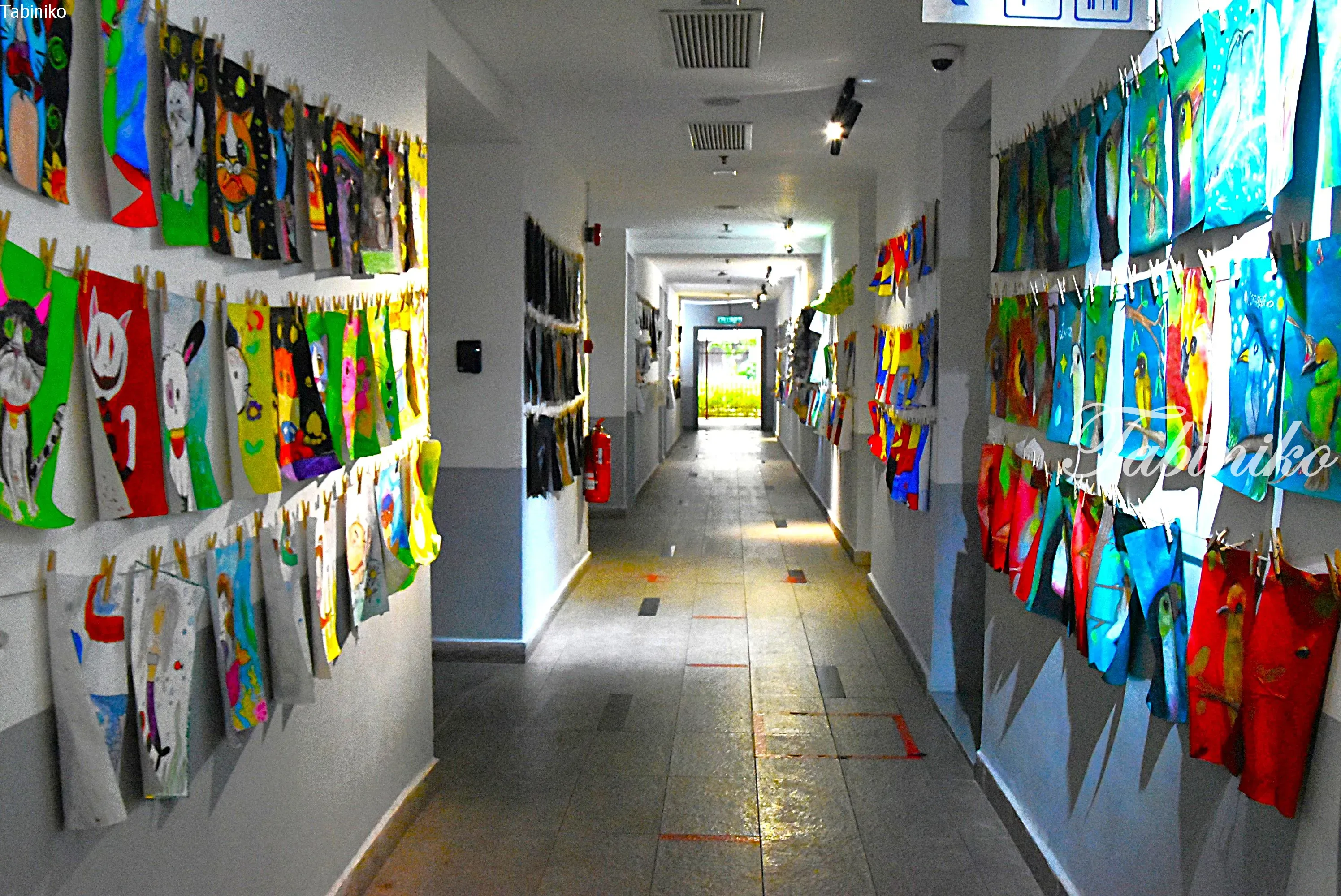 The hallway was filled with students’ artworks on display.