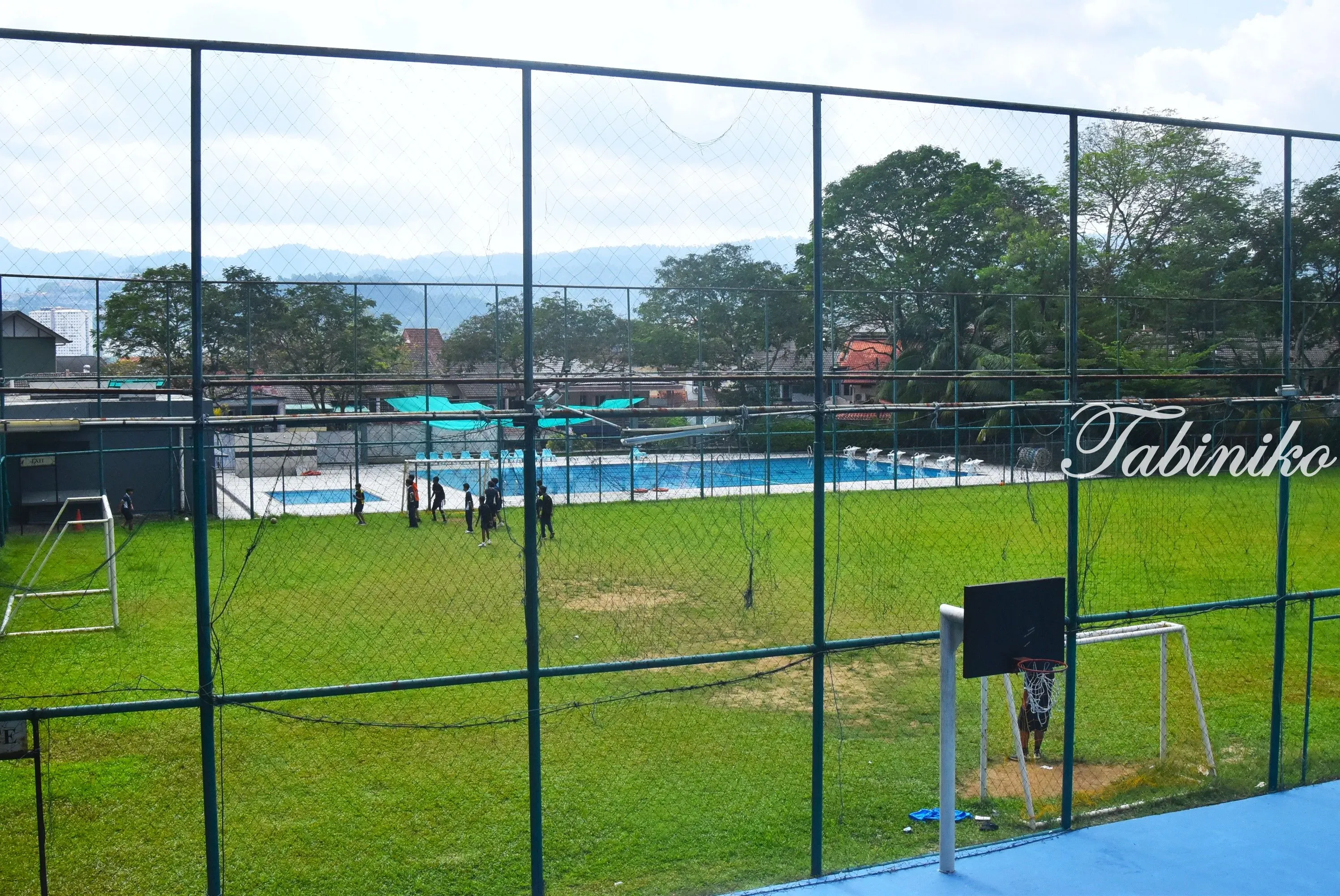 There are also a pool, a grass field, and a basketball court.