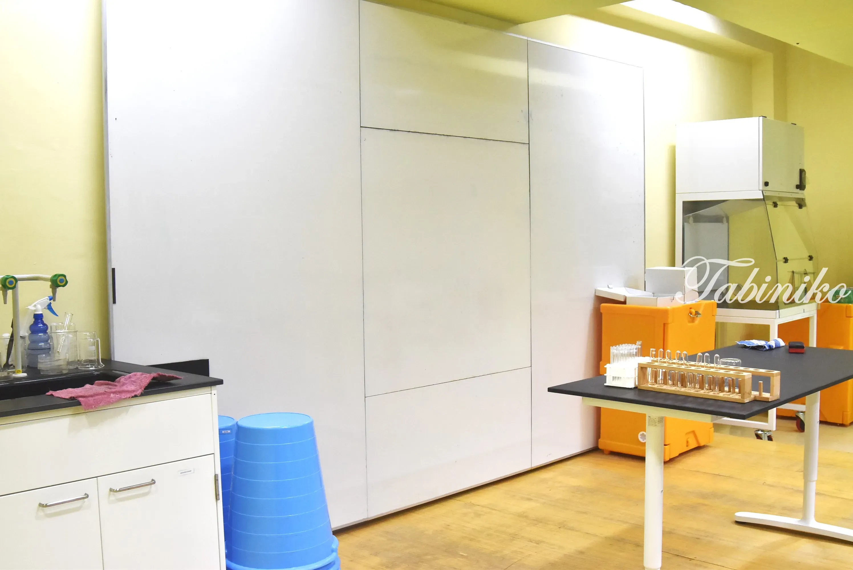 The yellow device on the left side of the photo is an emergency safety shower, commonly found in science labs, used to quickly rinse off chemicals in case of spills or accidents.