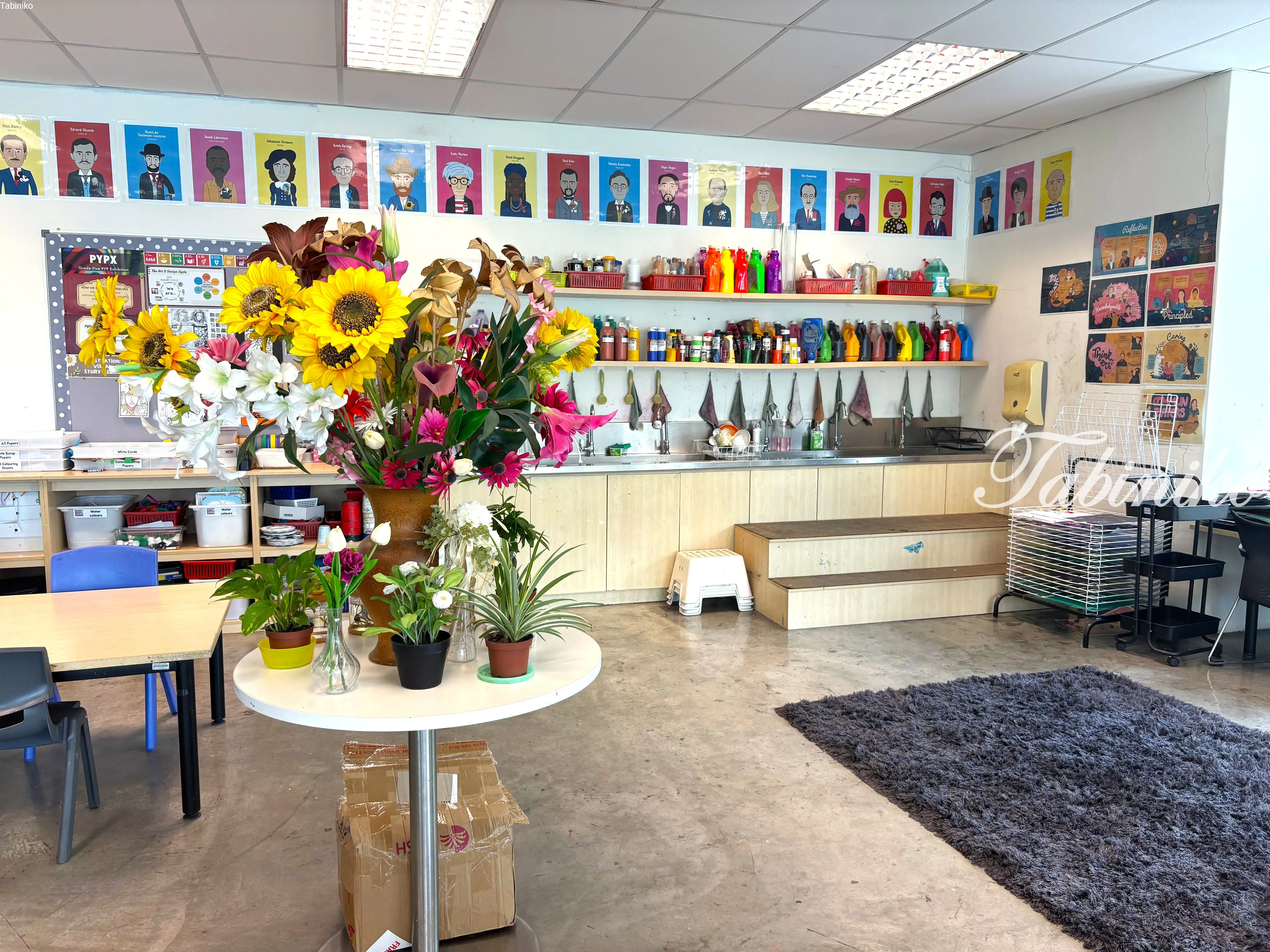 The logo displayed above the classroom appears to be made of ceramic—so stylish!