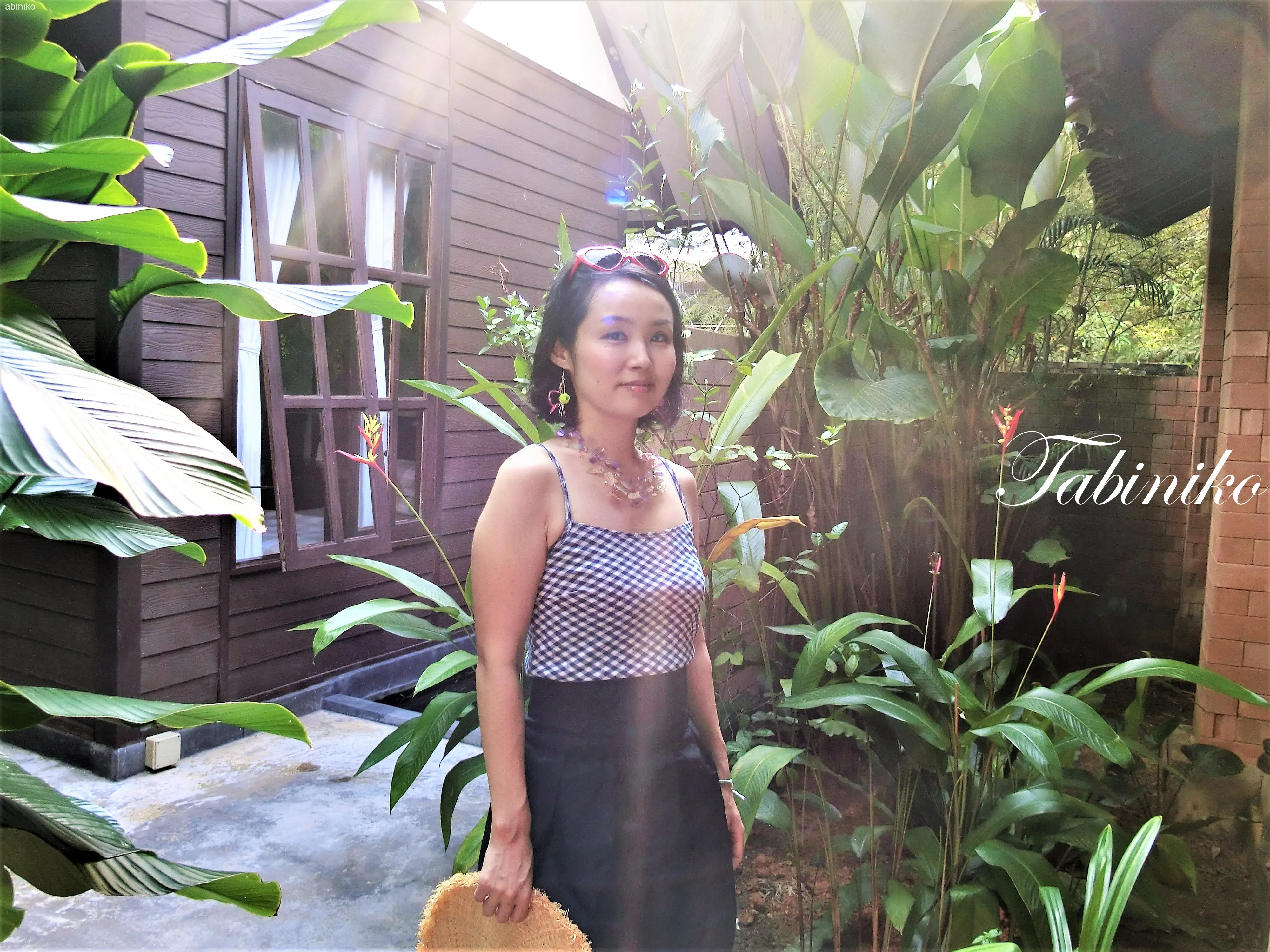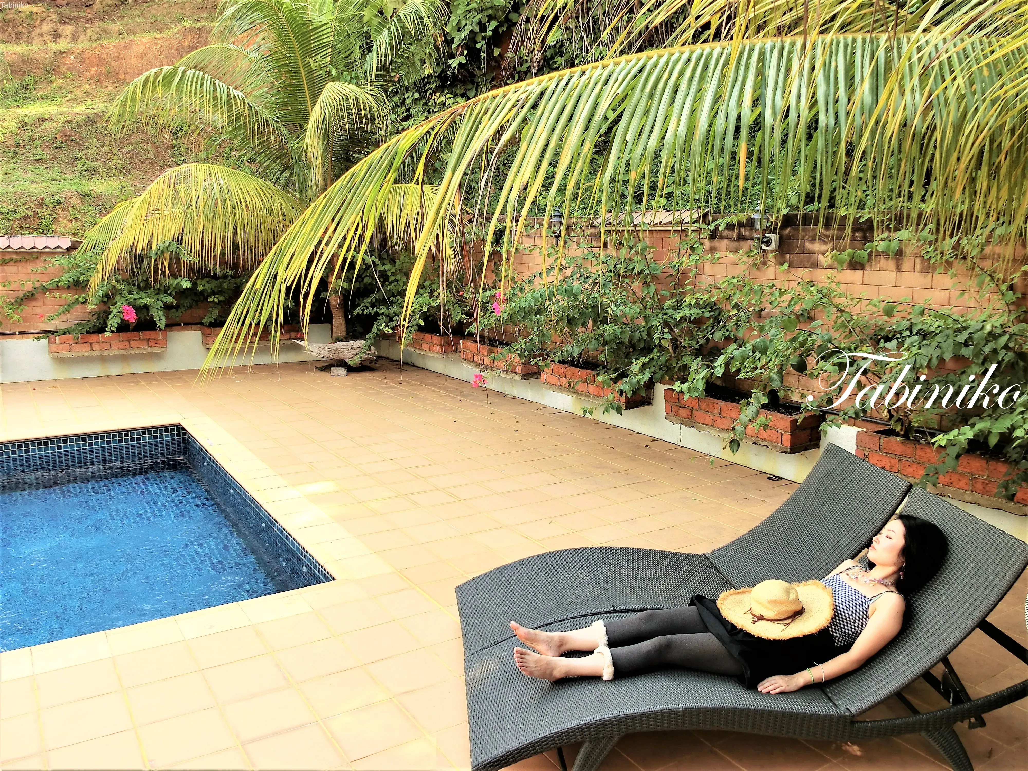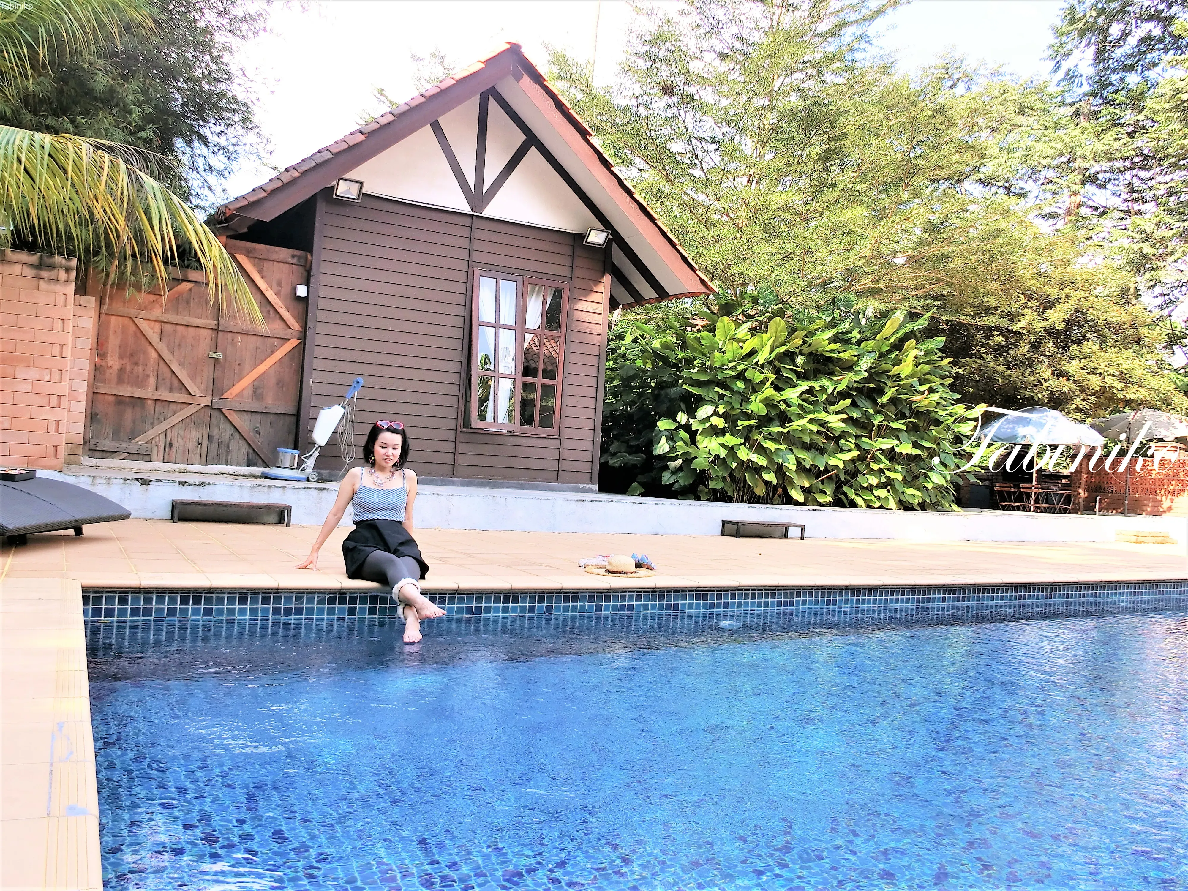 Now, I’ am super relaxing at the pool side (^_-)-☆ Please forgive my slobbery mouth, it’s feeling too good. It’s private pool with the colourful flower! This the plants call [bougainvaillea] with pink and I really like blue pool and pink combination.