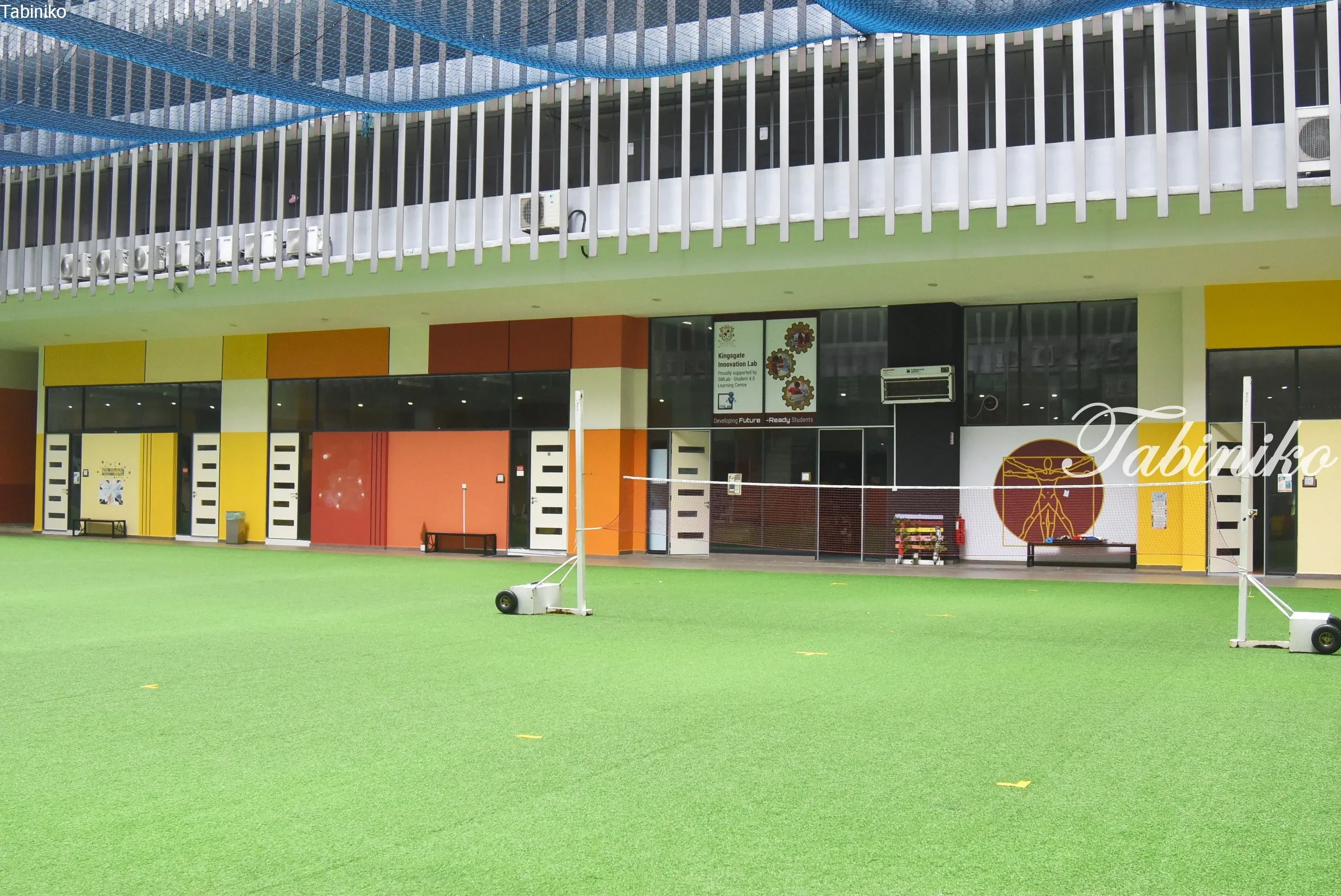 The school has a central playground, with classrooms, the cafeteria, library, and other facilities surrounding it.
