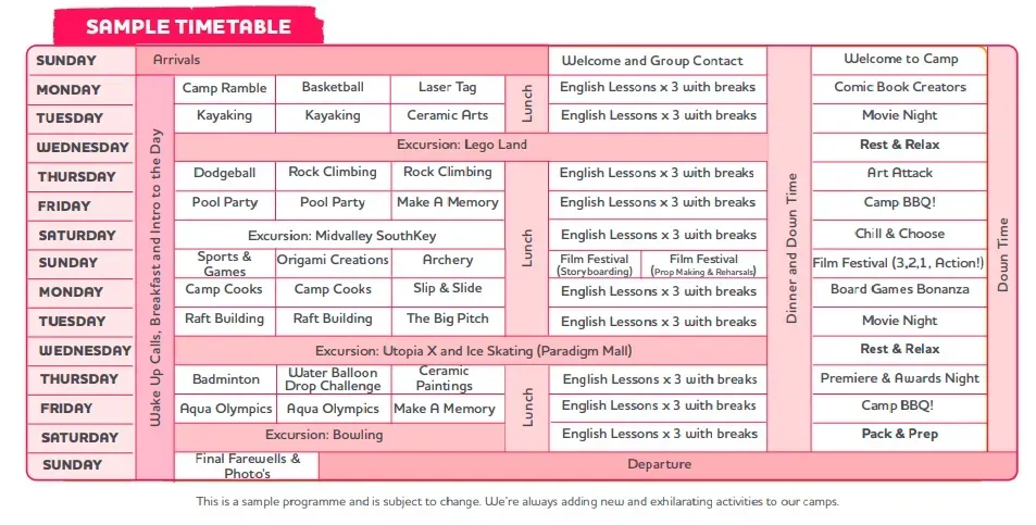 - Accommodation: 4-person shared room [Sample Schedule for the English Language Camp Programme