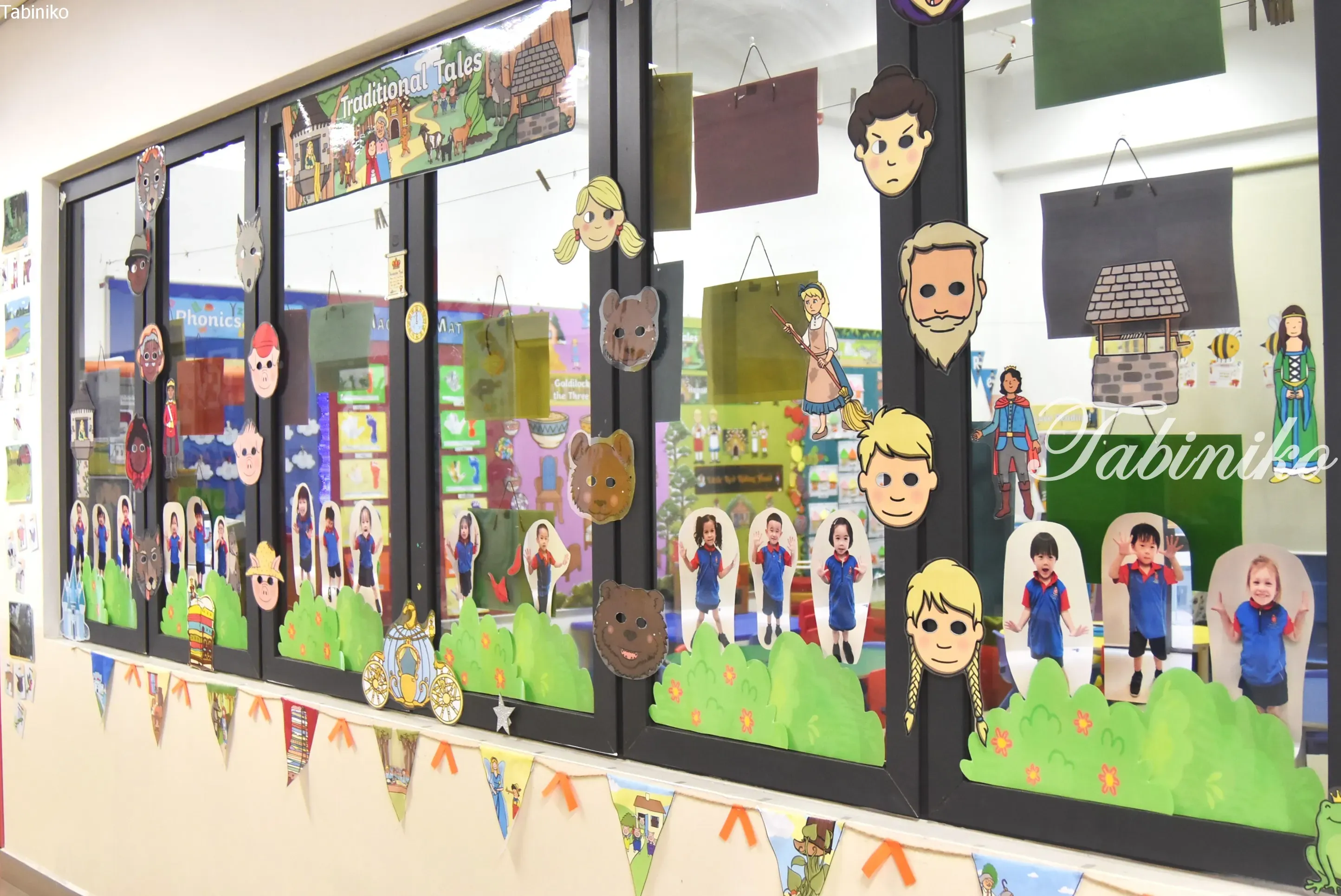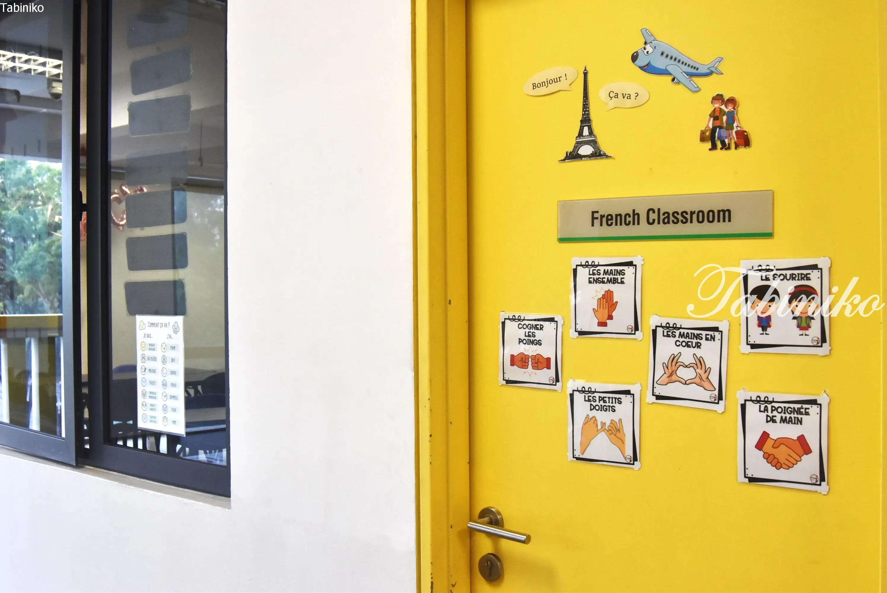 The doors and walls of each classroom are decorated to indicate the subject of the class.