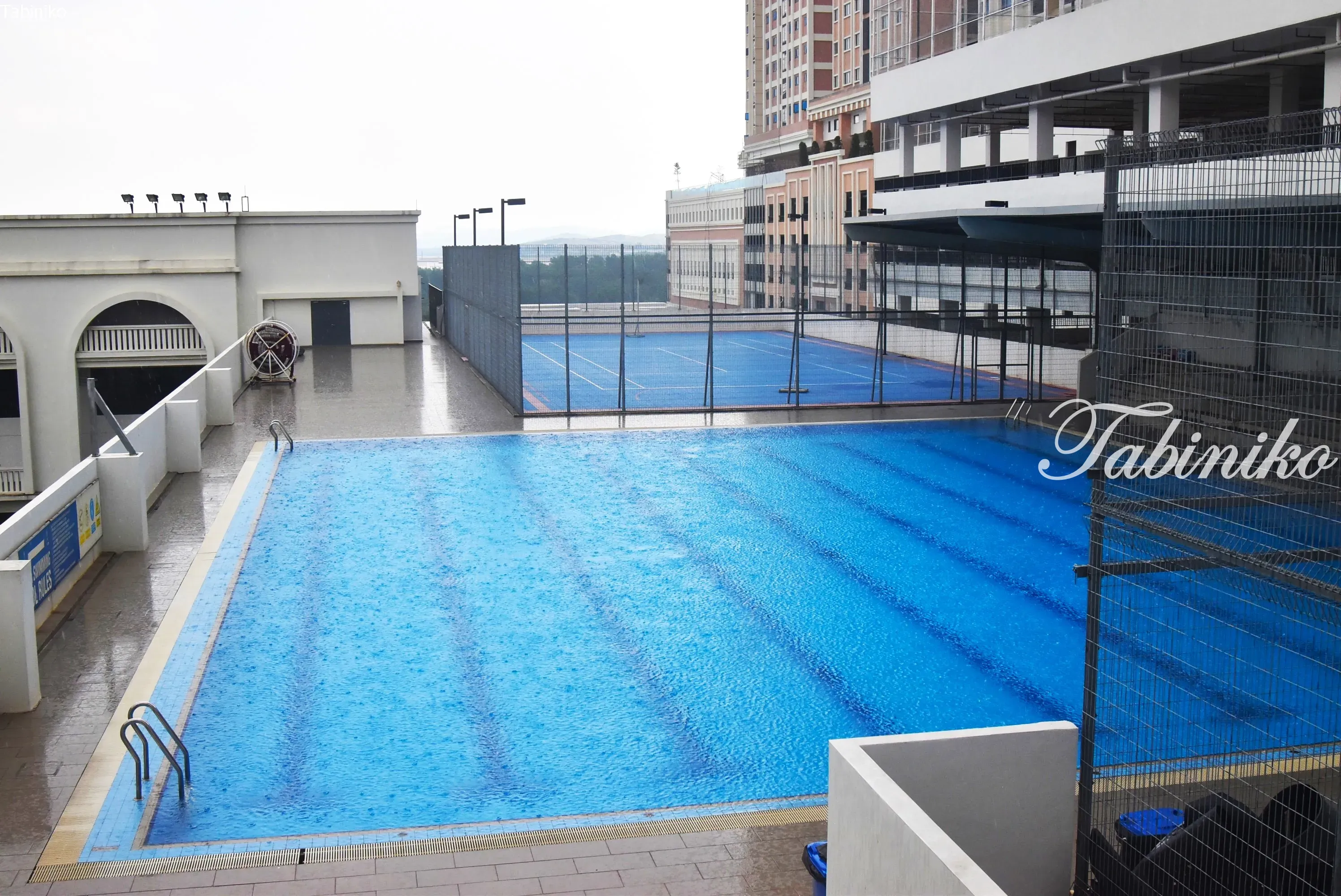 There is a large pool with 8 lanes, and it is very spacious. It was raining at the time of our visit.