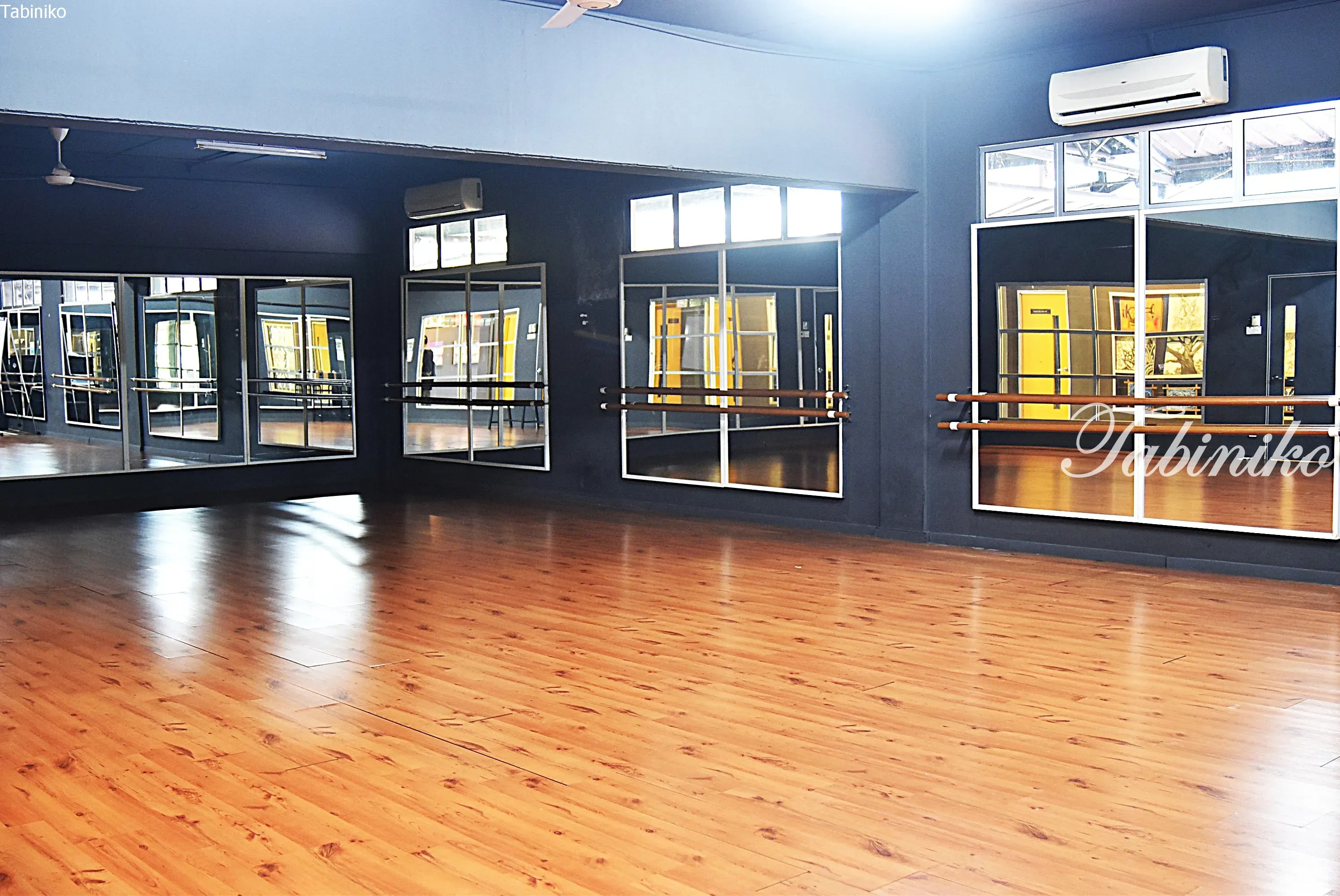 It is a beautiful dance studio equipped with mirrors and air conditioning.