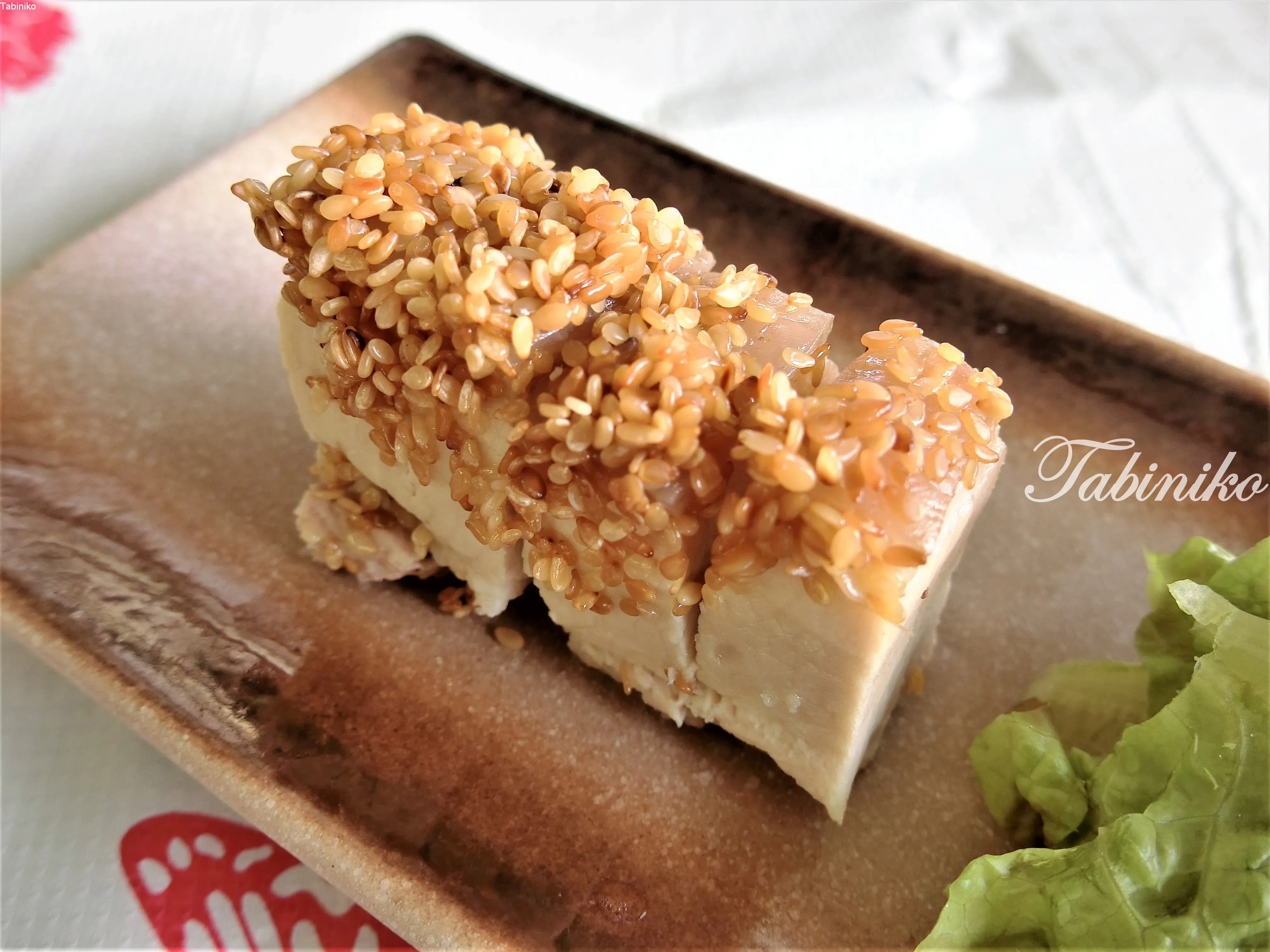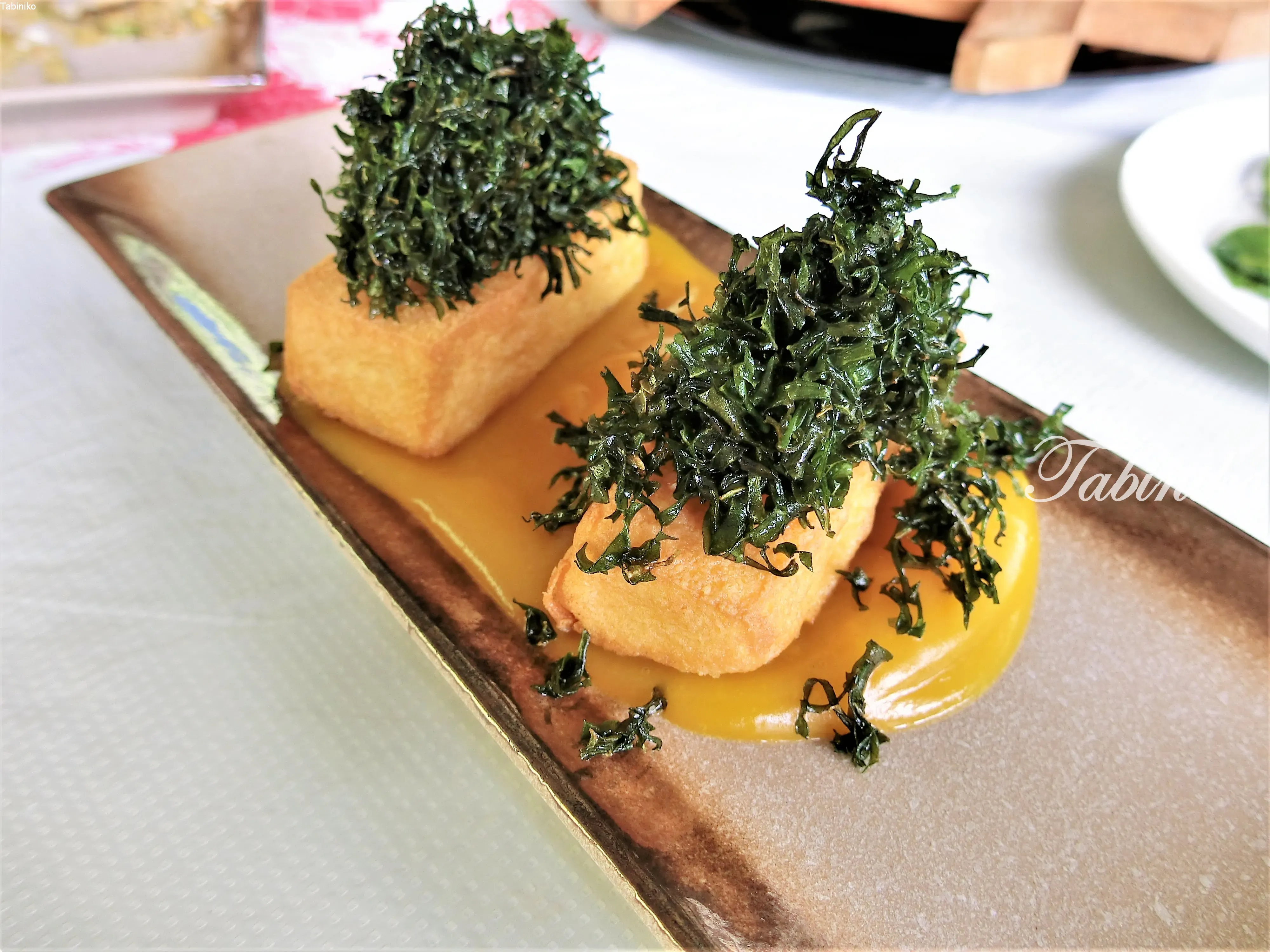 This is a dish of fried tofu topped with fried leafy vegetables and a pumpkin sauce, which is also excellent!! I want to eat this again!