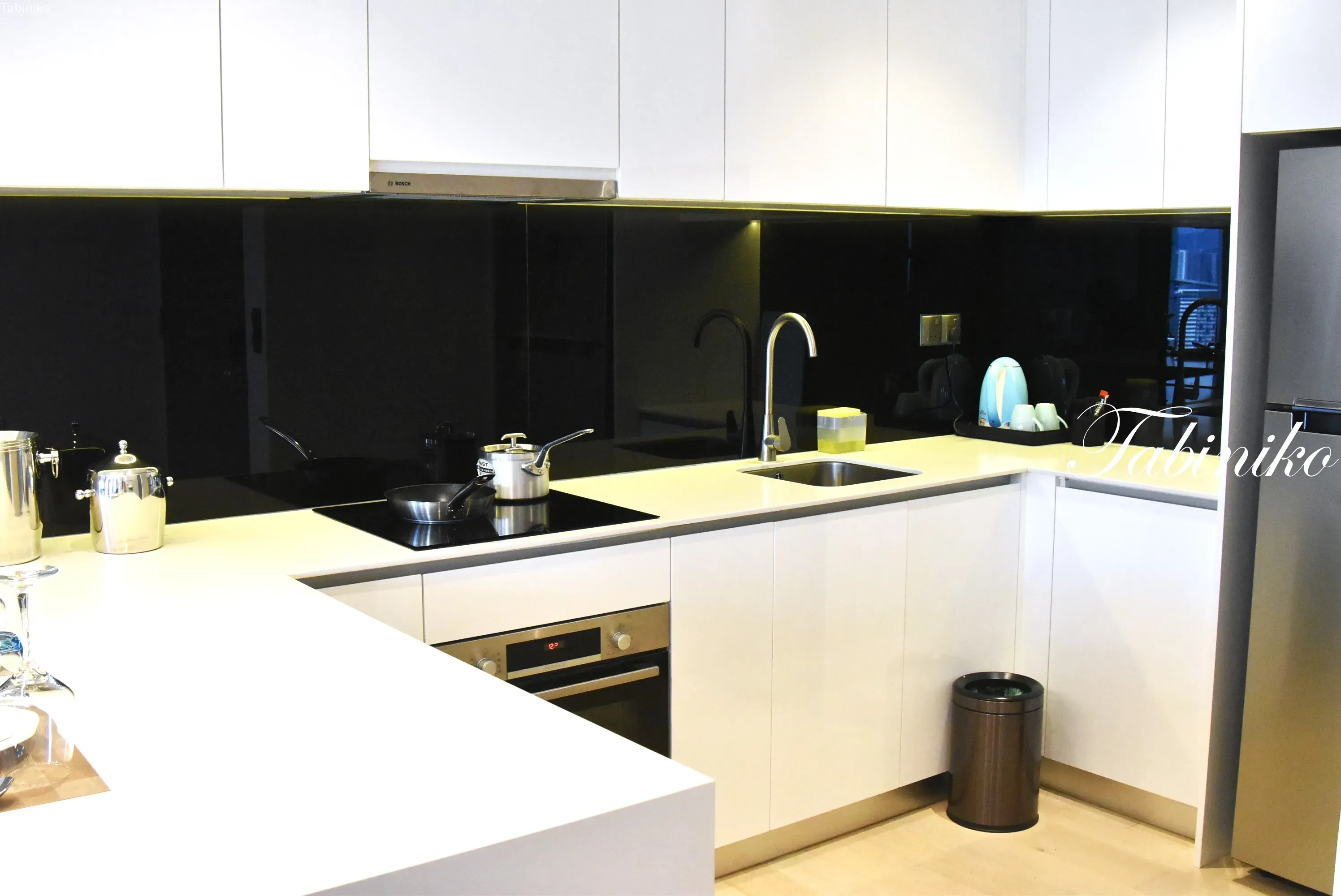 The kitchen is spacious with a counter. The wider it is, the easier it is to cook.