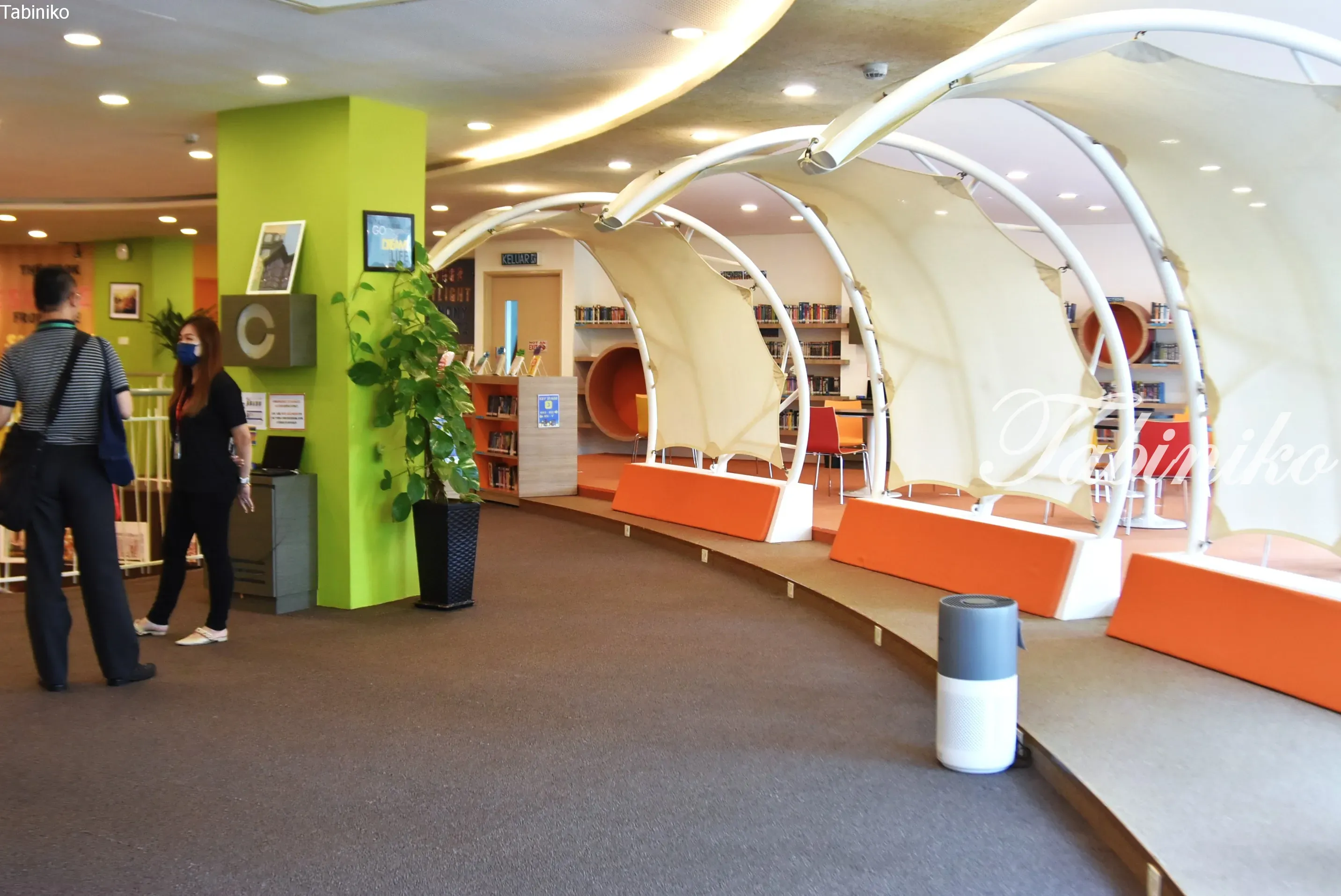 The library has both a first and second floor, filled with many books. It features study areas as well as spaces where you can relax and read, creating a comfortable atmosphere.