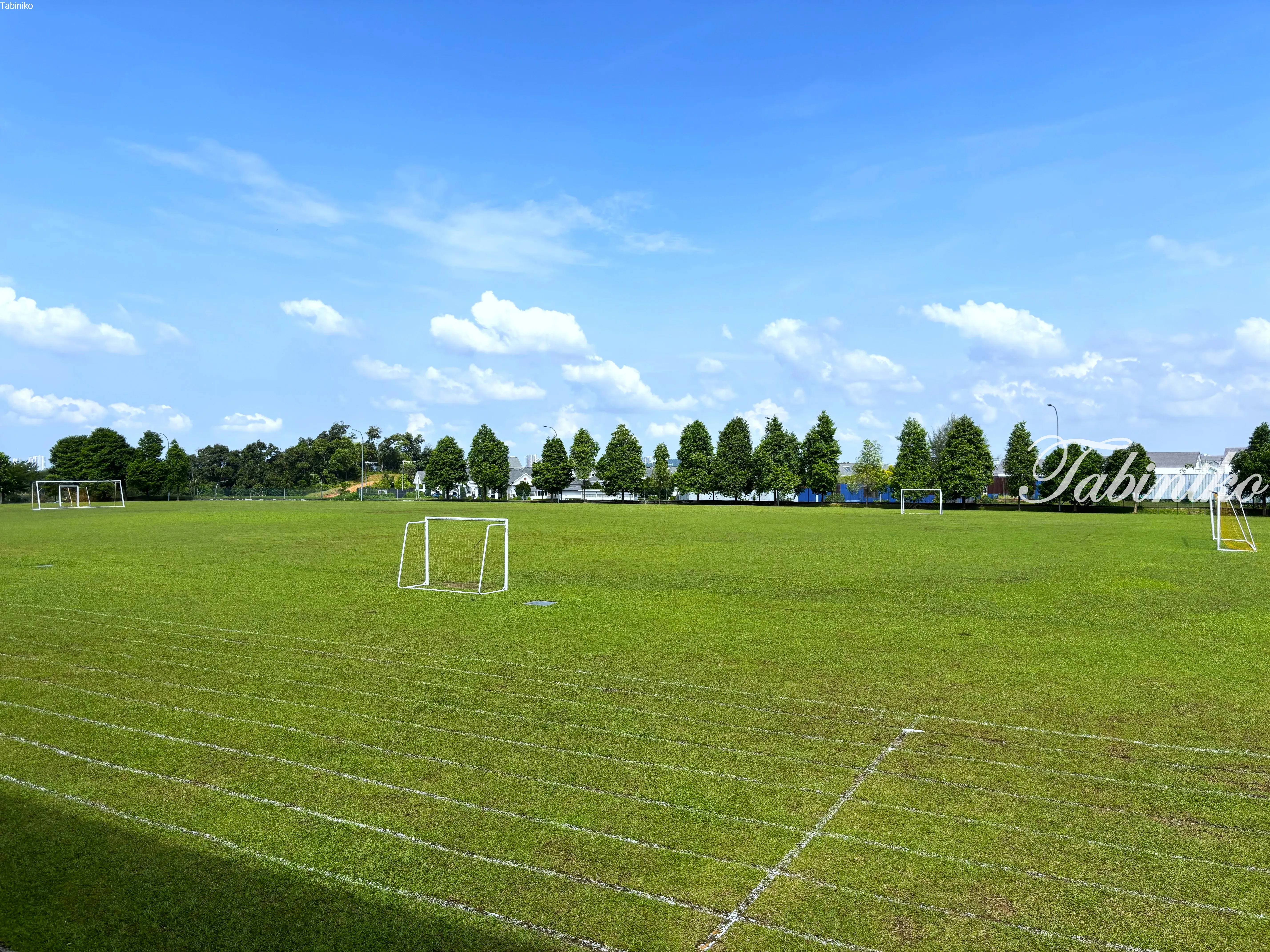 The vivid green grass, blue sky, and surrounding trees create a picture-perfect scene. It must feel amazing to play soccer on such a huge field! (#^.^#)The ground is so vast that the soccer goals actually look small in comparison!(≧▽≦)