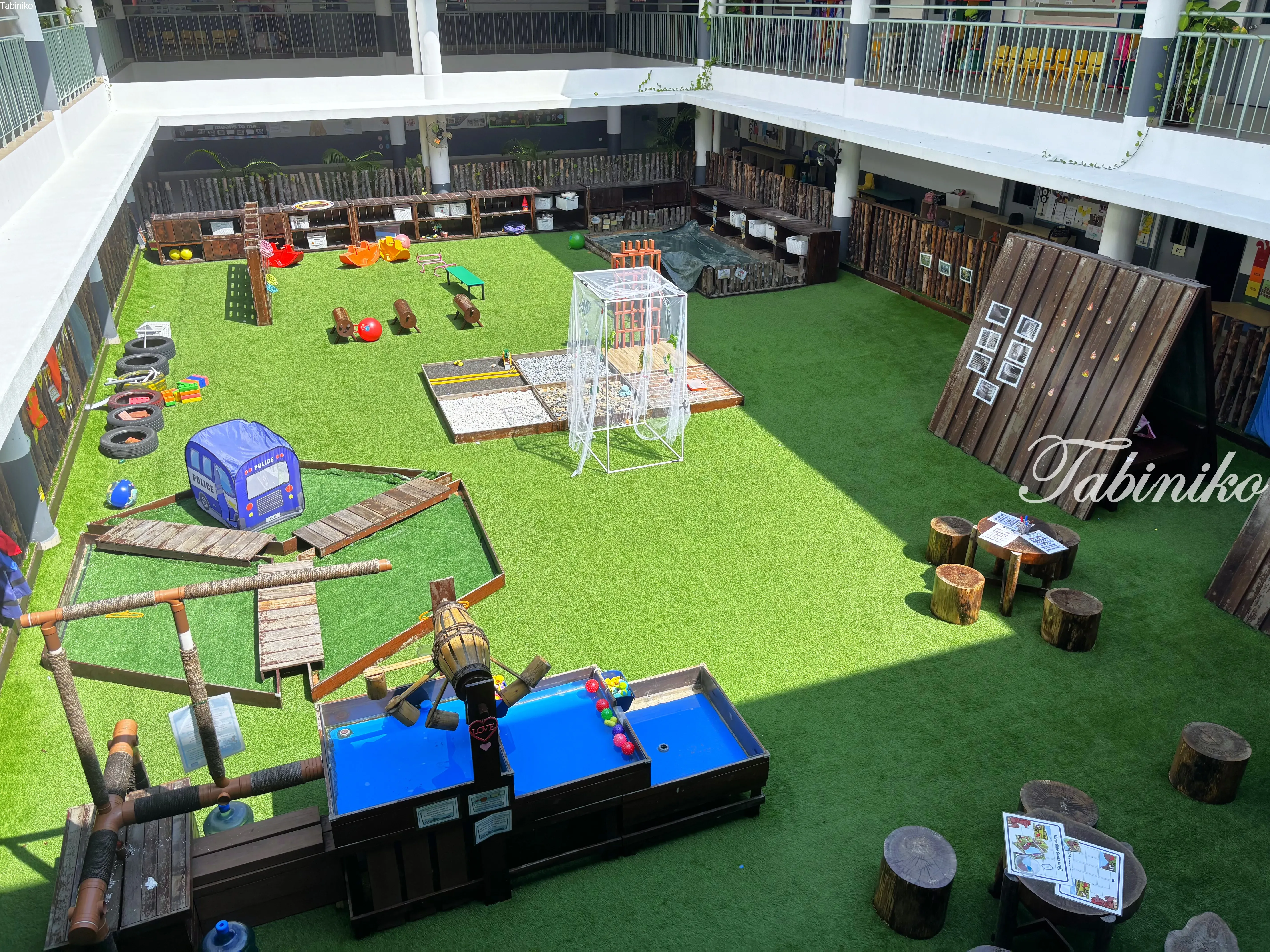 This is the playground in the school courtyard. It has various equipment for water play, sand play, and more.