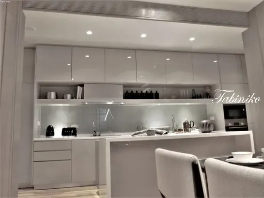 It is integrated with the kitchen, dining room, living room, and balcony, and the flow line is straight, simple and smart. The kitchen has a cabinet + sink + oven + microwave + refrigerator. The cabinet extends to the ceiling and has a large storage space.
