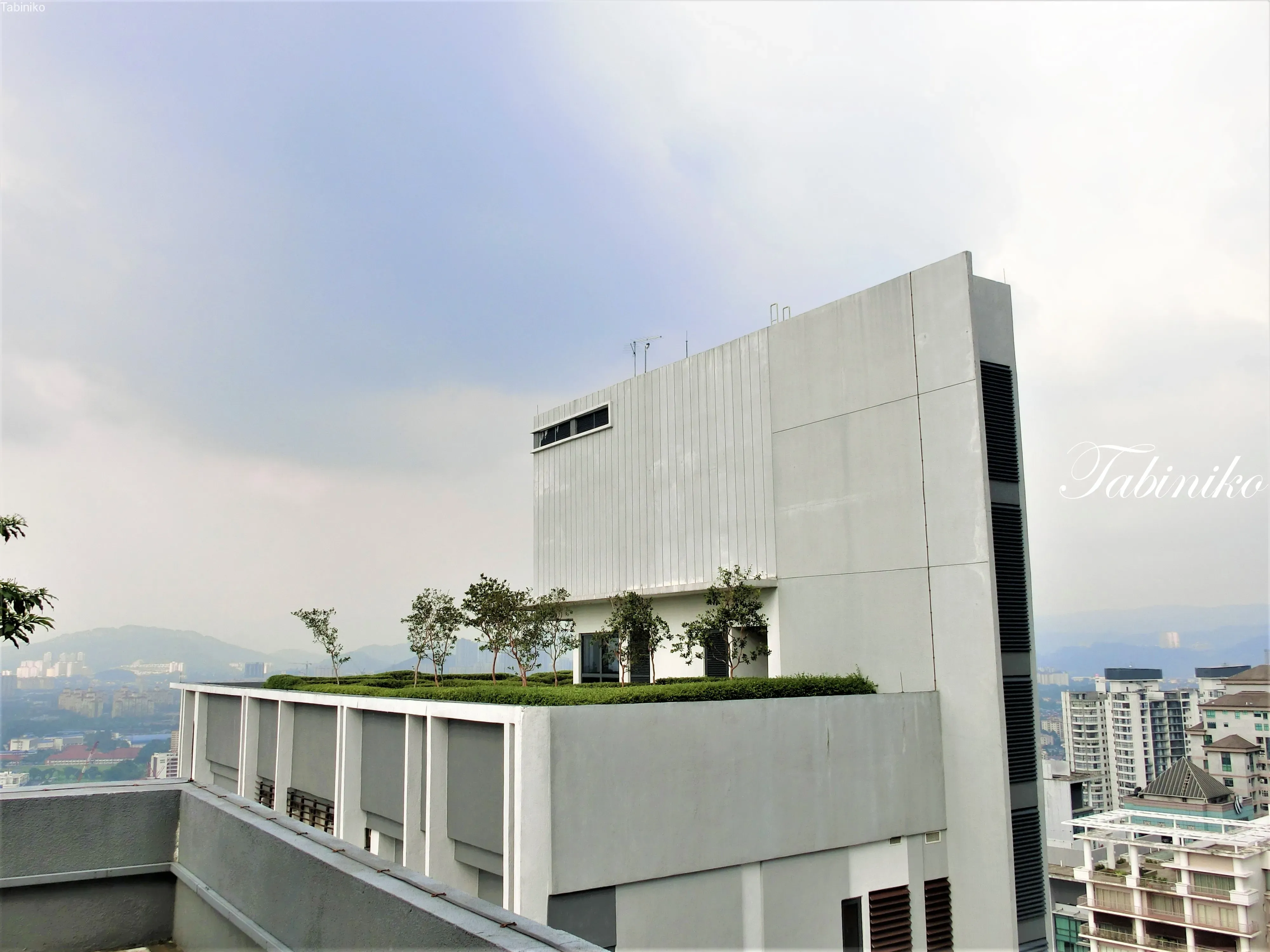 Welcome to the Sky Garden on the 38th floor! You can take photos with the Twin Towers as a backdrop. The Sky Garden is located on the top floors of Tower A and Tower B, and it is a lush, green park in the sky!