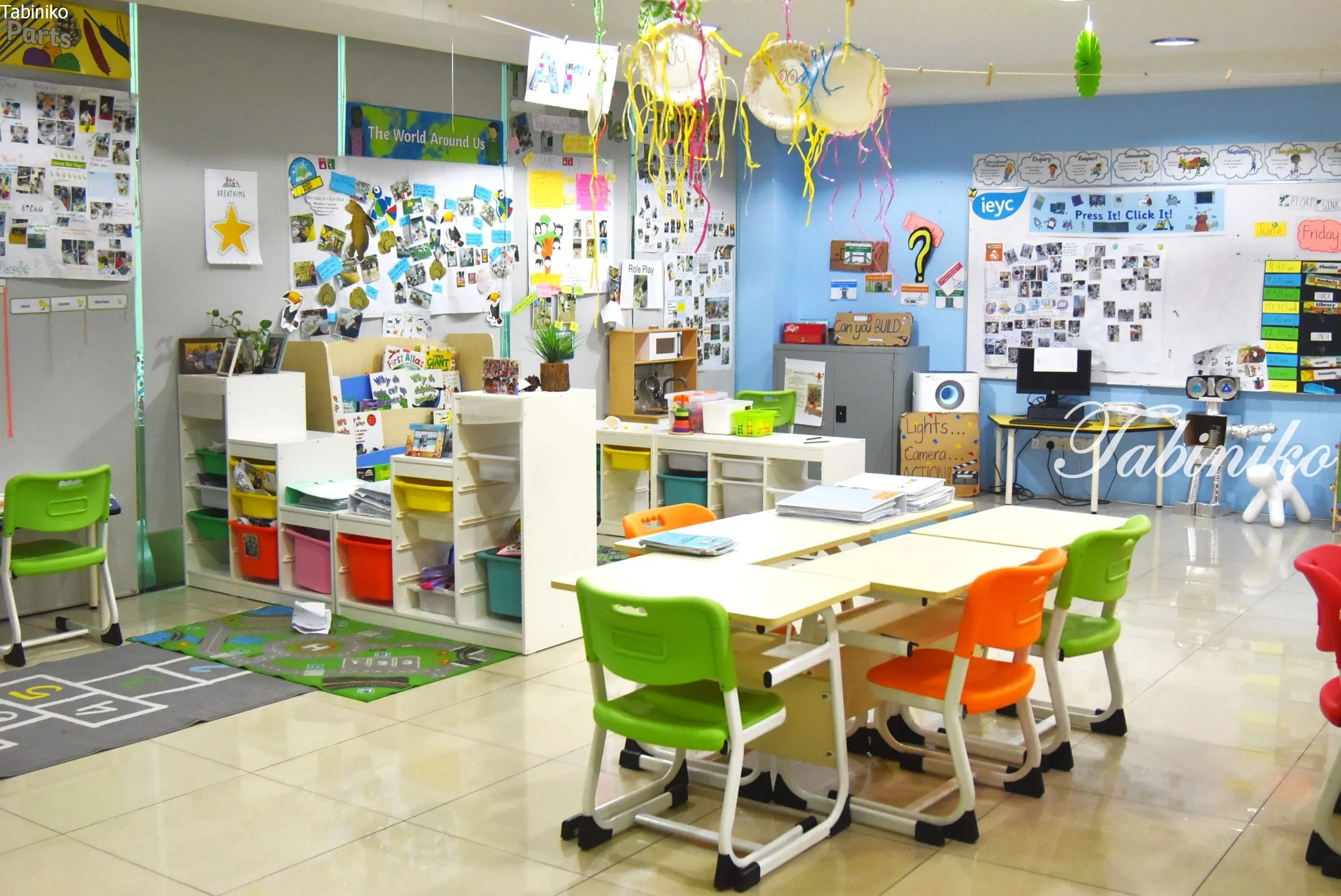 The walls and chairs are bright and colorful, which makes them fun to look at! At my son’s preschool, the desks are set up in a circle for group discussions, and their design is really well planned.