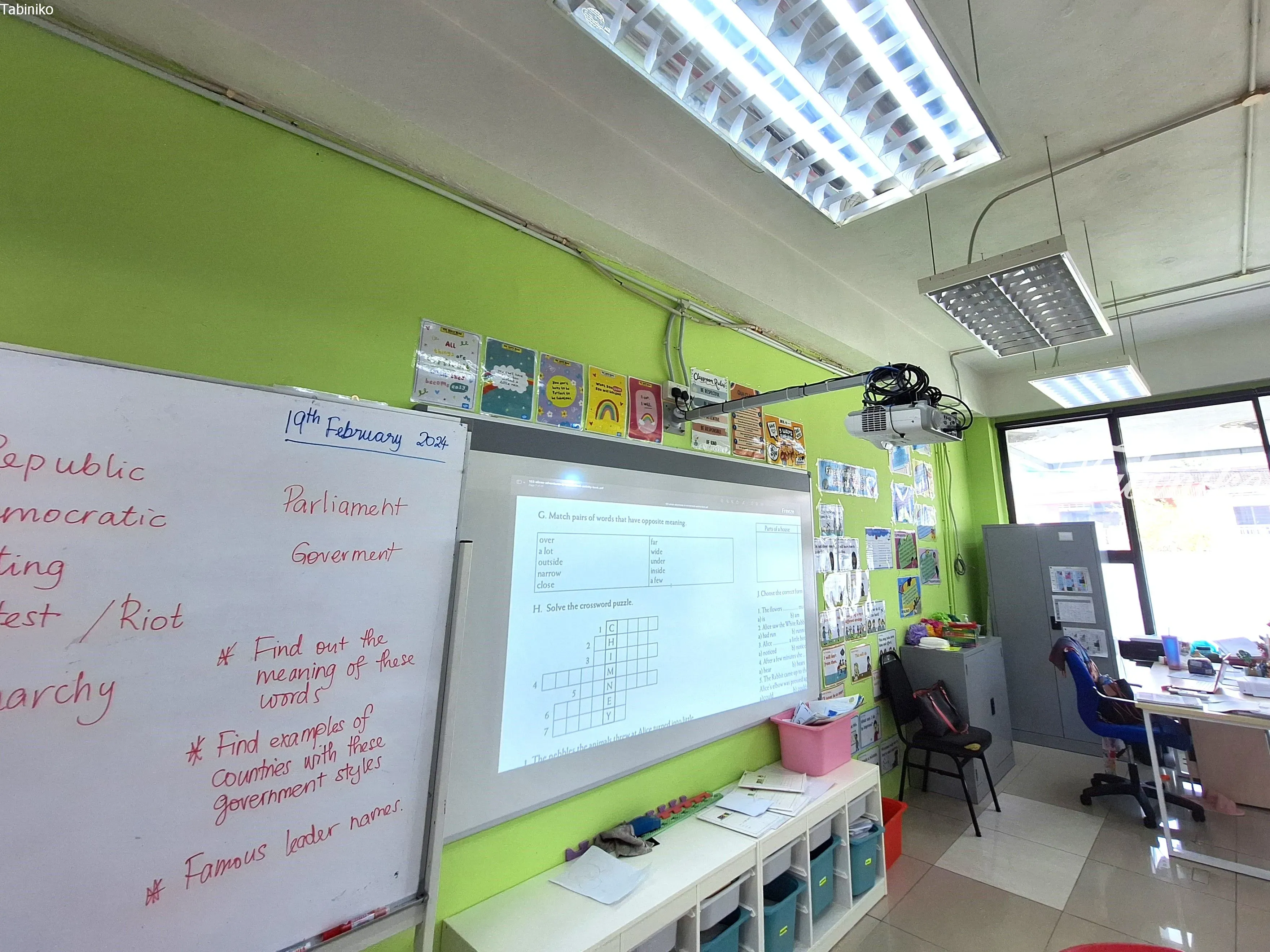 The light color walls and the large windows make the classroom very bright.