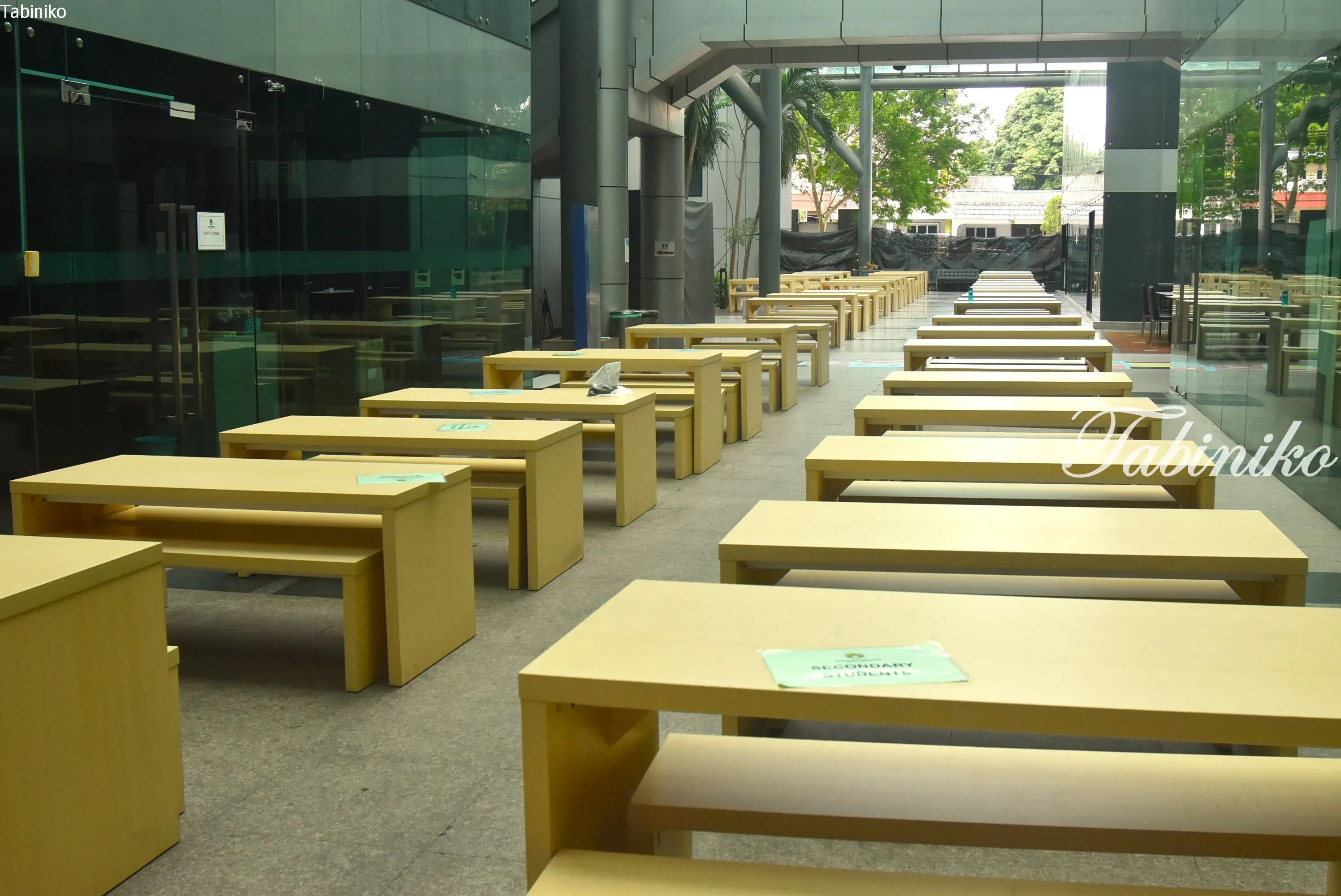 The cafeteria features an open ceiling, making it bright and airy. It also has a large ceiling fan.