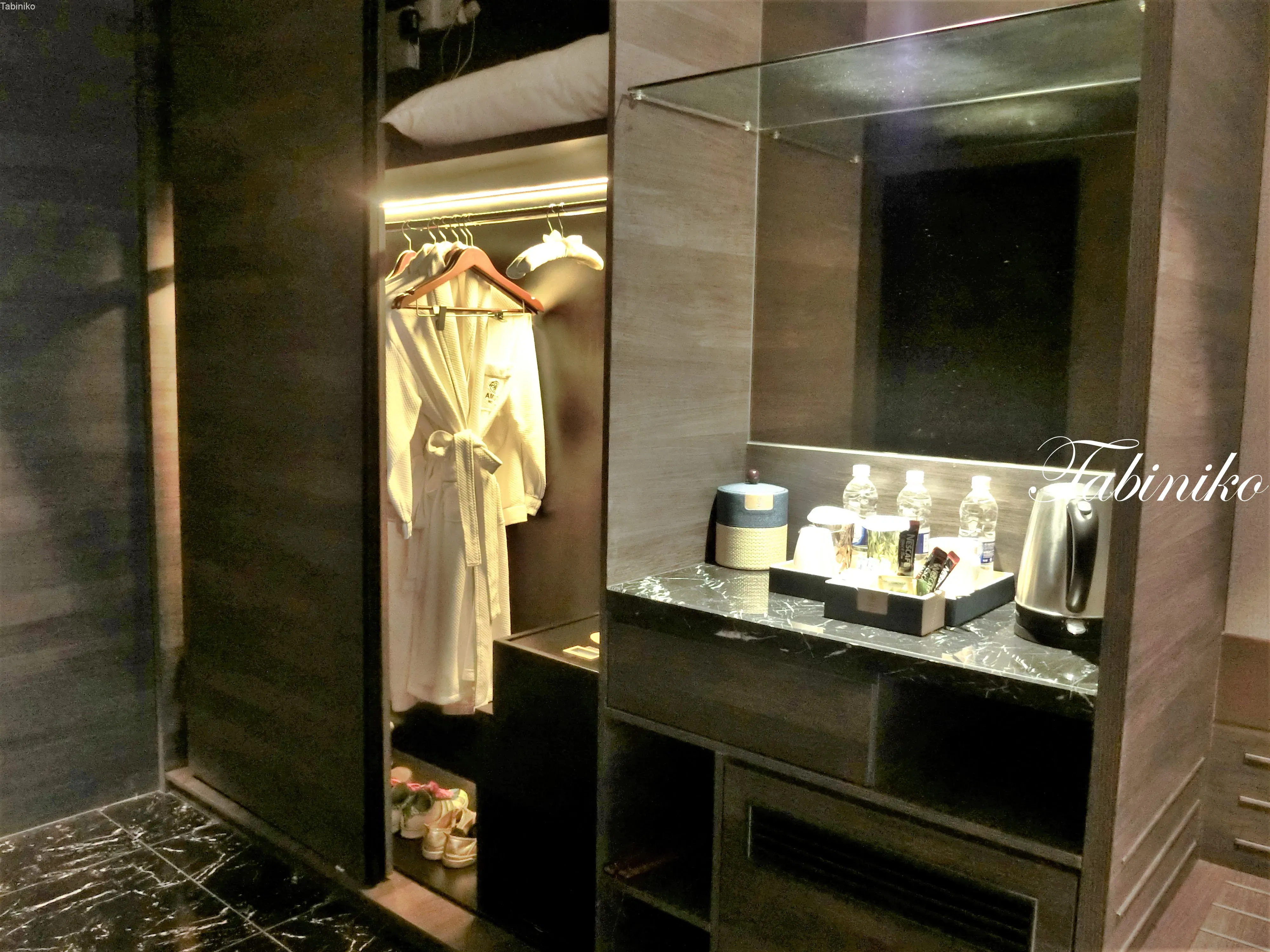 クローゼット、冷蔵庫、電気ポット、水、コーヒー、お茶のティーパックなども揃ってます。