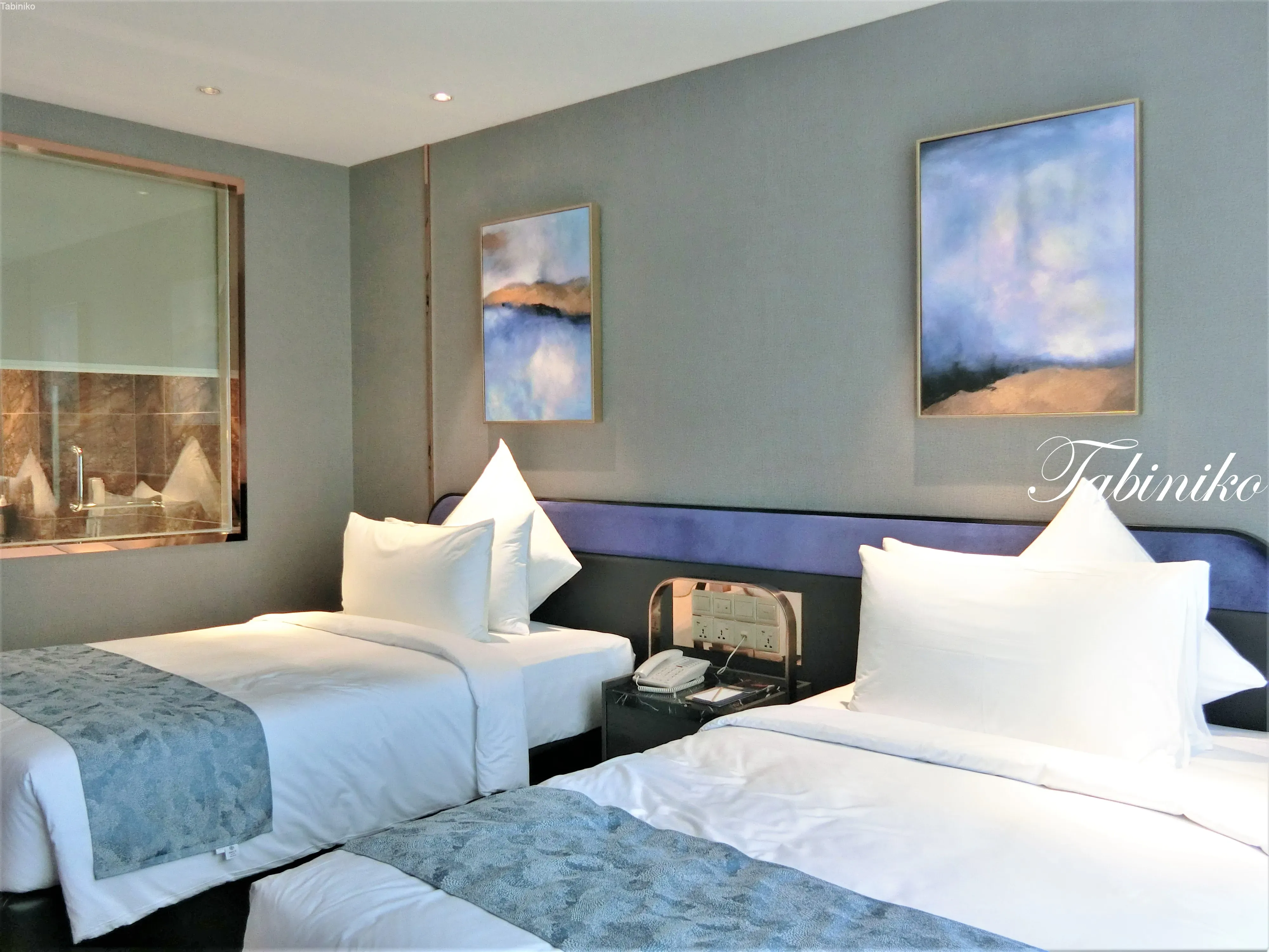 (2)Deluxe Twin Room デラックスツインルーム。2人まで。シングルベッド2台、無料WiFi