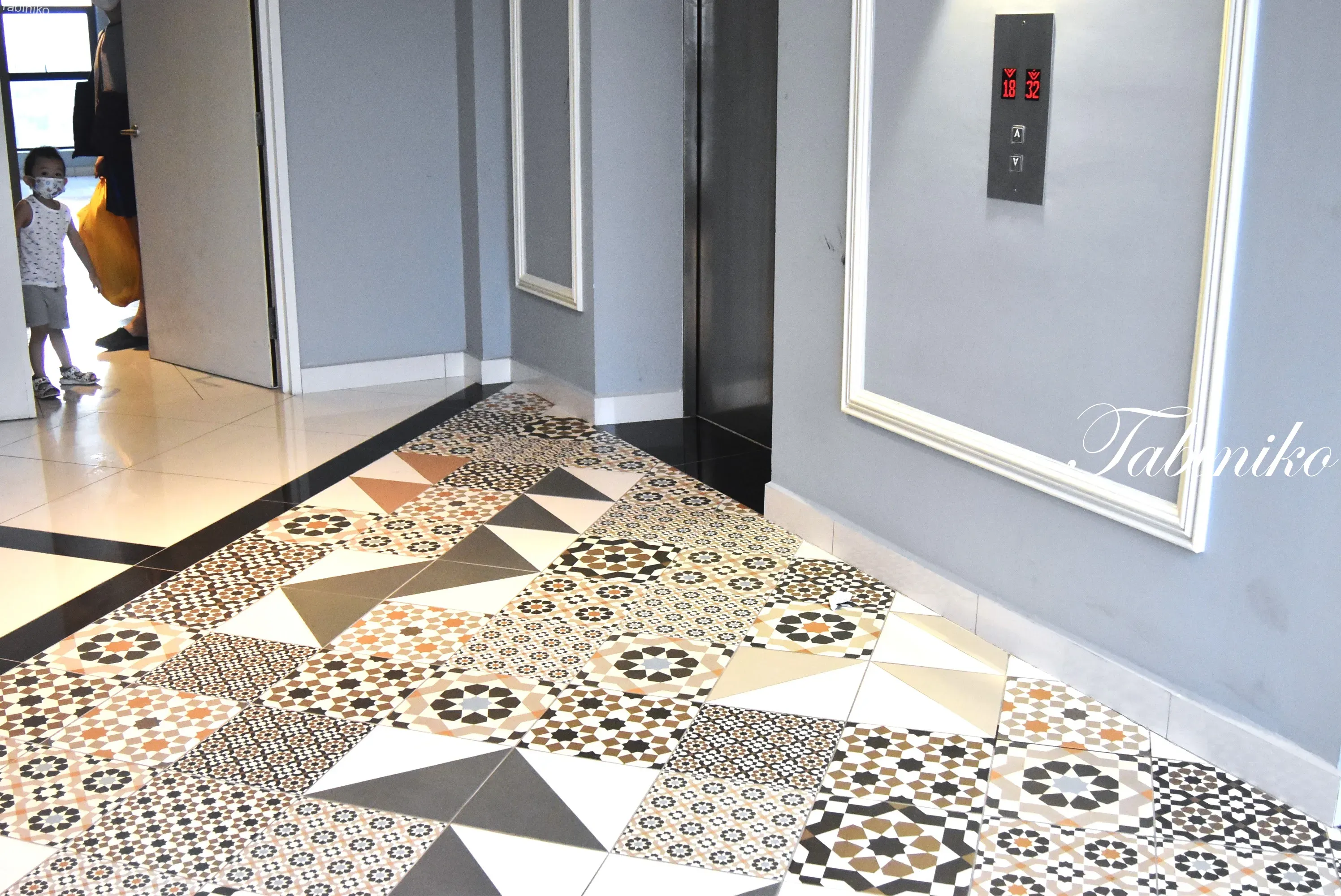 コンド内は色んな所がおしゃれにデザインされています。例えば廊下。モザイクのモダンなデザイン。