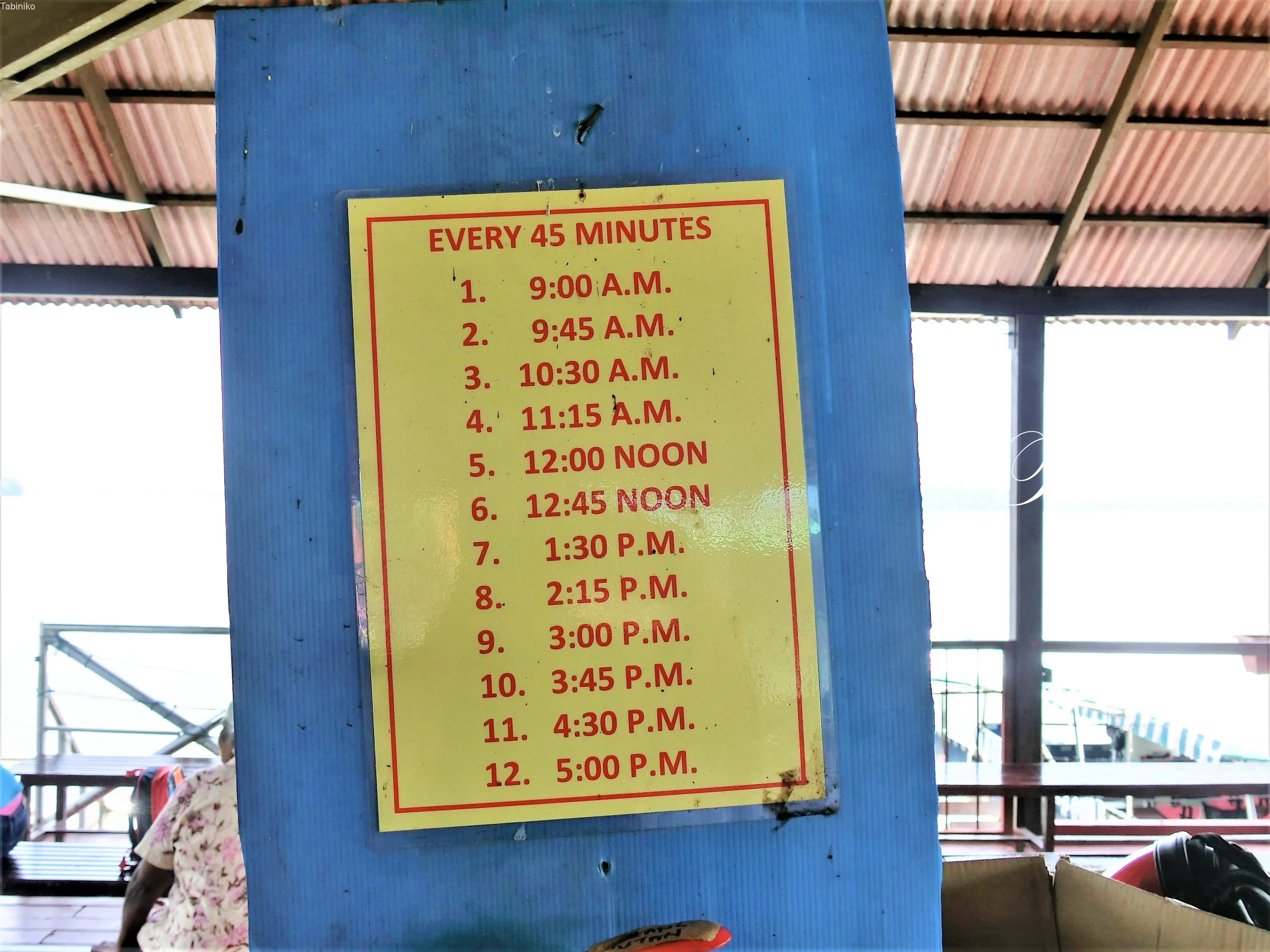 船は朝9時から45分おきに出ていますが、便数は多くはないです。 私たちのようにタイピン(Taiping)方面へ旅行する場合は、時間を無駄にしないためにも、必ず事前に時刻を確認することをおすすめします。