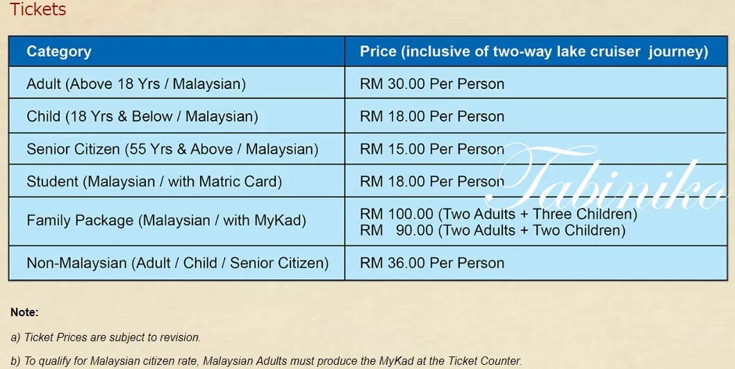 外国人(大人子供シニア)RM36 マレーシア人大人RM30 マレーシア人子供RM18(2018年9月現在)