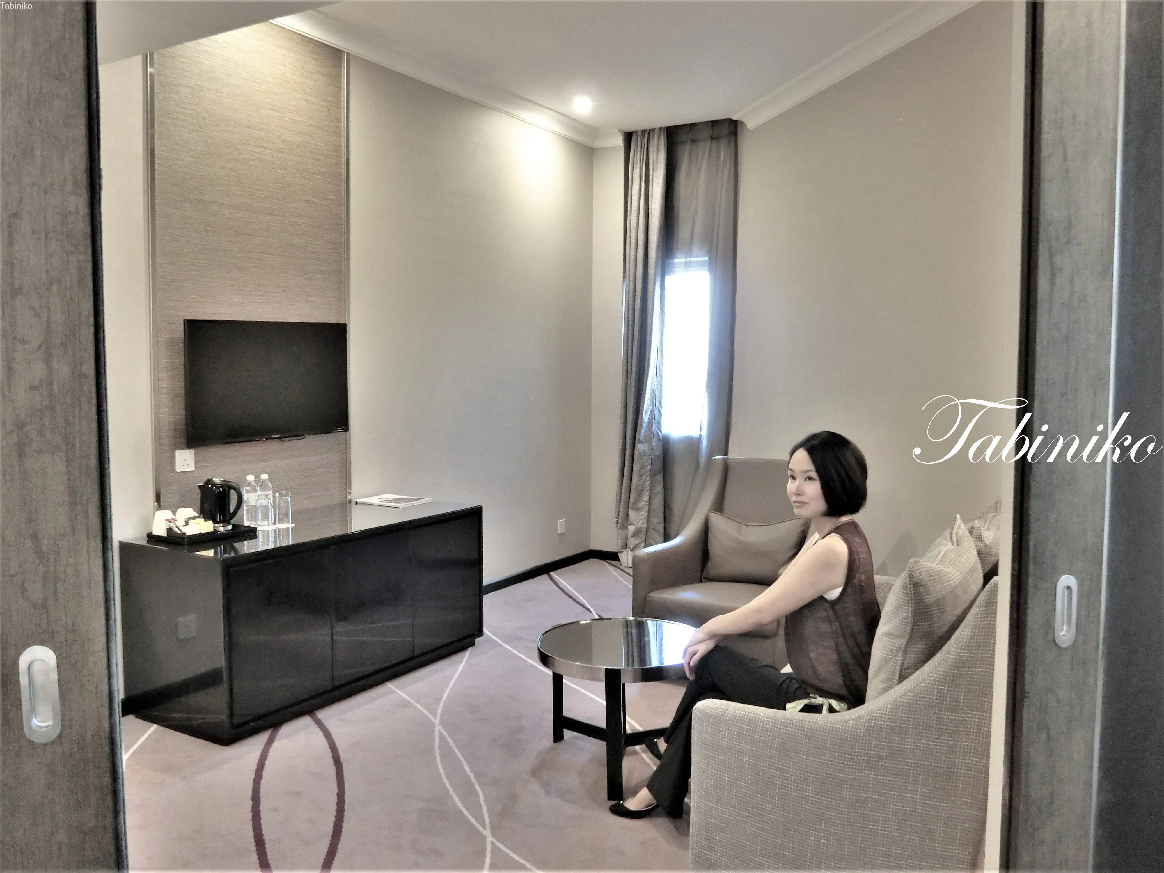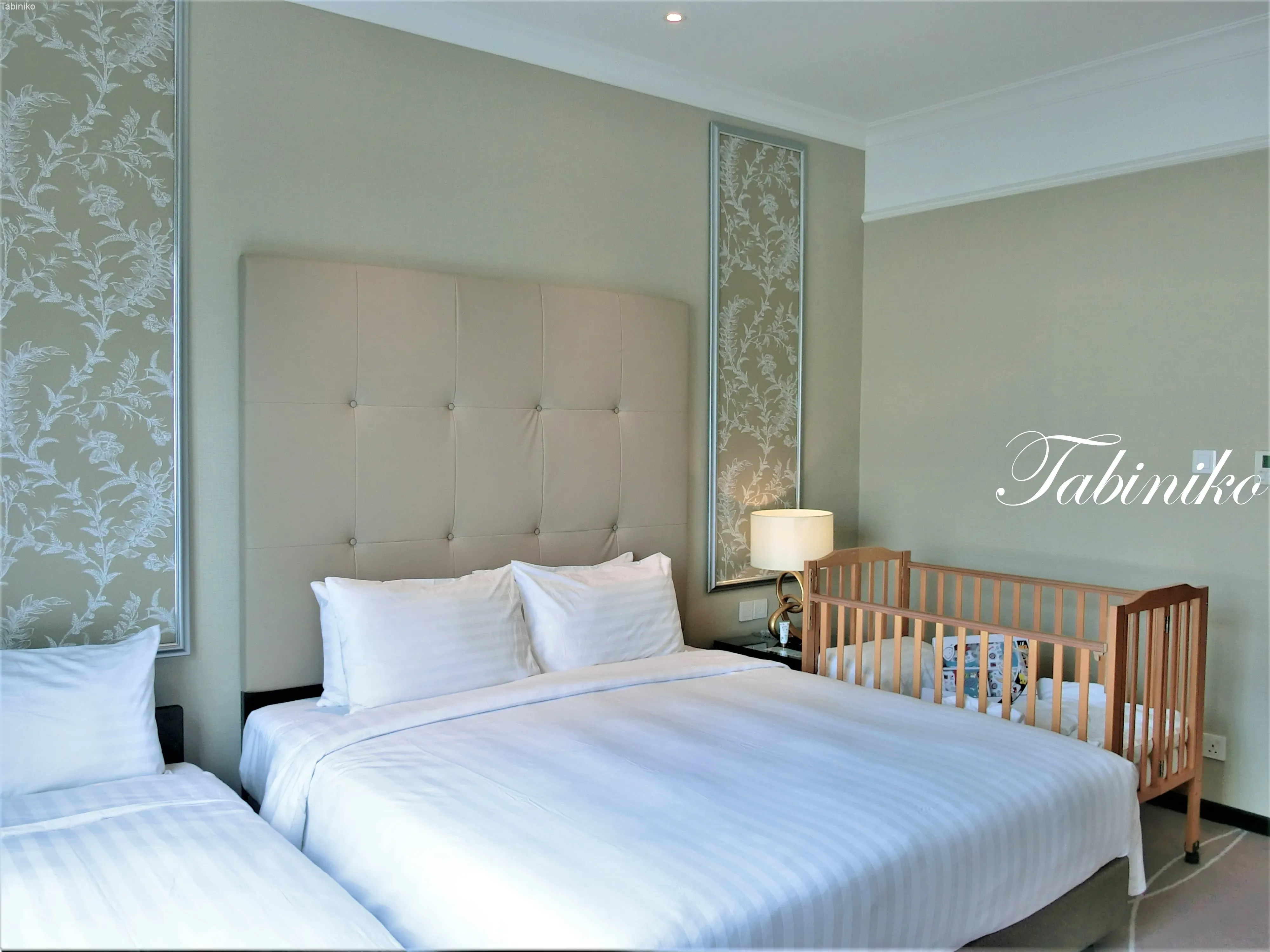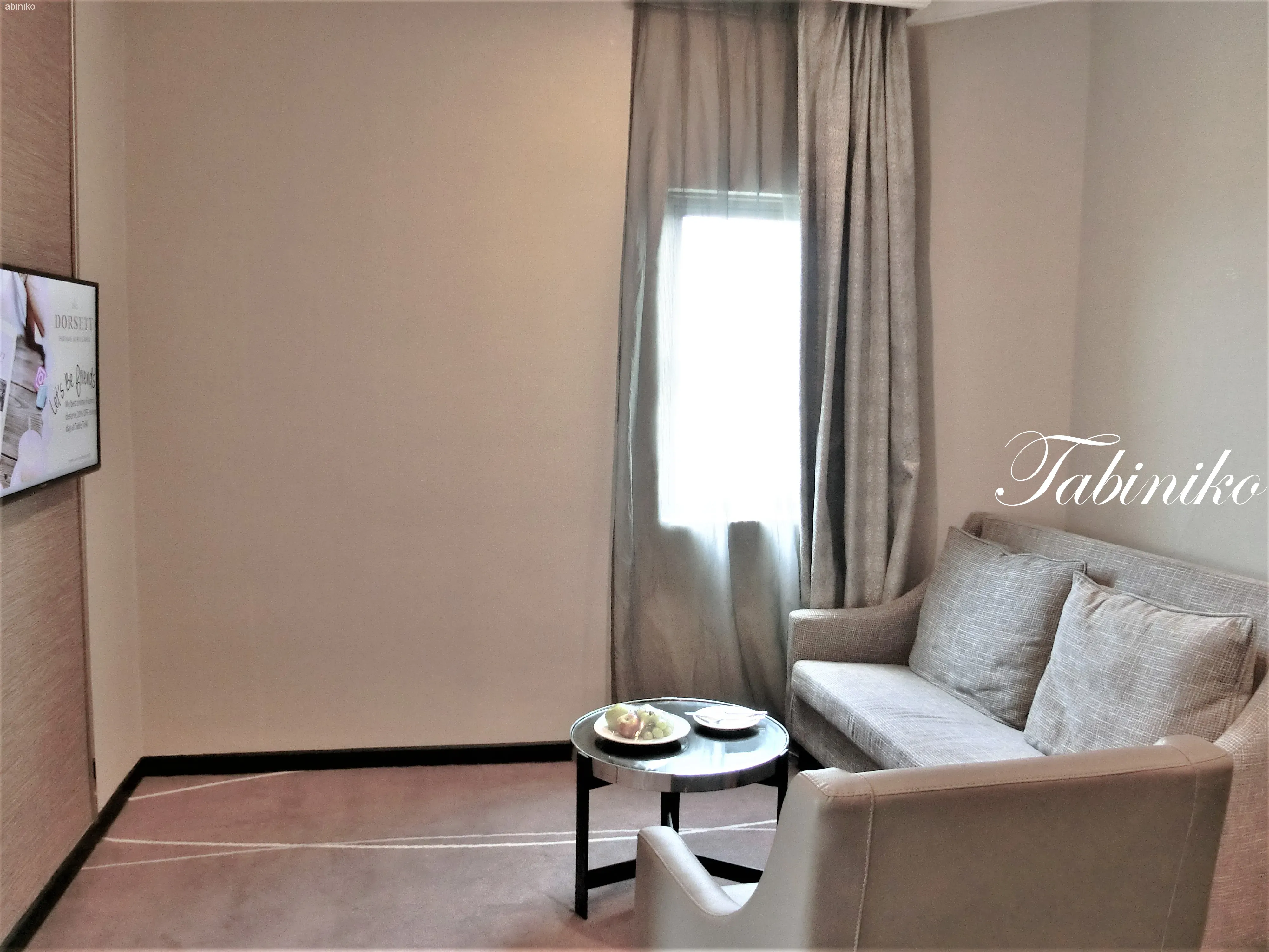 今回泊まったドーセットスイートです。通常のキングサイズベットに追加してエキストラベット、ベビーベットも入れてもらいました。小さい子供がいる私にとって、この配置はベリーグッド!!!で、子供が夜泣きしたら奥にソファーがあり、そこでミルクを飲ませたり、オムツを変えたり出来ます。