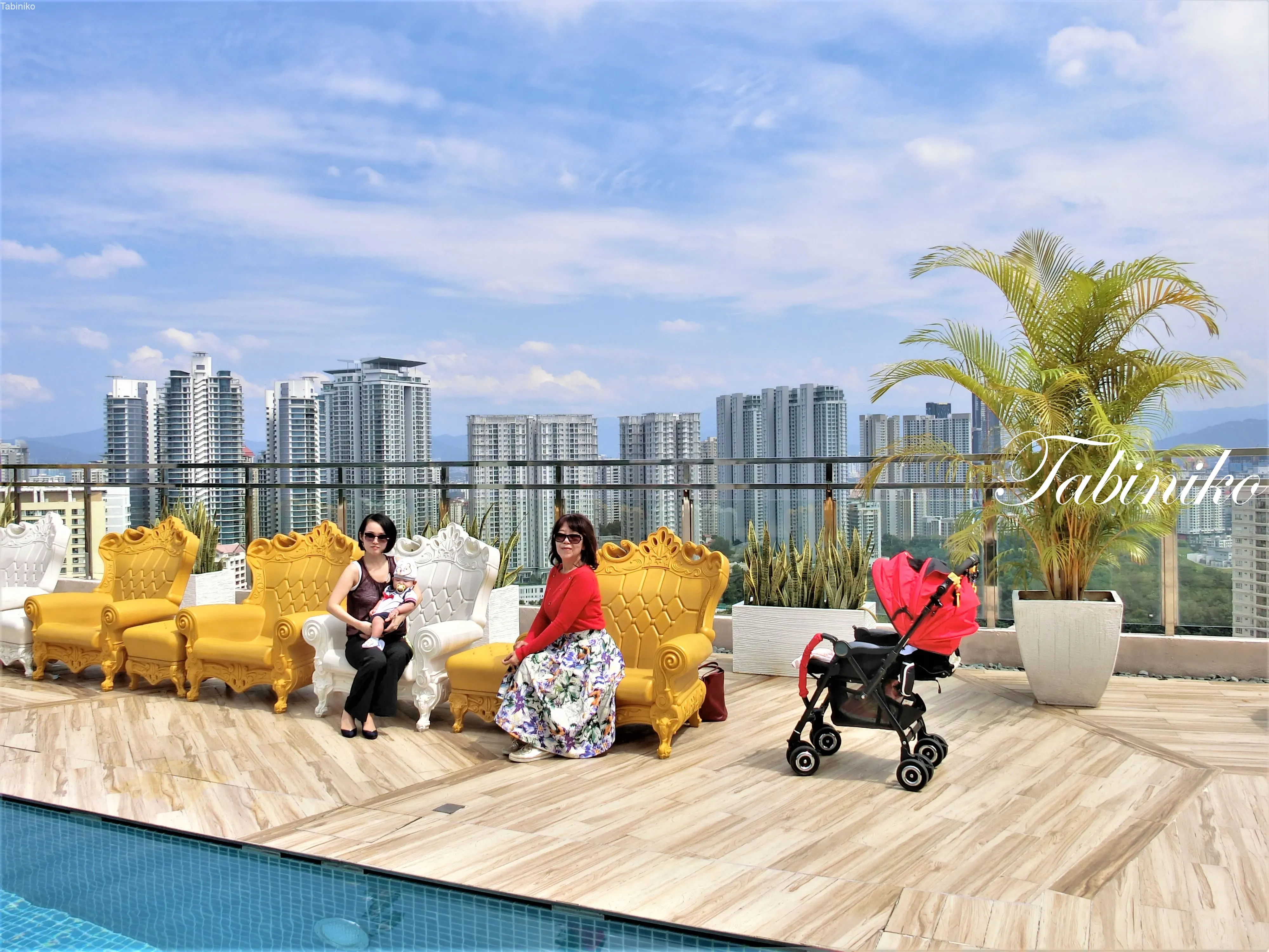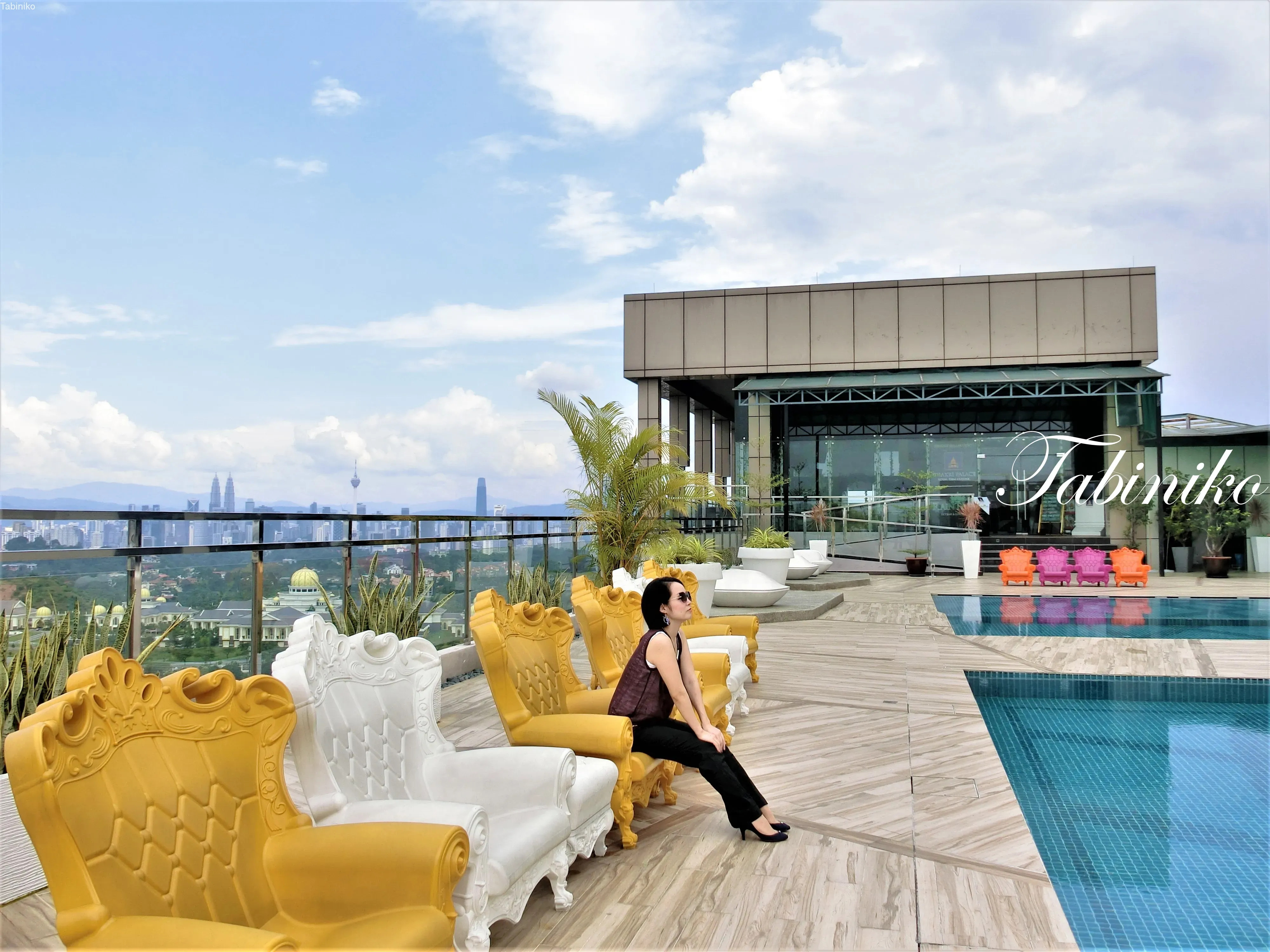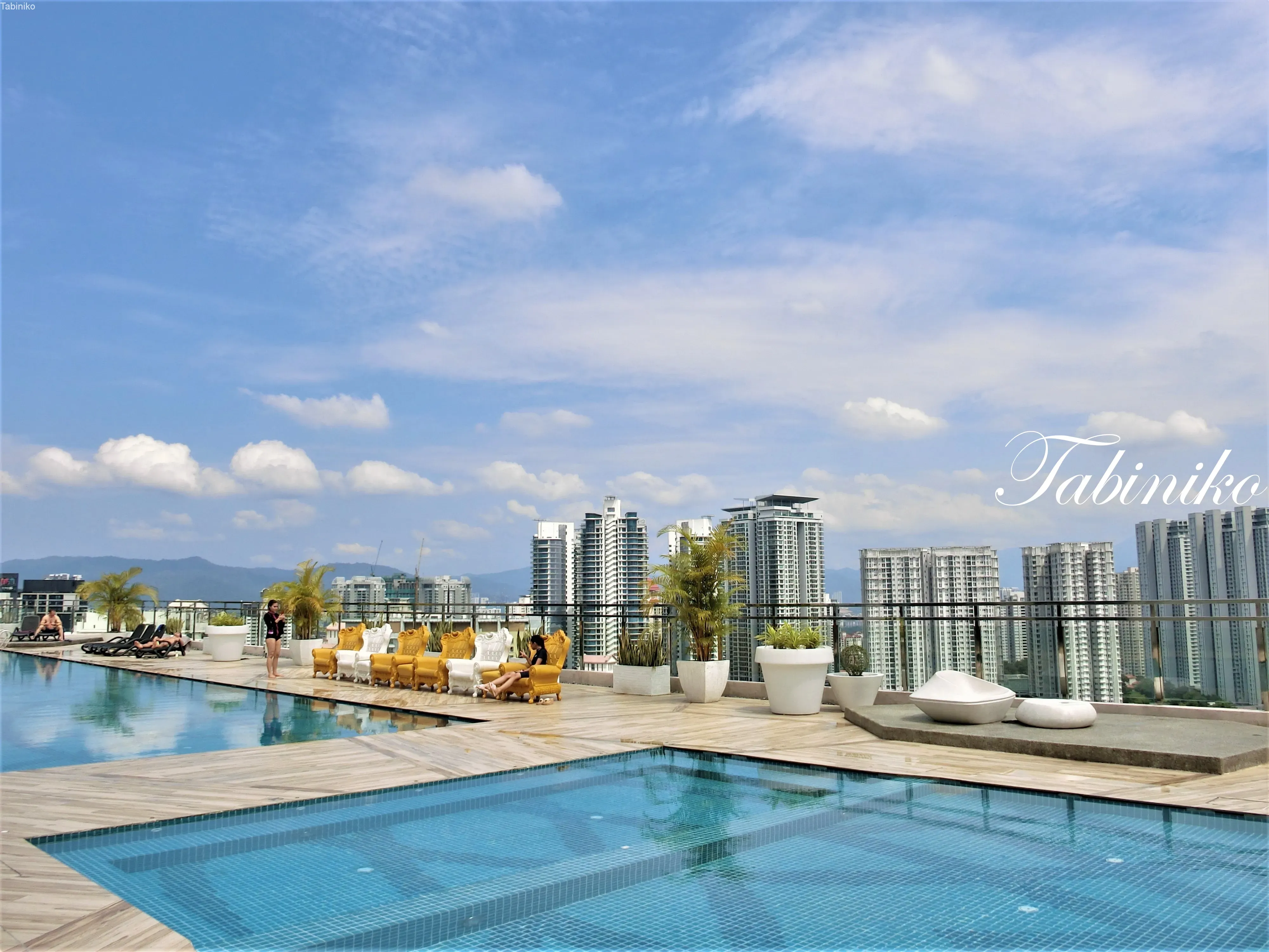 ホテルの屋上にあるプールからは皇居とその奥にはクアラルンプール市内のビル群が一望!!皇居の周りはグリーンが多いので癒されます。大きな青空の下で太陽を浴びながらのプールは気持ちいいです。大人用のプール、子供用のプール、ジャグジープールもあります。カラフルな王様のような椅子と素晴らしいシーティービューはインスタバエに超最適!