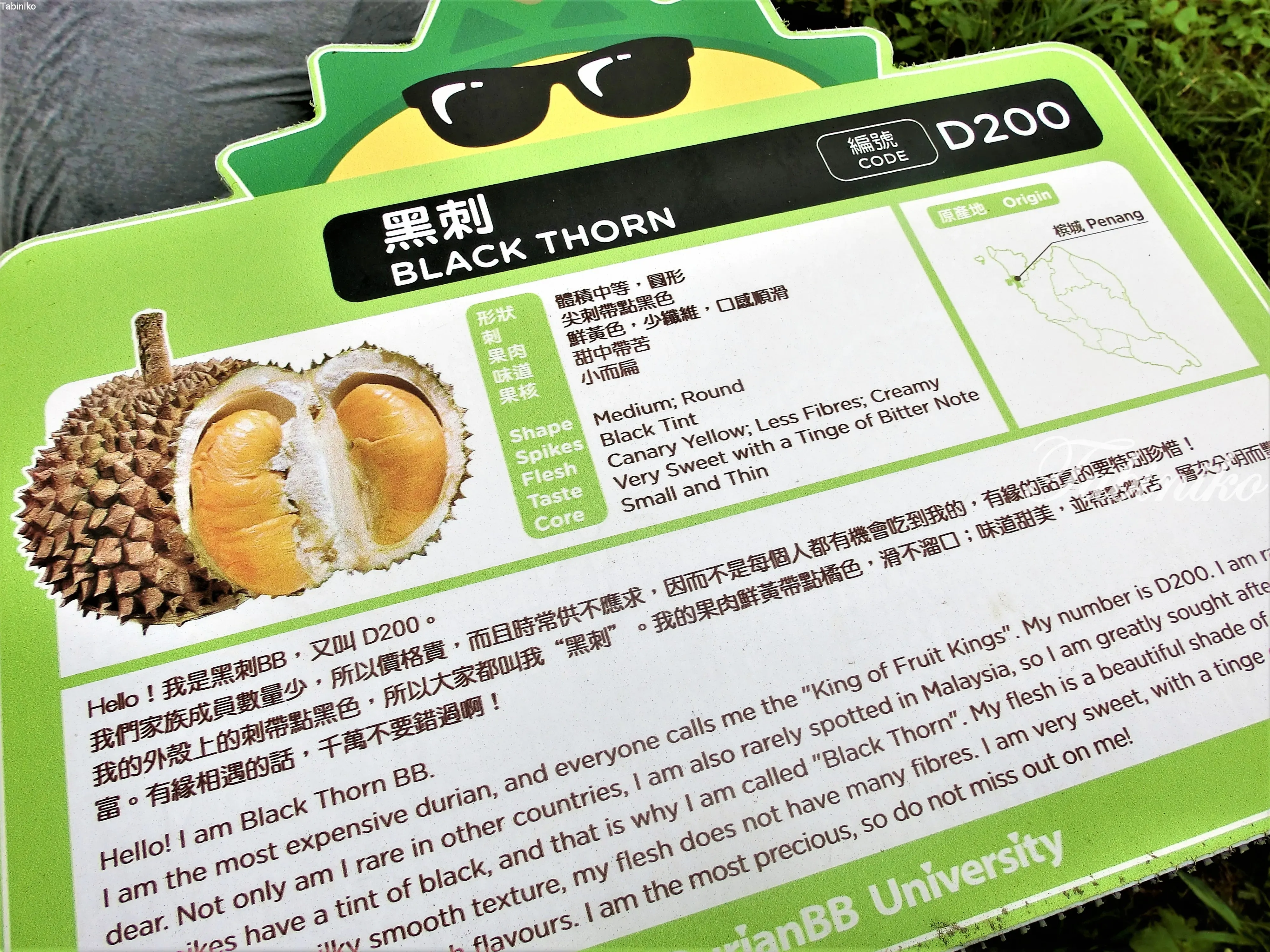 こちらは、若手教授のPaul Yee さんです!ドリアンのことを全部教えてくれます。こちらの農園には約300本のドリアンの木があり、樹齢が30年以上経っています。10エーカー(acres) の農園で、主に4種類のドリアンがあり、黒刺「Black Thron, code:D200」、竹脚「Tekka, code:D160」、山頂XO「XO, code:D24」、猫山王「Musang King, code:D197」があります。ほかの農園から違う種類のドリアンを運んでくる場合もあるといいます。季節によって食べられない種類もありますが、黒刺以外は大抵食べられます。黒刺は幻のドリアンで、数が少ないので猫山王より高いんだとか。私が入学した日はなかったため食べられませんでしたが、その代わり、猫山王をお腹一杯食べ過ぎてしまいました。。。幸せ!