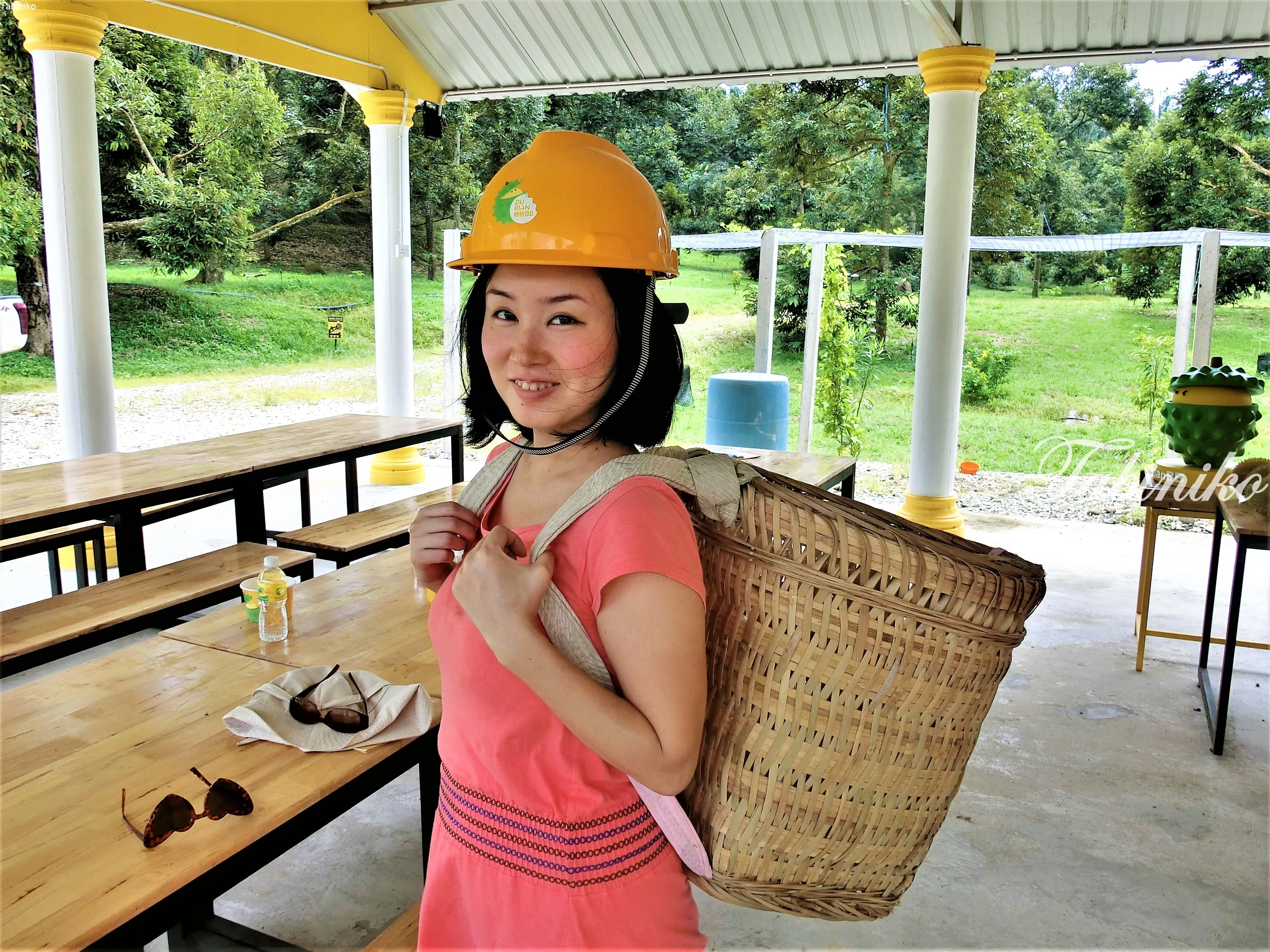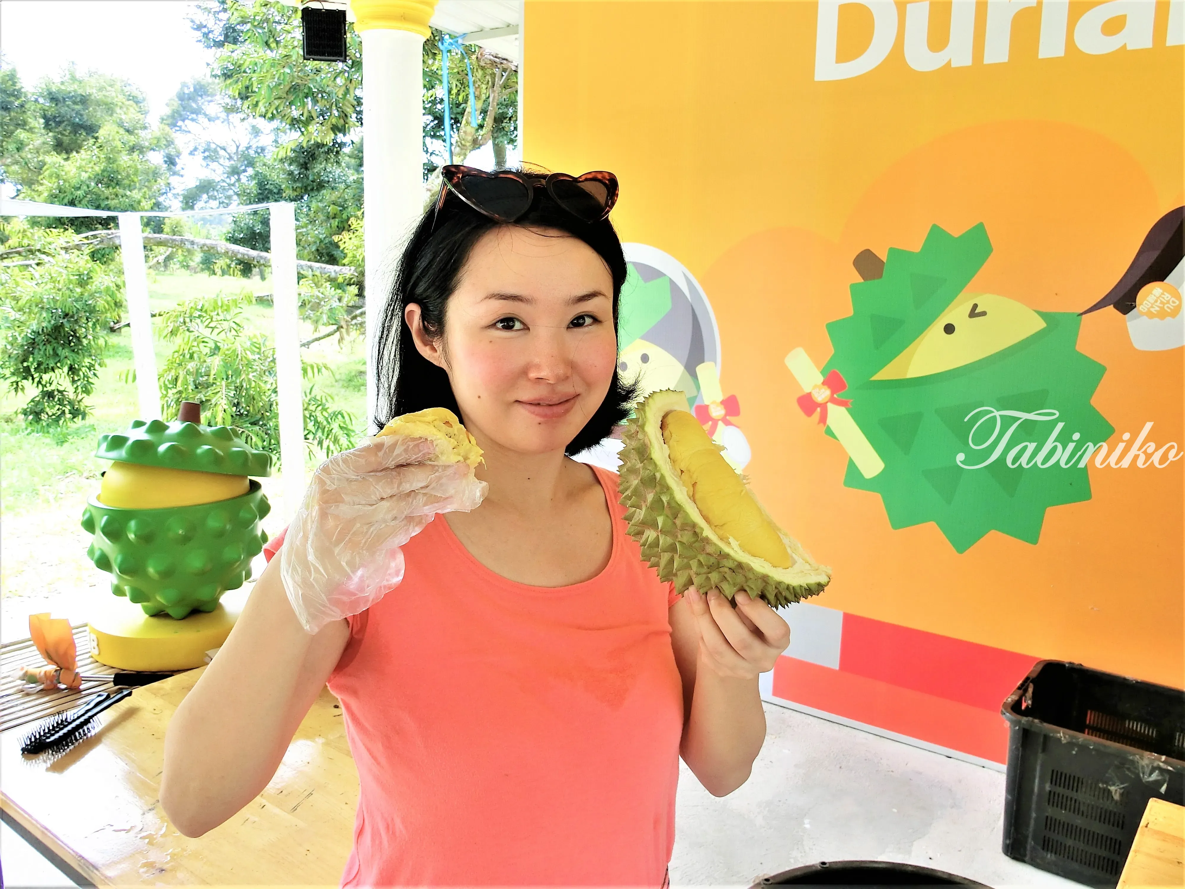 DurianBB ファームに着いたらこのような格好に変身し、自然に木から落ちているドリアンを拾っていきます。これはマレーシア流のドリアンを食べる方法。タイのドリアンは、人が木に登って採るのが一般的らしく、マレーシアと対照的ですね。