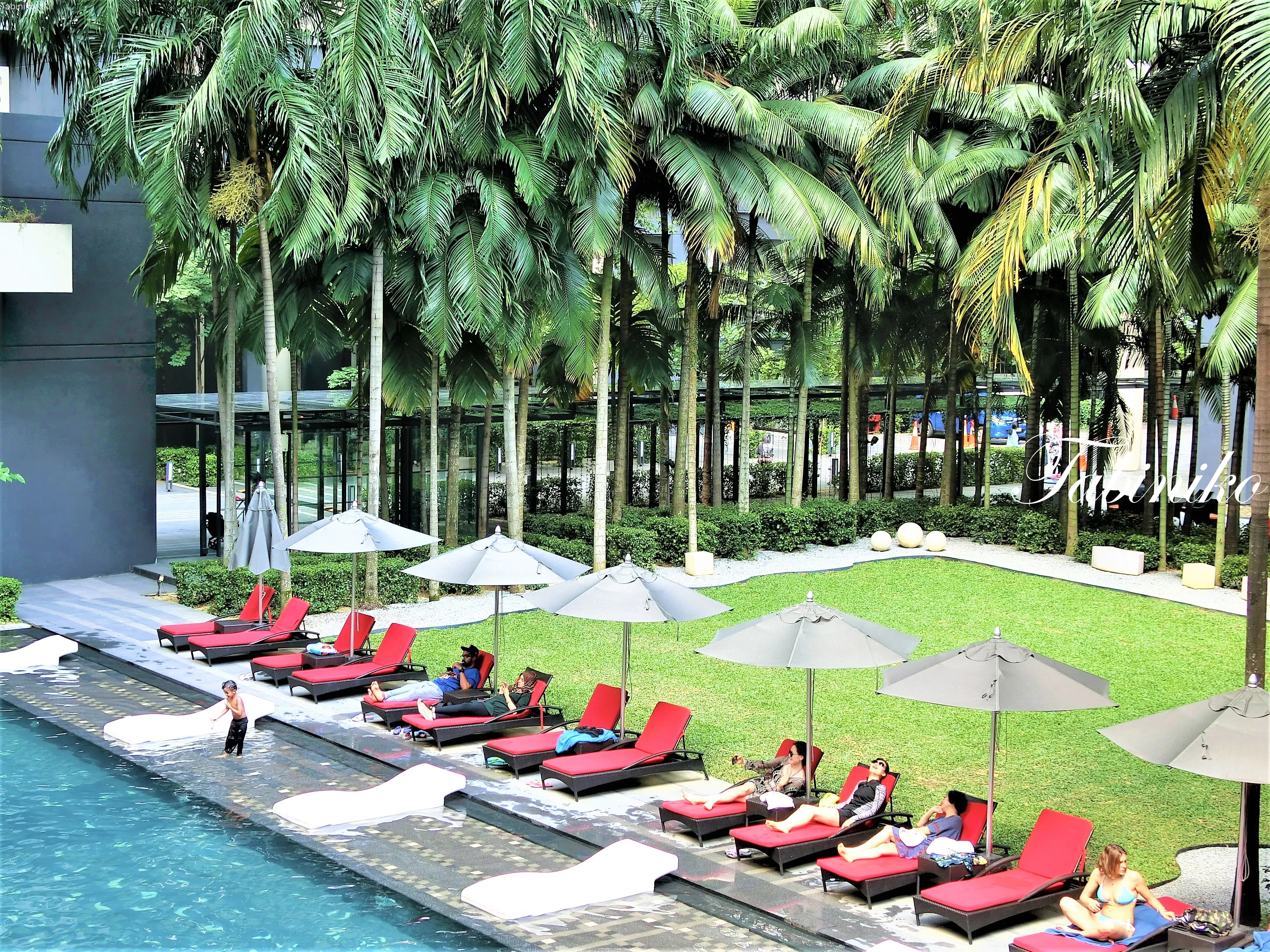 施設内はグリーンが多く癒されます(#^.^#)クアラルンプールの中心地なのにグリーンがいっぱーい!さすが南国!プールサイドにヤシの木!ツインタワーも眺めることが出来ます。