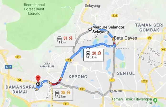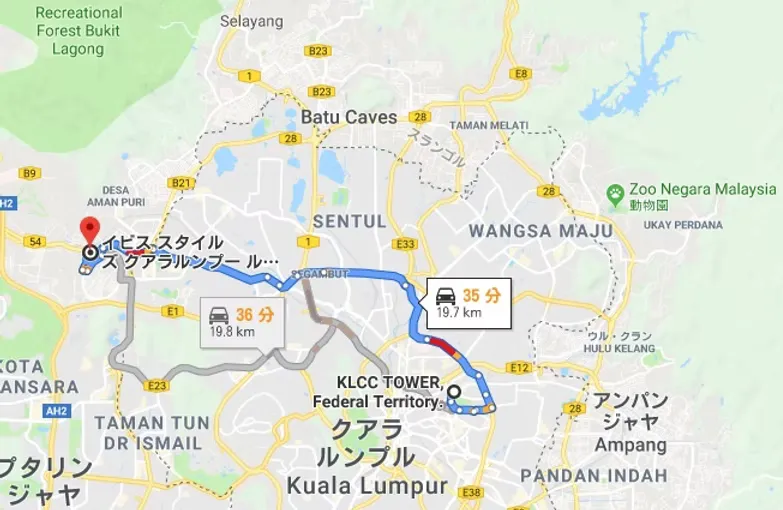 ・ツインタワー KLCCやブッキ・ビンタン(Bukit Bintang)などの繁華街までは車で約30分から40分。ちなみに下記は両ホテルの距離: