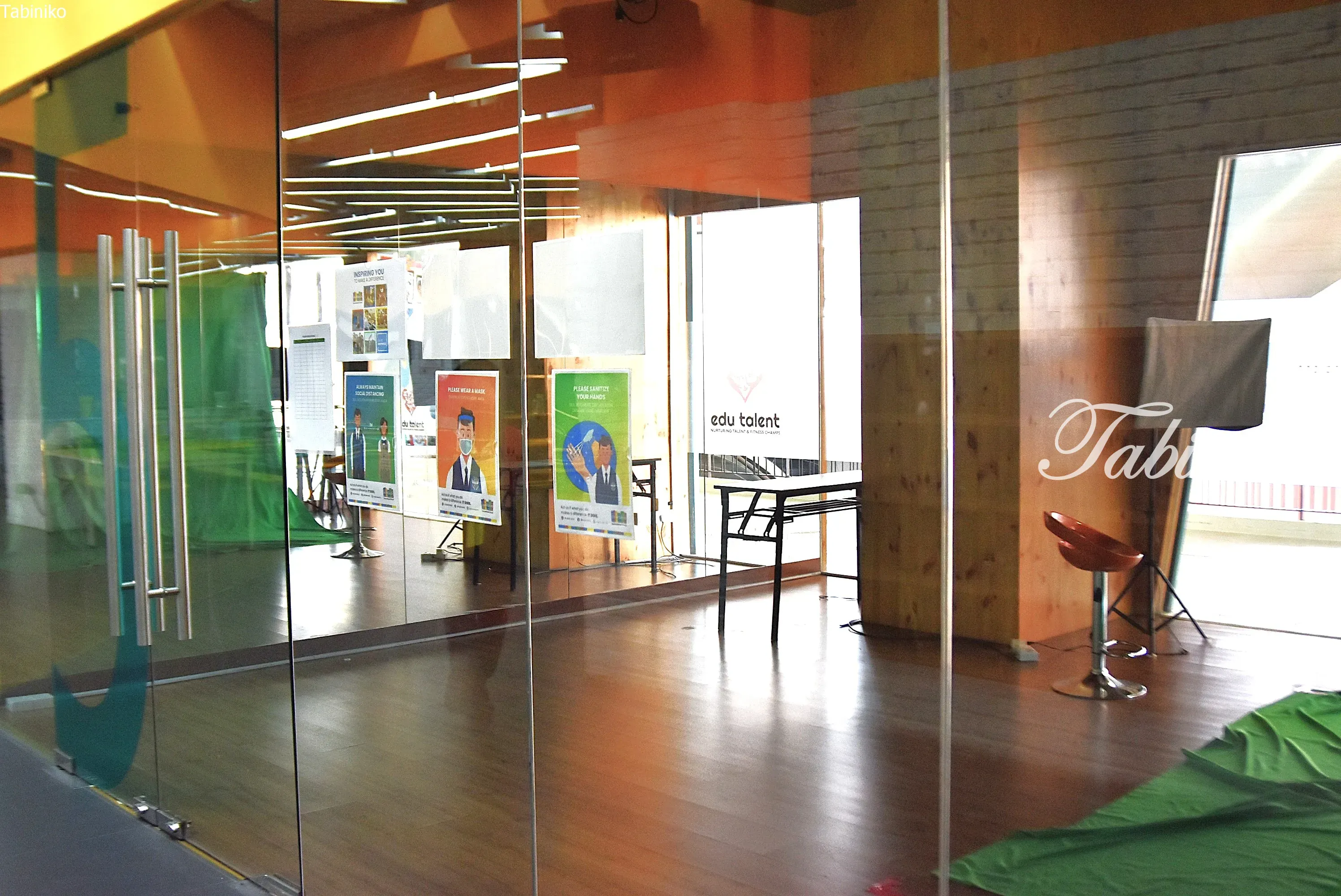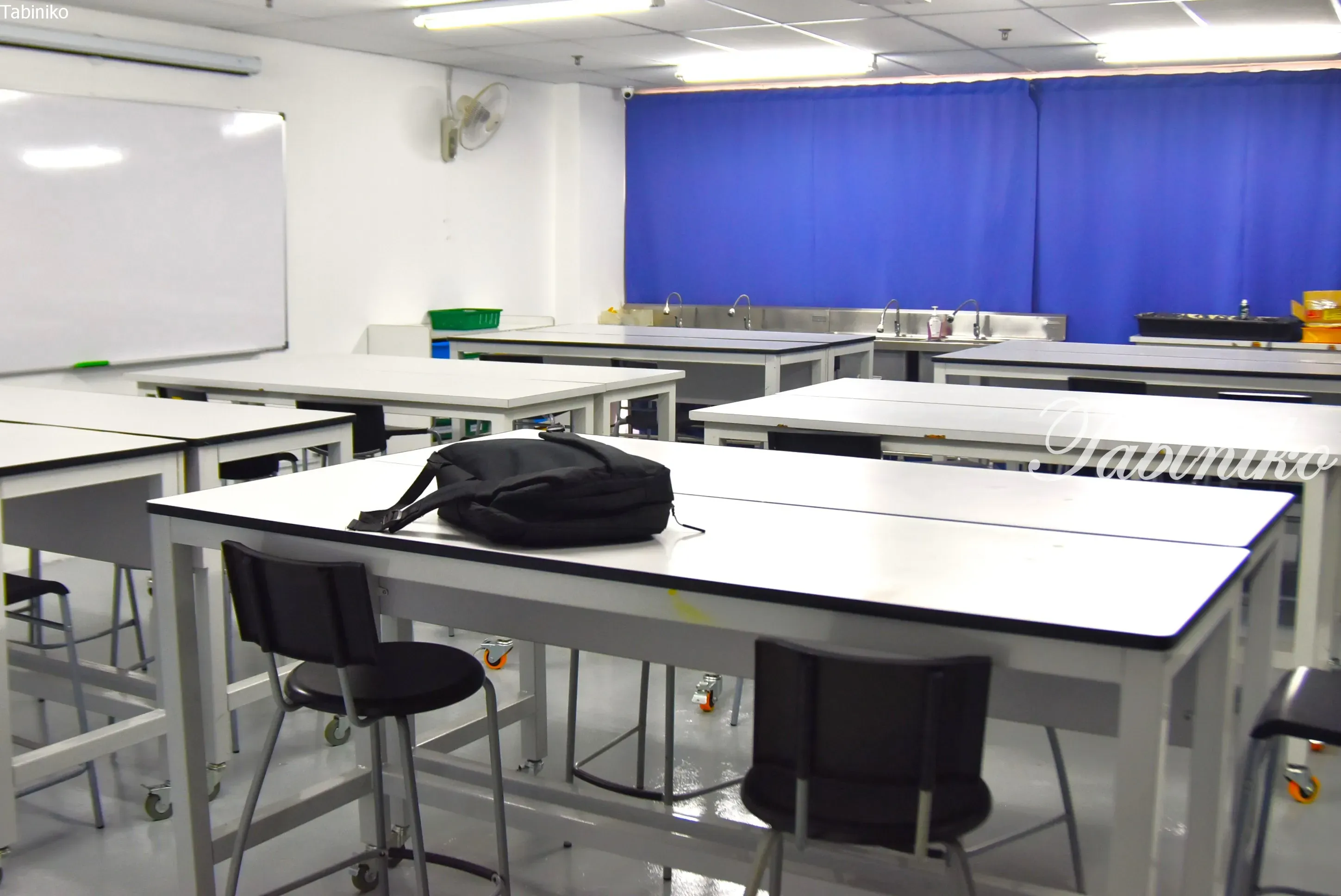 青いパネルの裏側にはステージがあって、生徒が集まるスペースとしても使われています。
