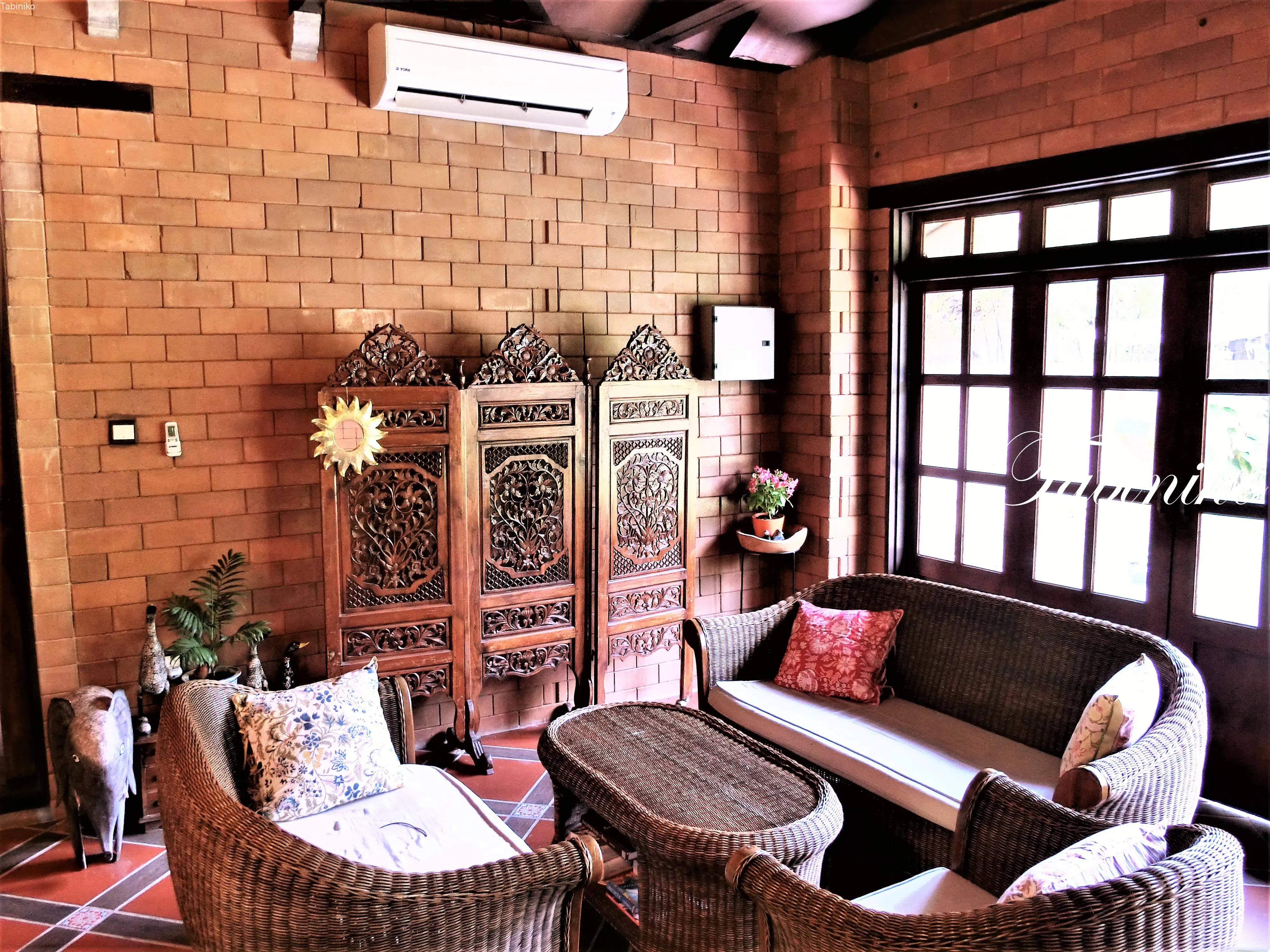こちらが内部。広いリビングルームです。落ち着いた雰囲気で、泊まるゲストの「まったり場」でもあり、交流の場でもあるので、大人数で寛げます。名付けて「The Space」。オーナーがゲストに「HOME」を感じてもらうように作った場所です。家具もバリから運んできたもので、ひとつひとつにオーナーのこだわりがあります。味わってくださいね。