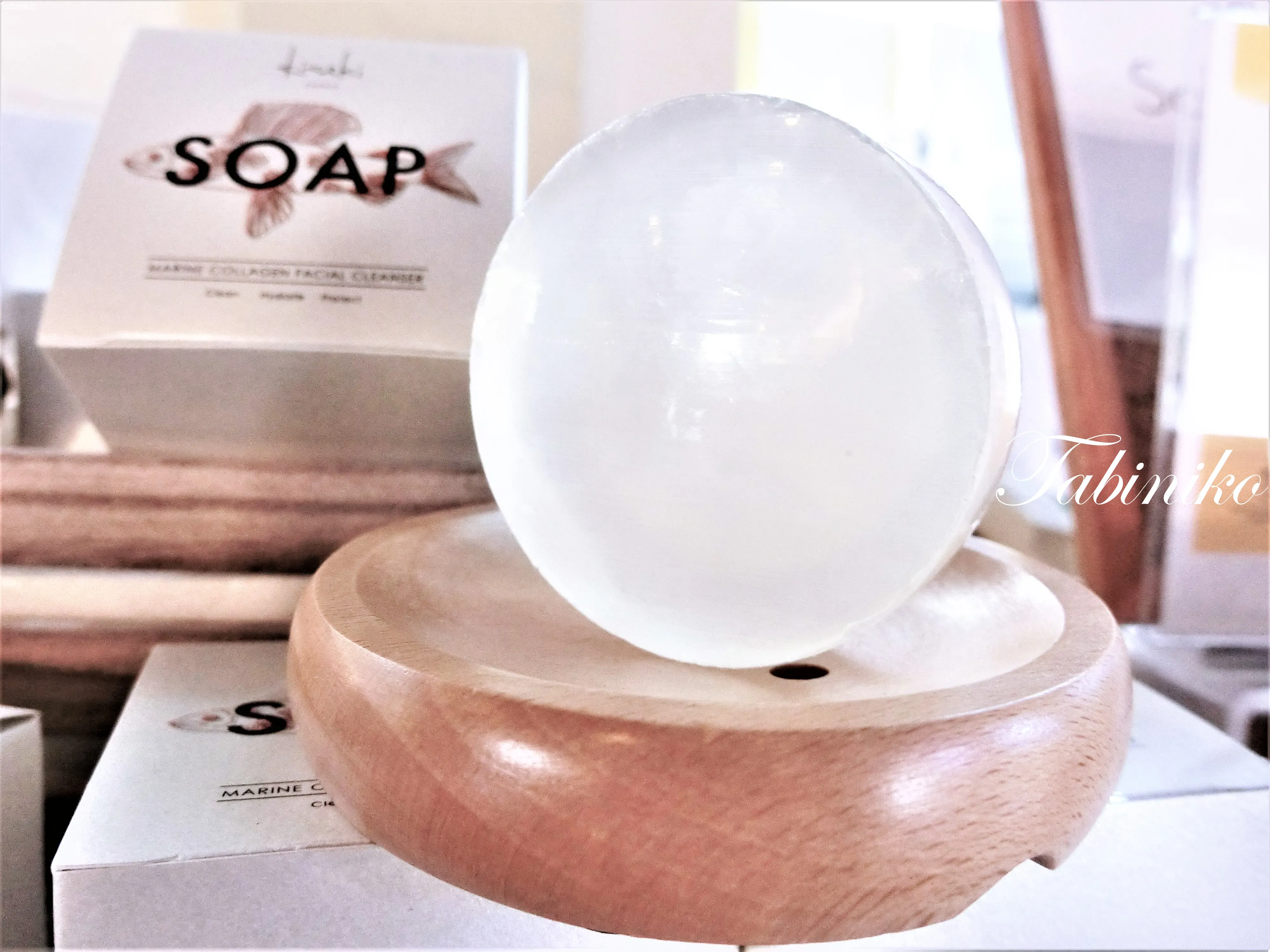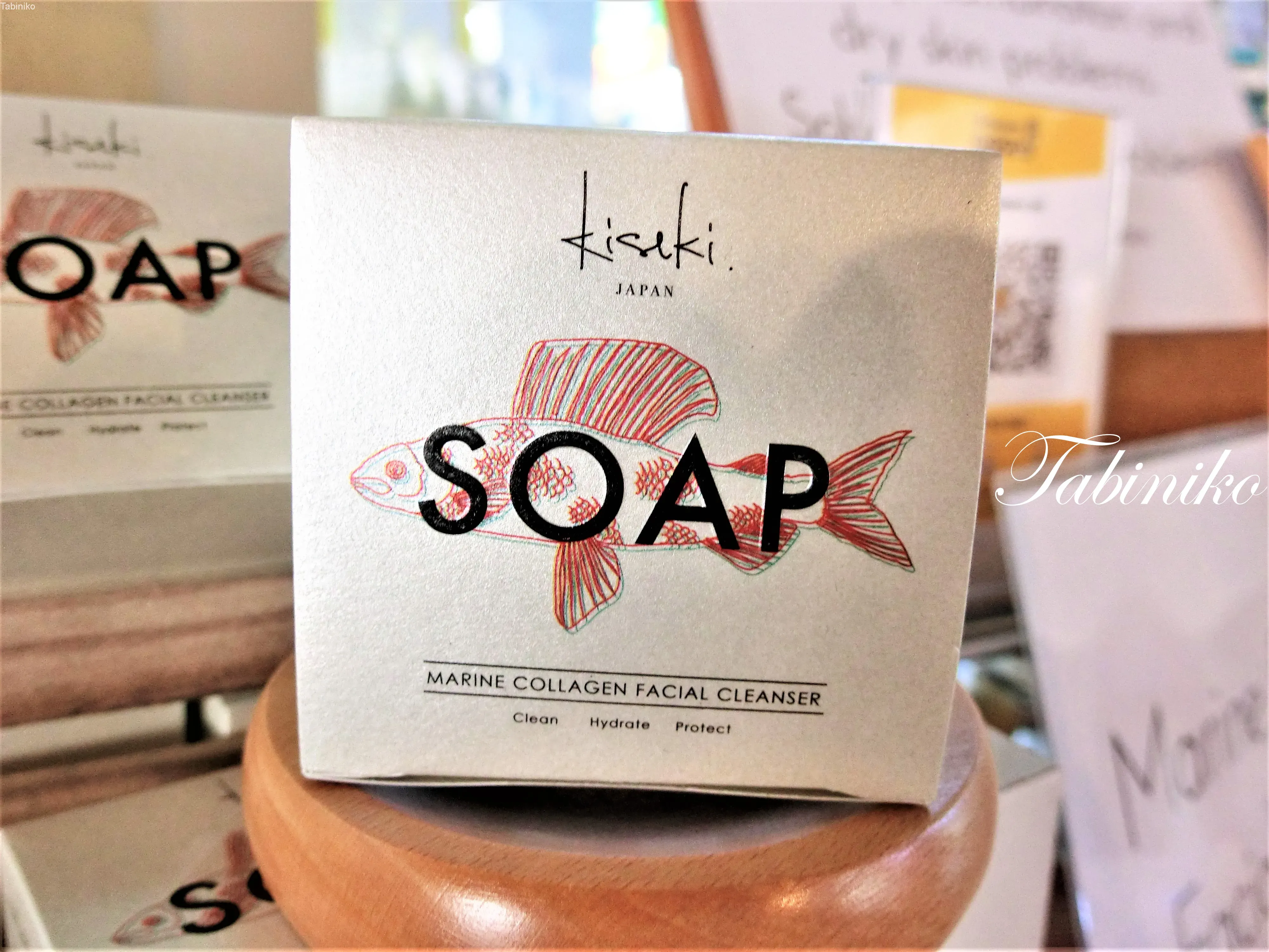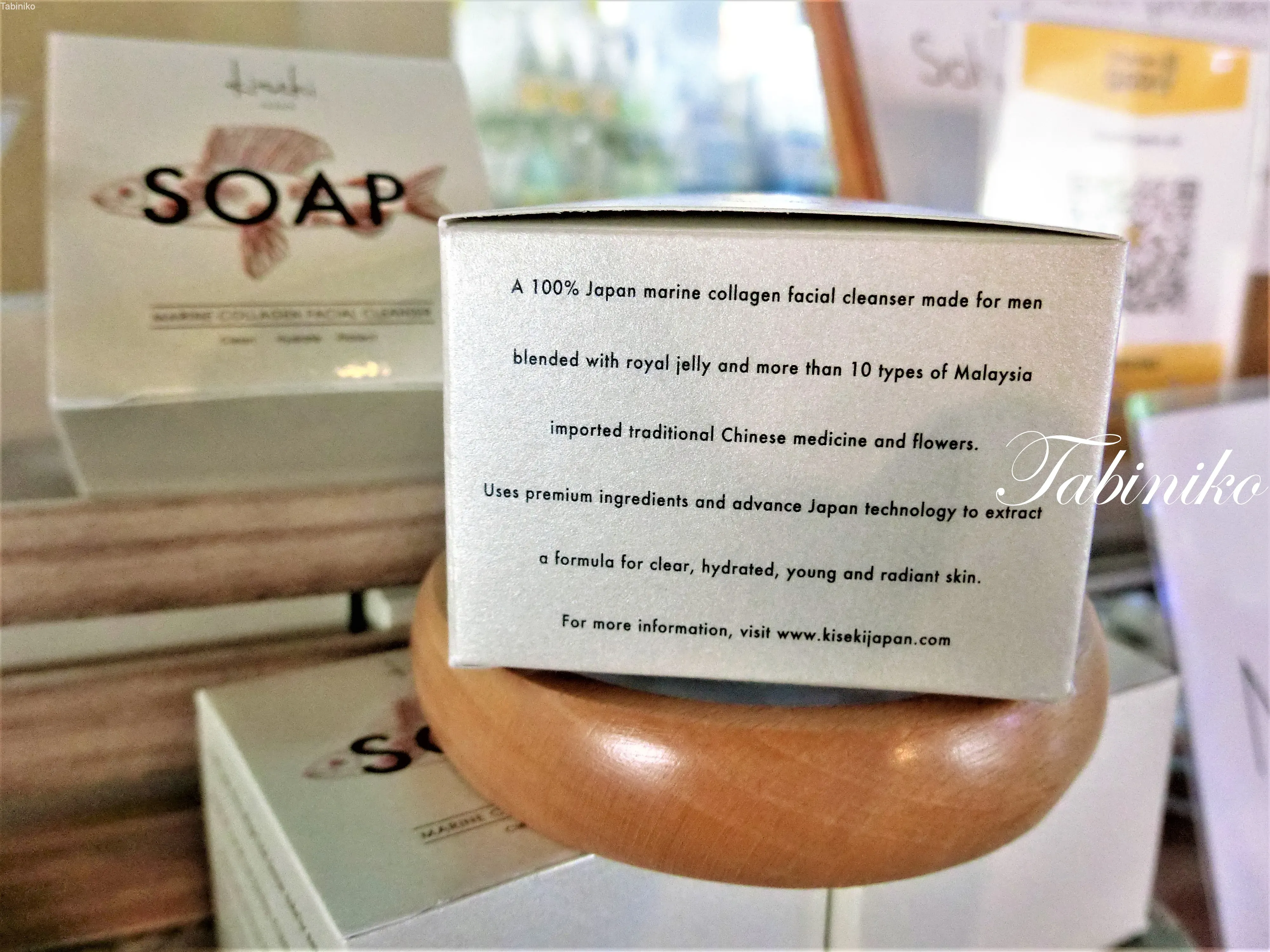 前回紹介しました炭製品の中で、マングローブ炭の石鹸30個が完売しました!ただ今品切れで申し訳ございません。炭シャンプー、炭スプレーはまだ在庫がありますので、是非マレーシアのお土産としてお買い求め下さい。今回ご紹介する石鹸はフィッシュコラーゲンと10種類のハーブを使って日本で生産した、お肌に優しいKiseki という石鹸です。この箱の中には、丸い石鹸と泡立てネットが入っています。