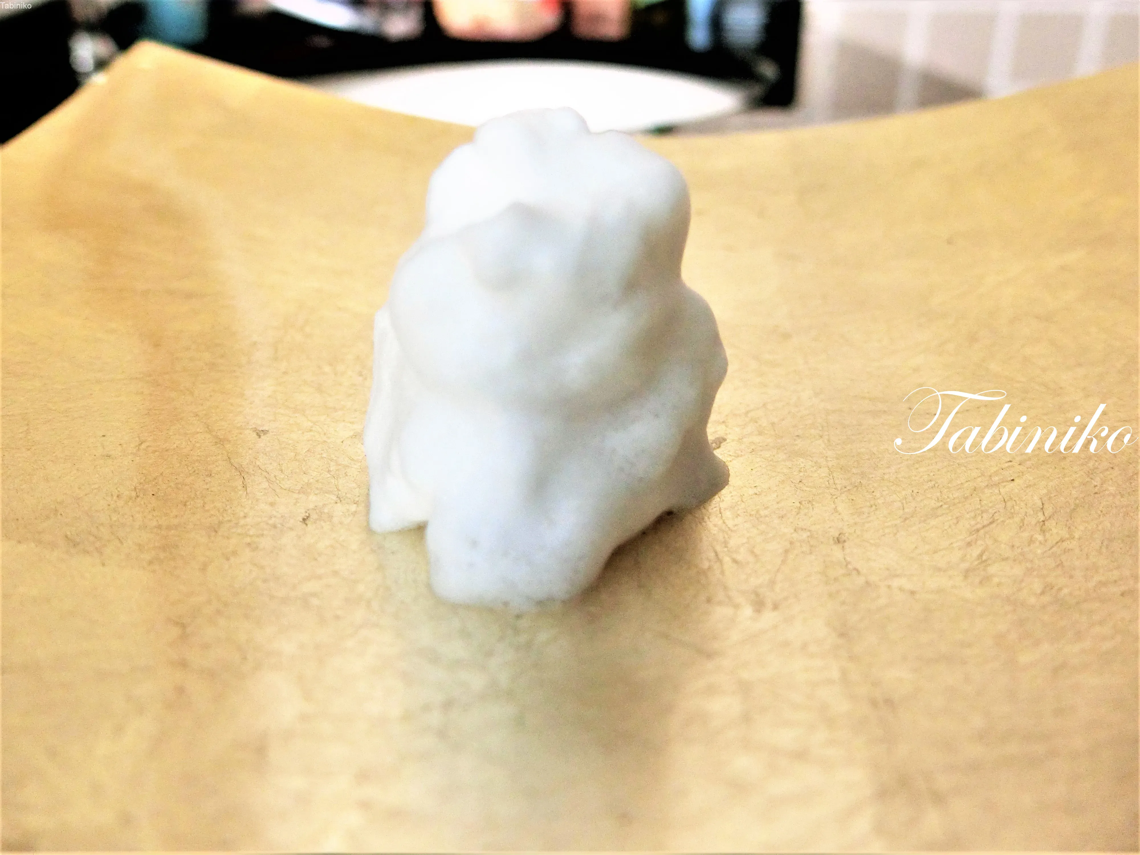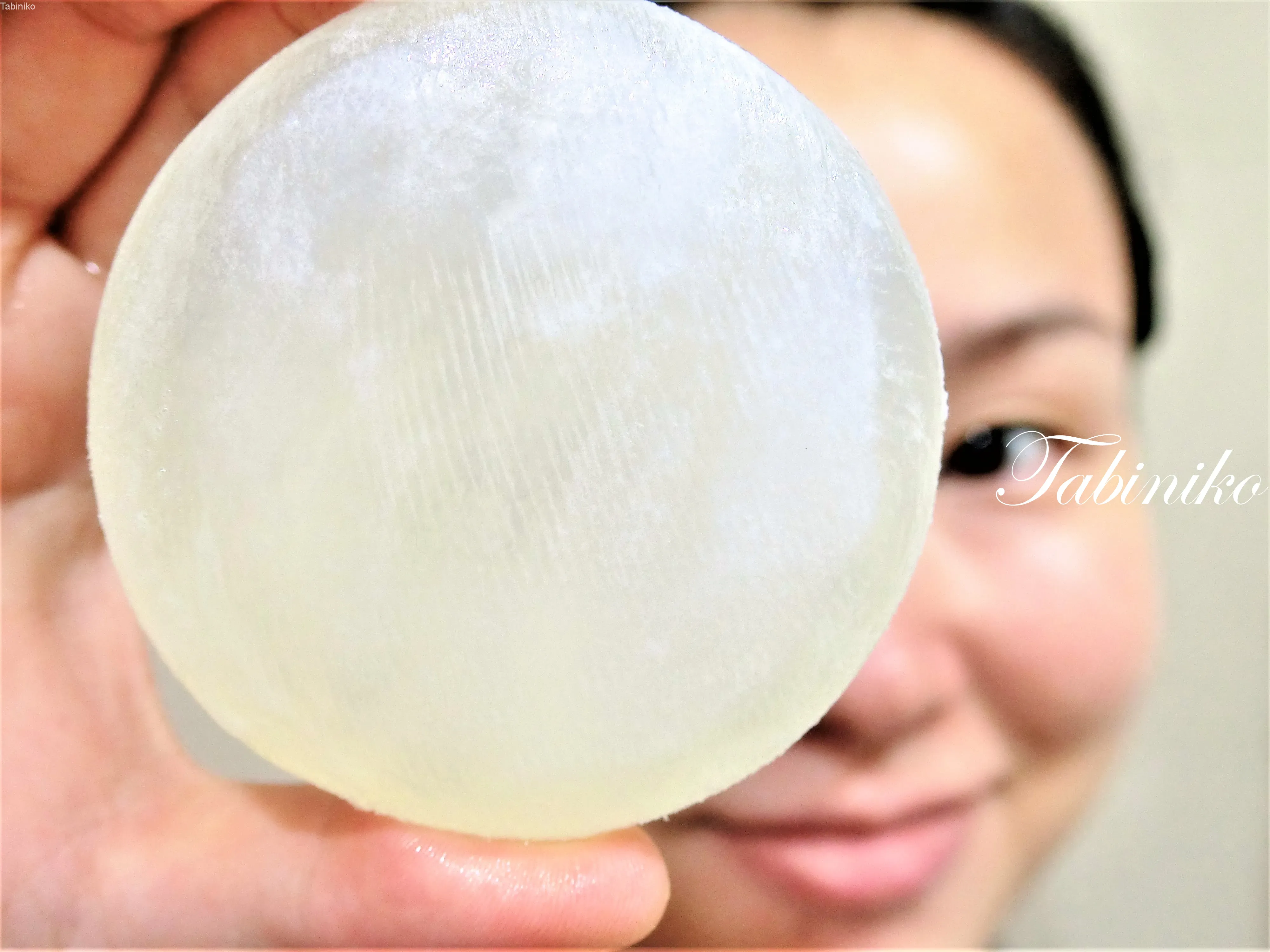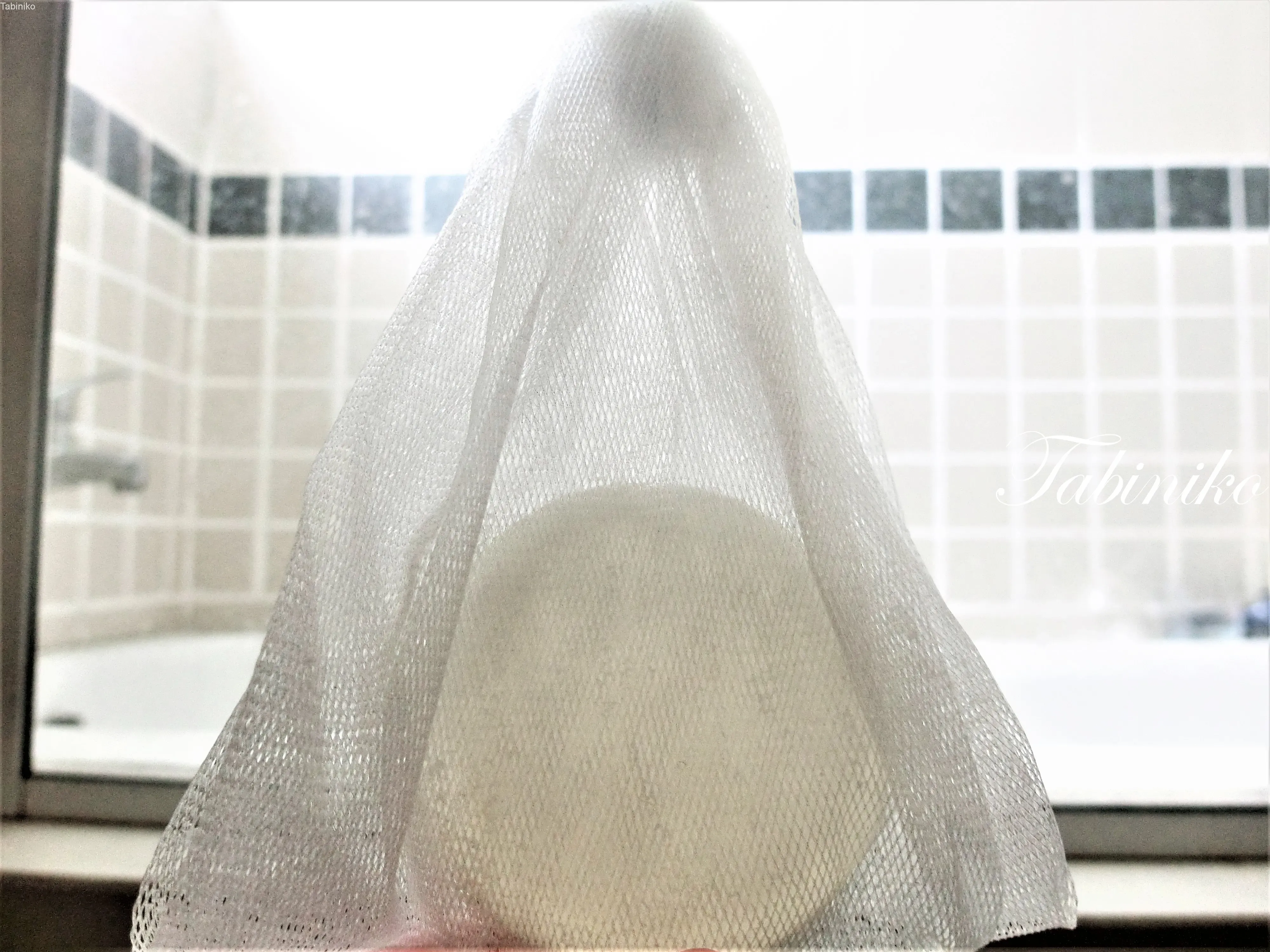 泡立てネットは輪っかになっているので、その中に石鹸を入れて少しのぬるま湯で泡立てて、泡で顔を洗います。