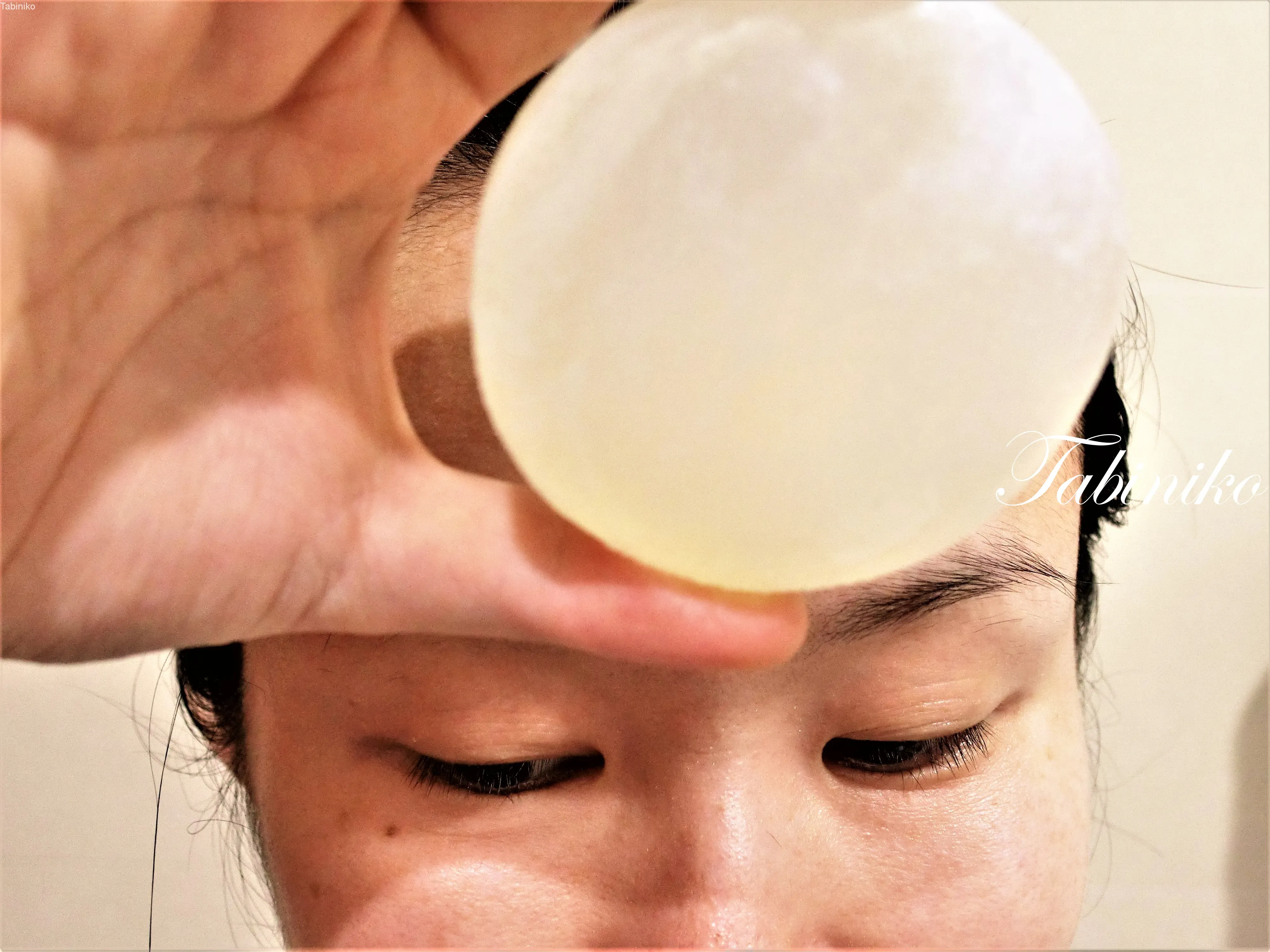 泡立てネットを使用してクリーミーな泡を作ります。泡で顔全体を洗ってぬるま湯ですすぎます。