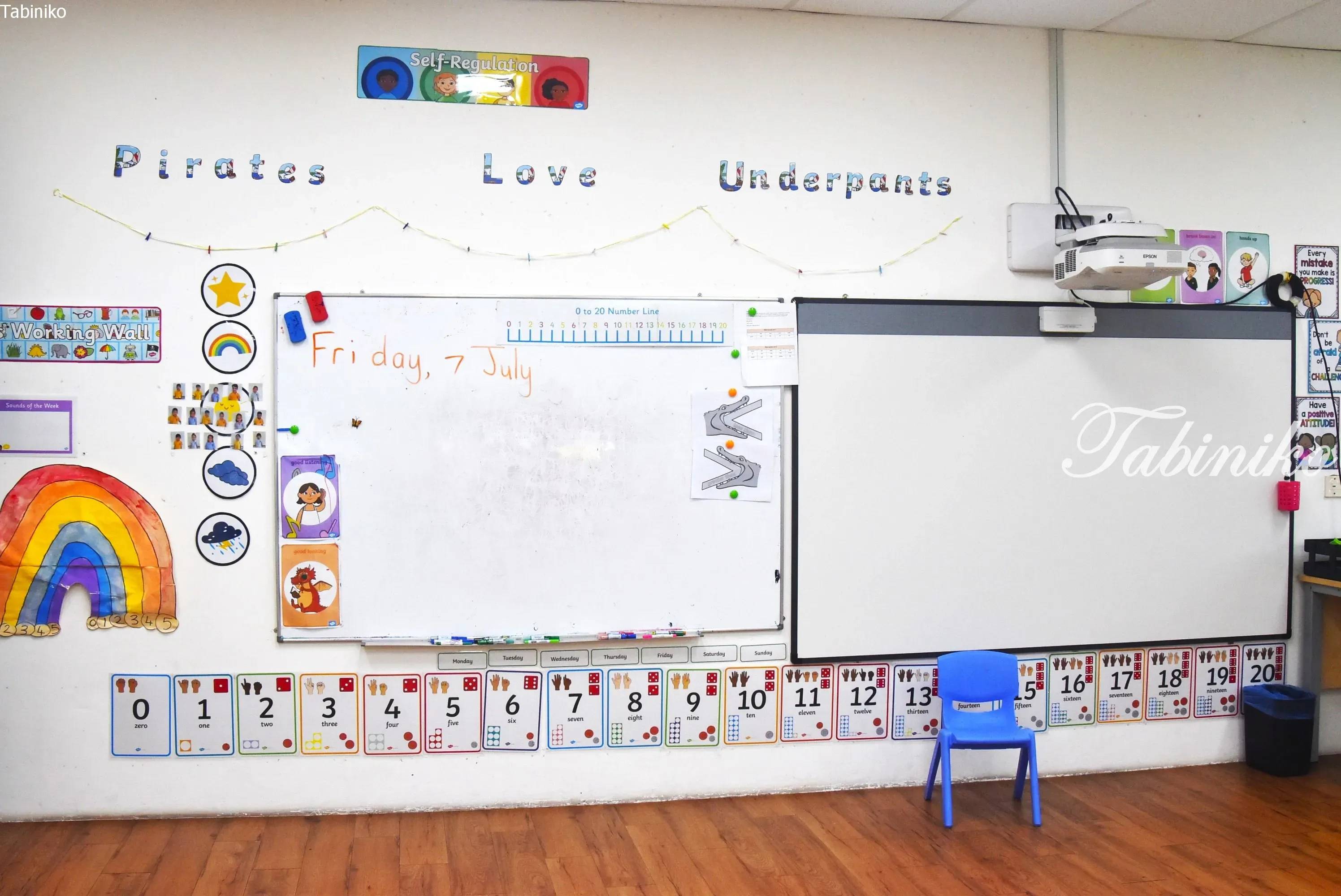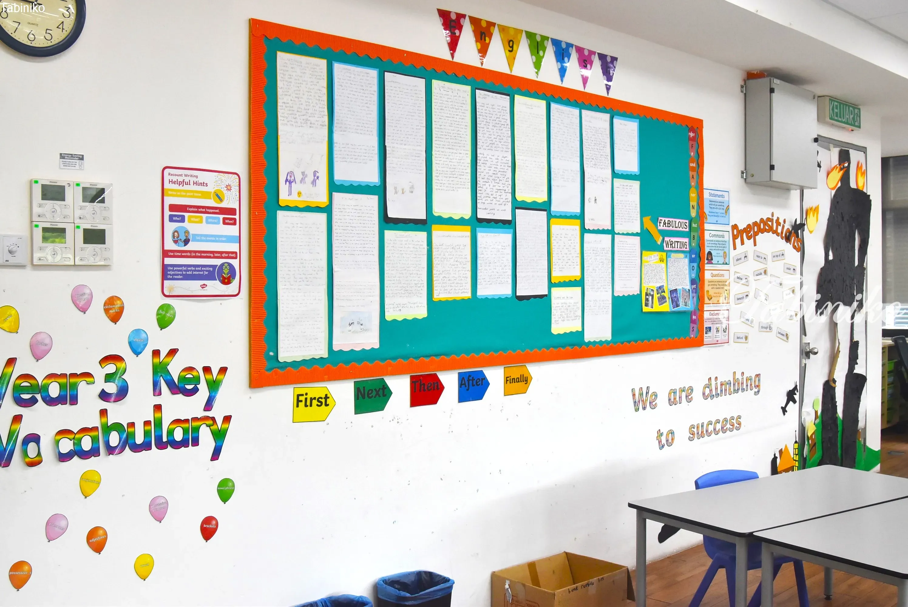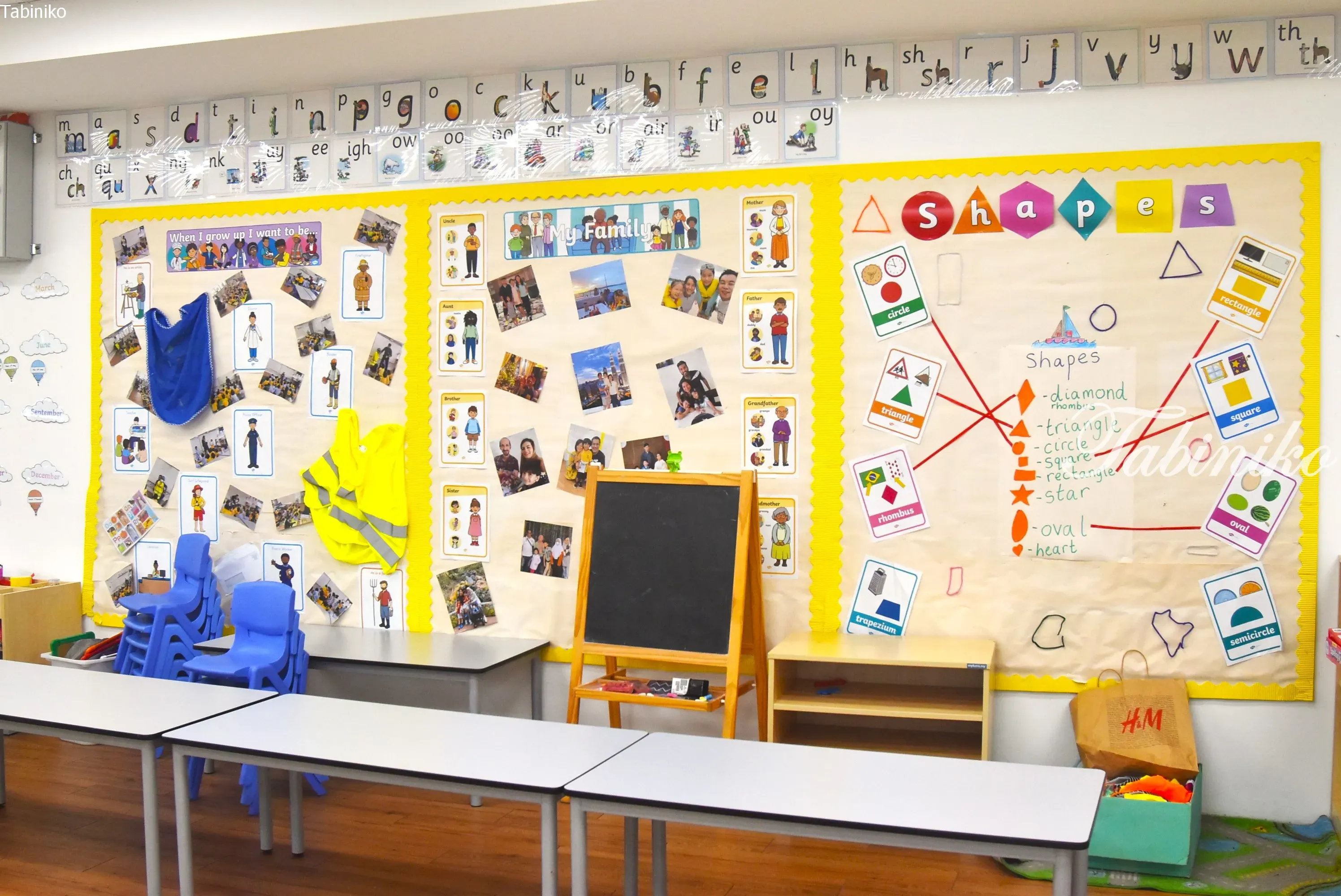 教室の中のデコレーションが可愛くて、子供たちは学校に来るのが楽しくなるでしょう!インターナショナルスクールって感じがします。私は日本の普通の公立学校に行きましたが、学校は殺風景でしたね。。。こんなにカラフルな学校、憧れます😄