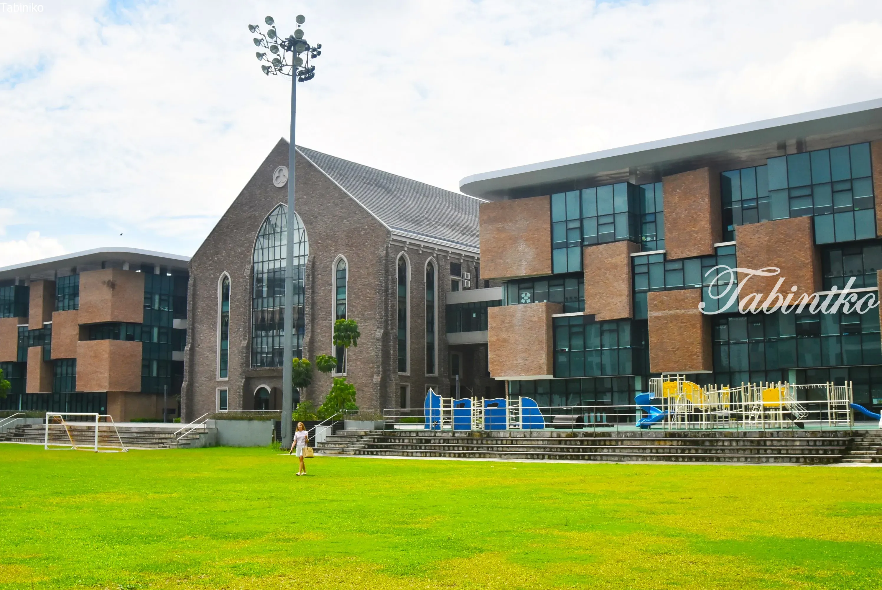 茶色と白のデザインの校舎は寮です。写真が切れていますが、左が男子寮。真ん中が女子寮。