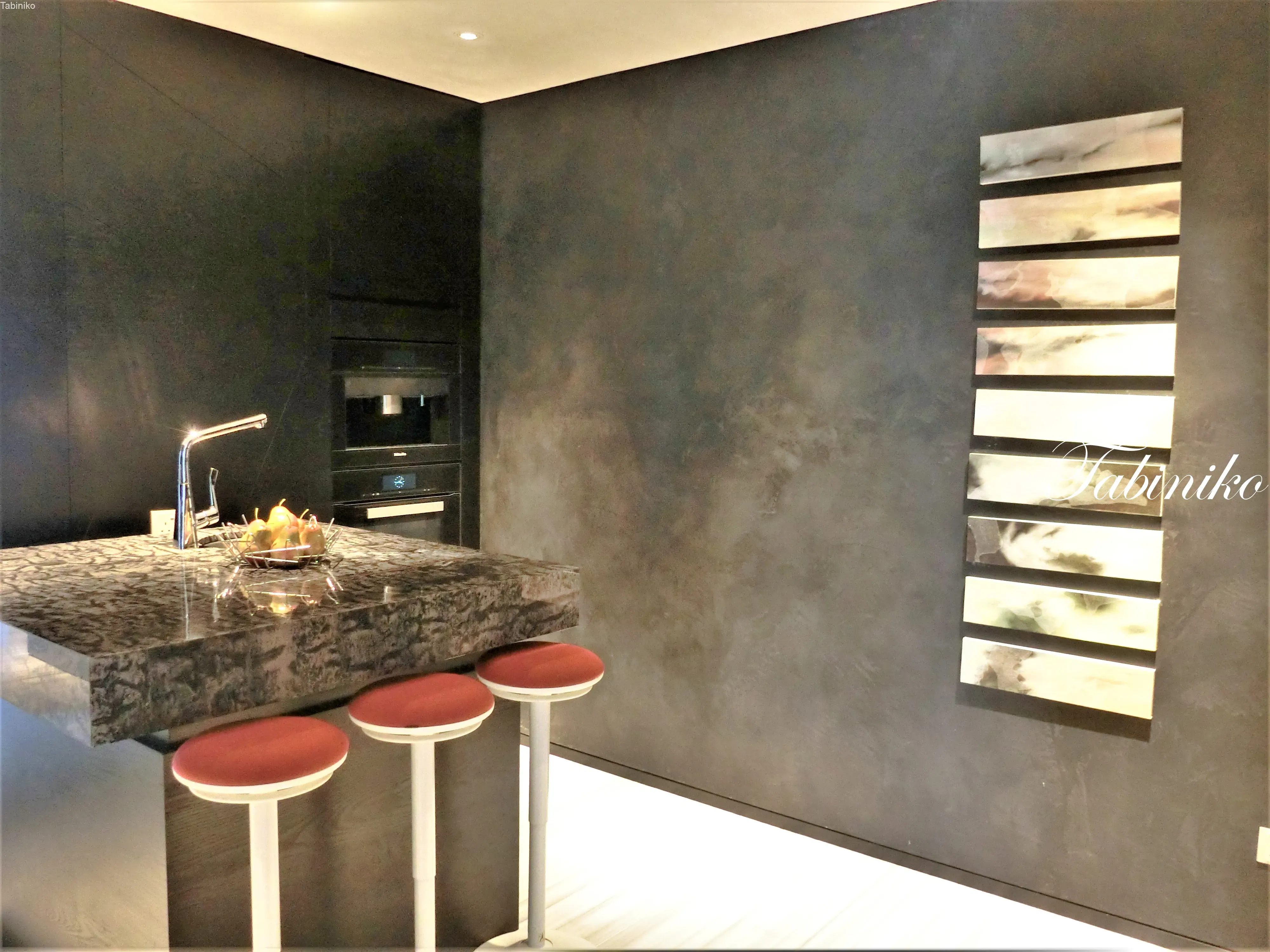 ダイニングとキッチン。先ほどの部屋は2つのキッチン(ドライキッチンとウェットキッチン)がありましたが、この部屋は1つのキッチンです。写真の真ん中より少し左に備え付けのコーヒーメーカーがあります。