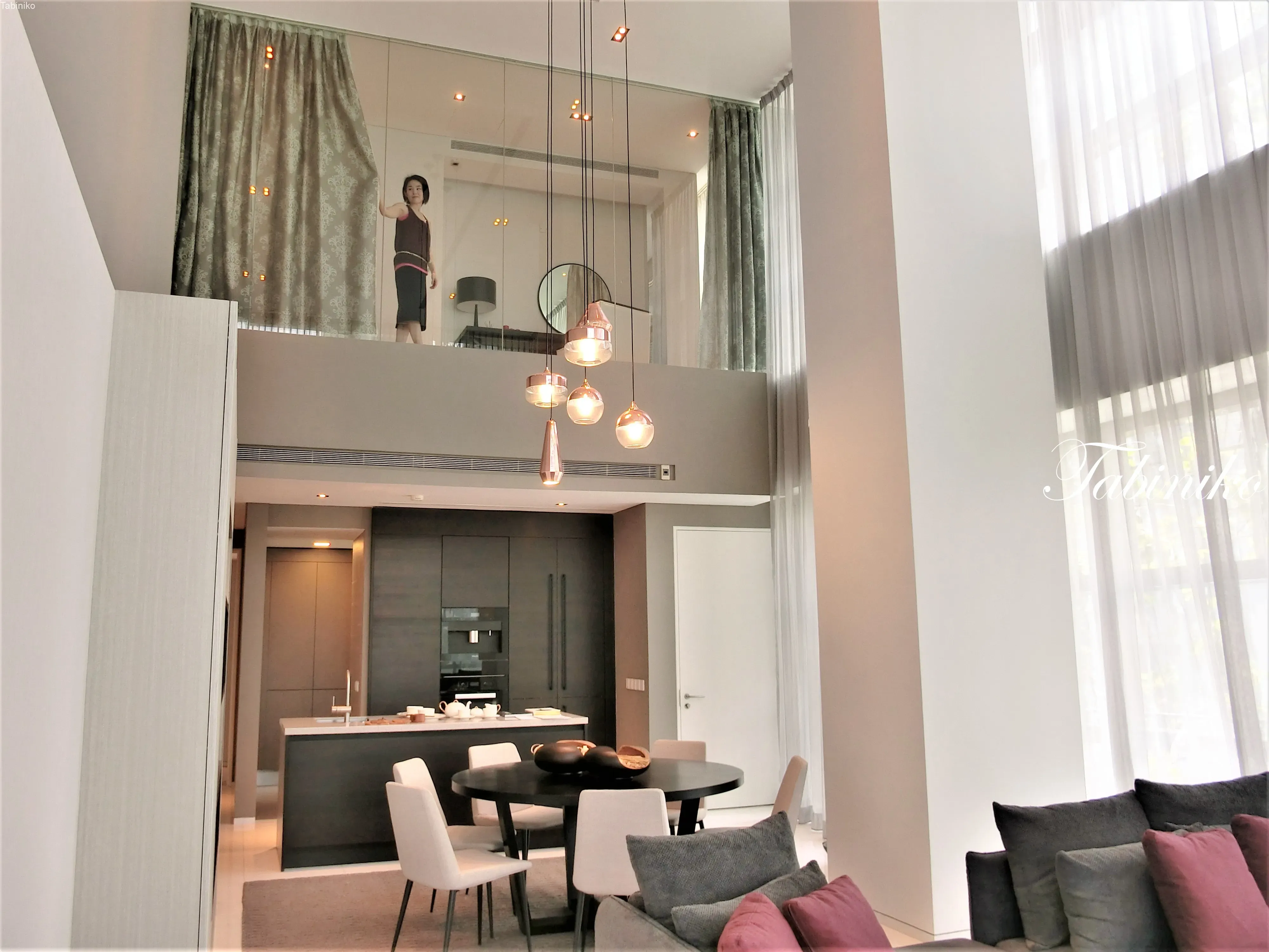 オシャレなキッチン+ダイニング。この部屋はメゾネットタイプでリビングとダイニングは吹き抜けで天井まで2階分の高さがあります。