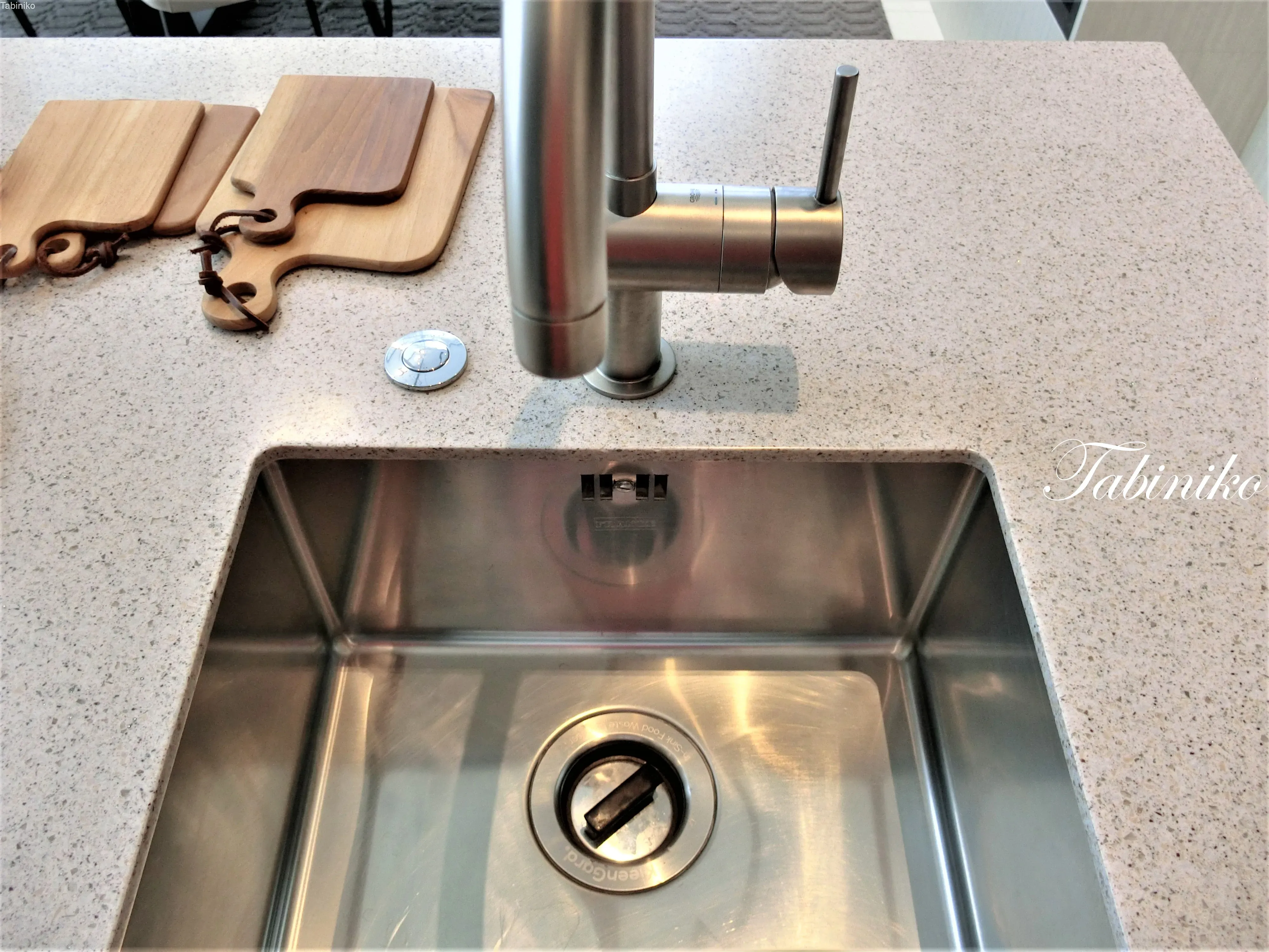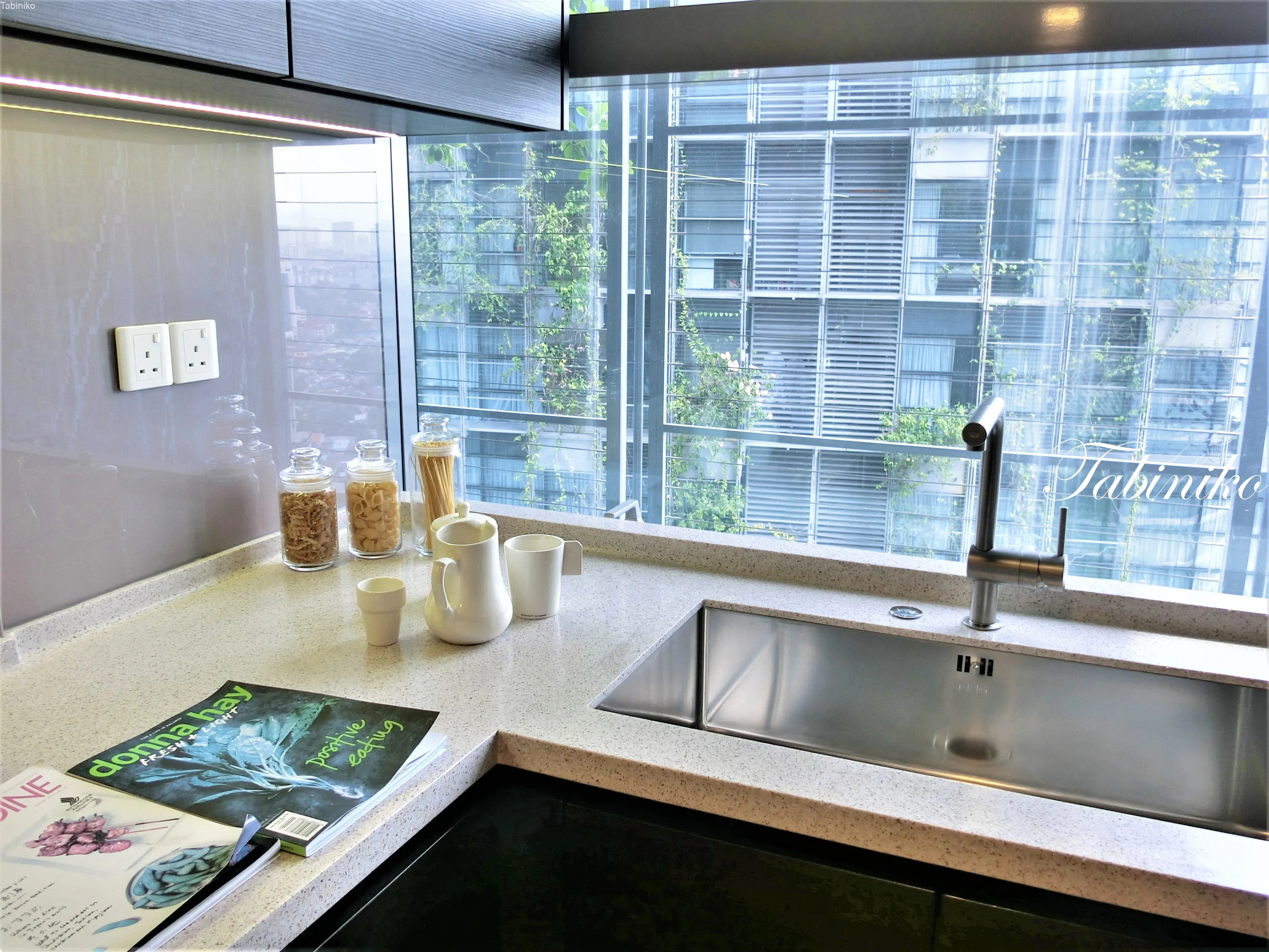 外観が植物で覆われていてキッチンの窓からも見えるので、すがすがしい朝を迎えられそうです。窓は少し開くので換気も出来ます。シンクもご覧の通り、大きめで使いやすいサイズです。このシンクもディスポーザー付き!