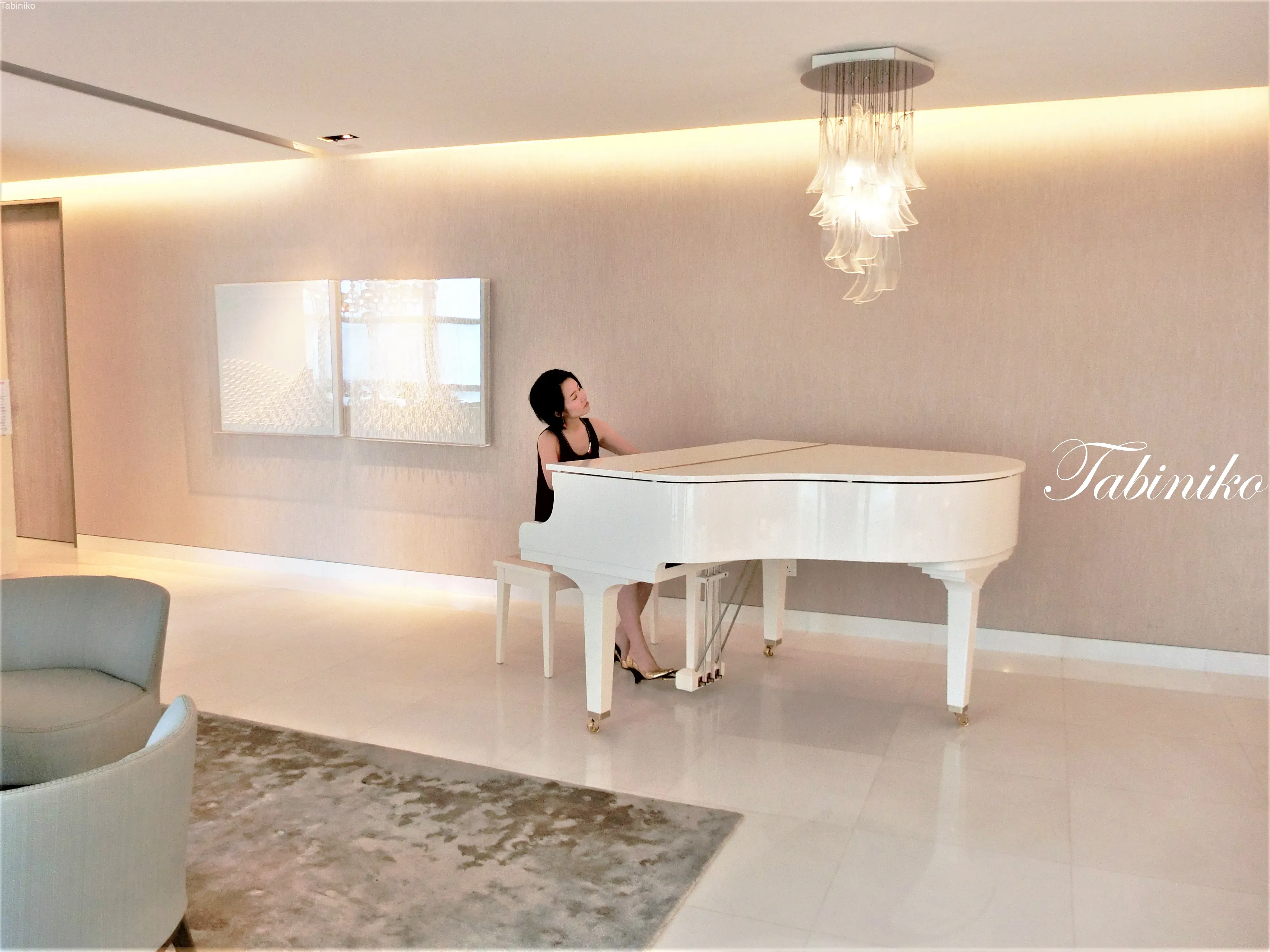 ブリッジを渡って、またラウンジ。白いピアノが置いてありますので、ショータイム!