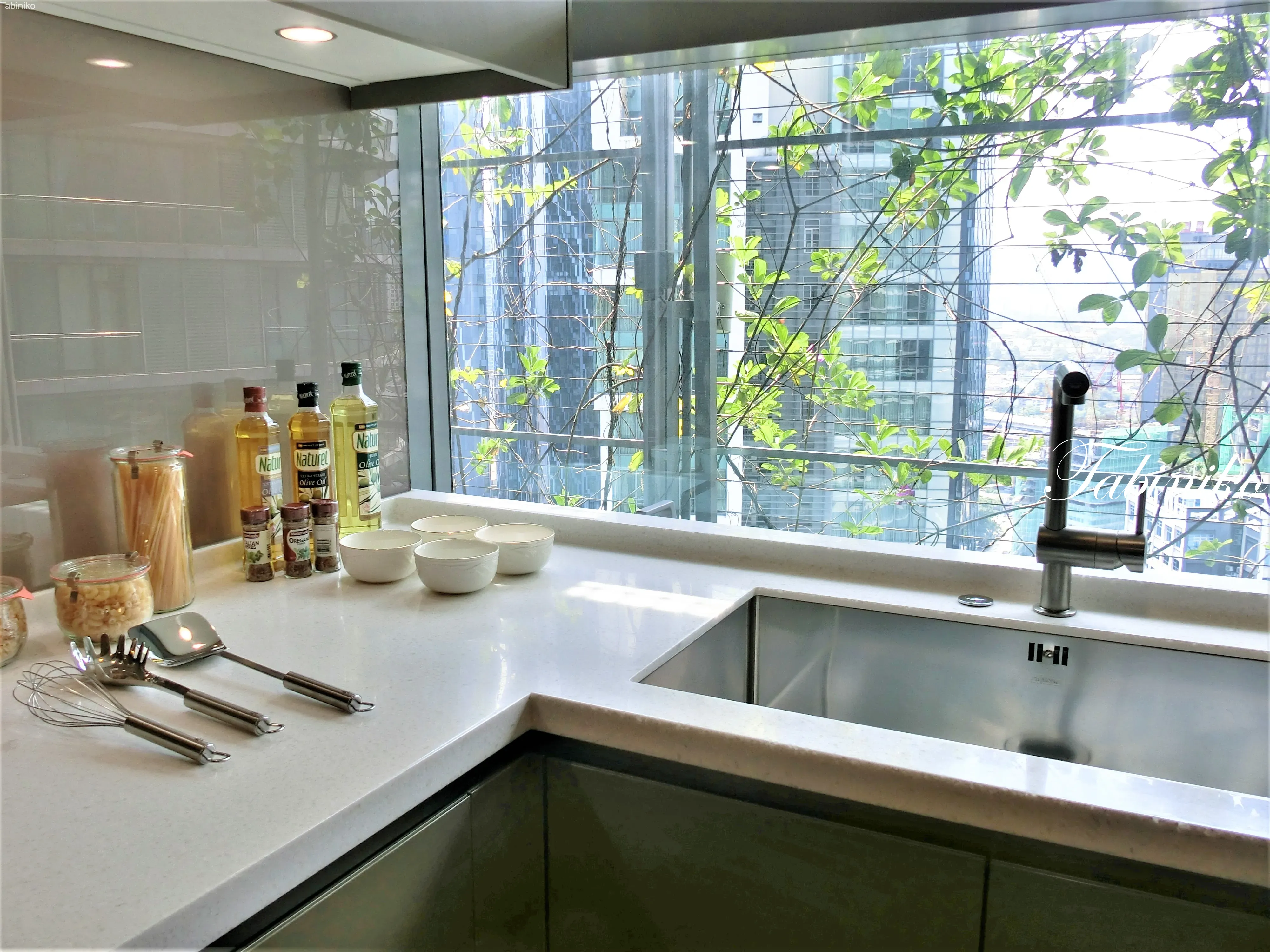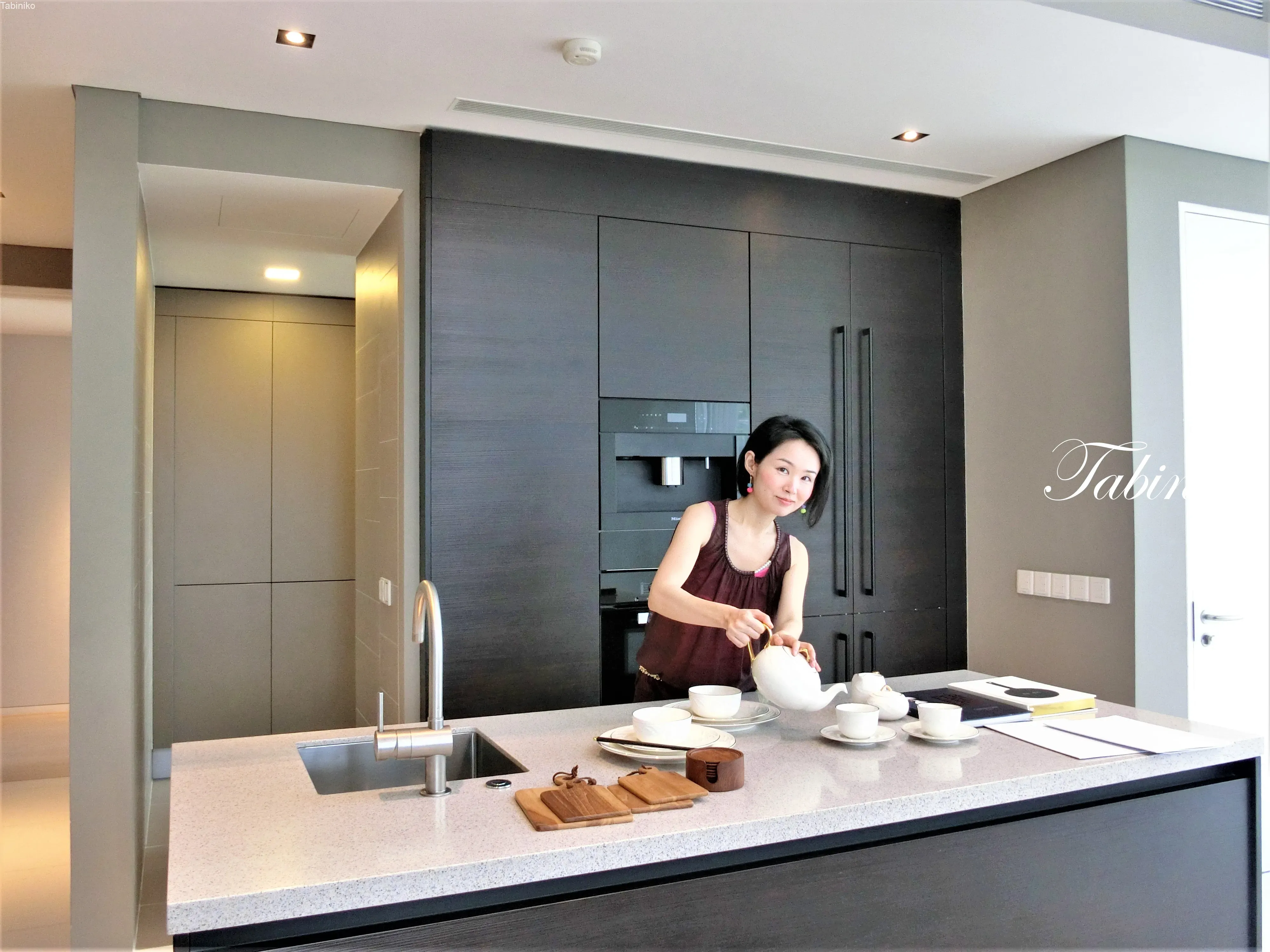 今見ているのはDry Kitchen(ドライキッチン)で、リビングダイニングに面しています。Dry Kitchen(ドライキッチン)とは、厨房全体が乾燥している床のことです。コーヒーやお茶を用意、食べ物を温めるくらいの家事を済ませる場所。何とディスポーザー付き!日本では当たり前ですが、これもマレーシアの物件で初めて見ました。