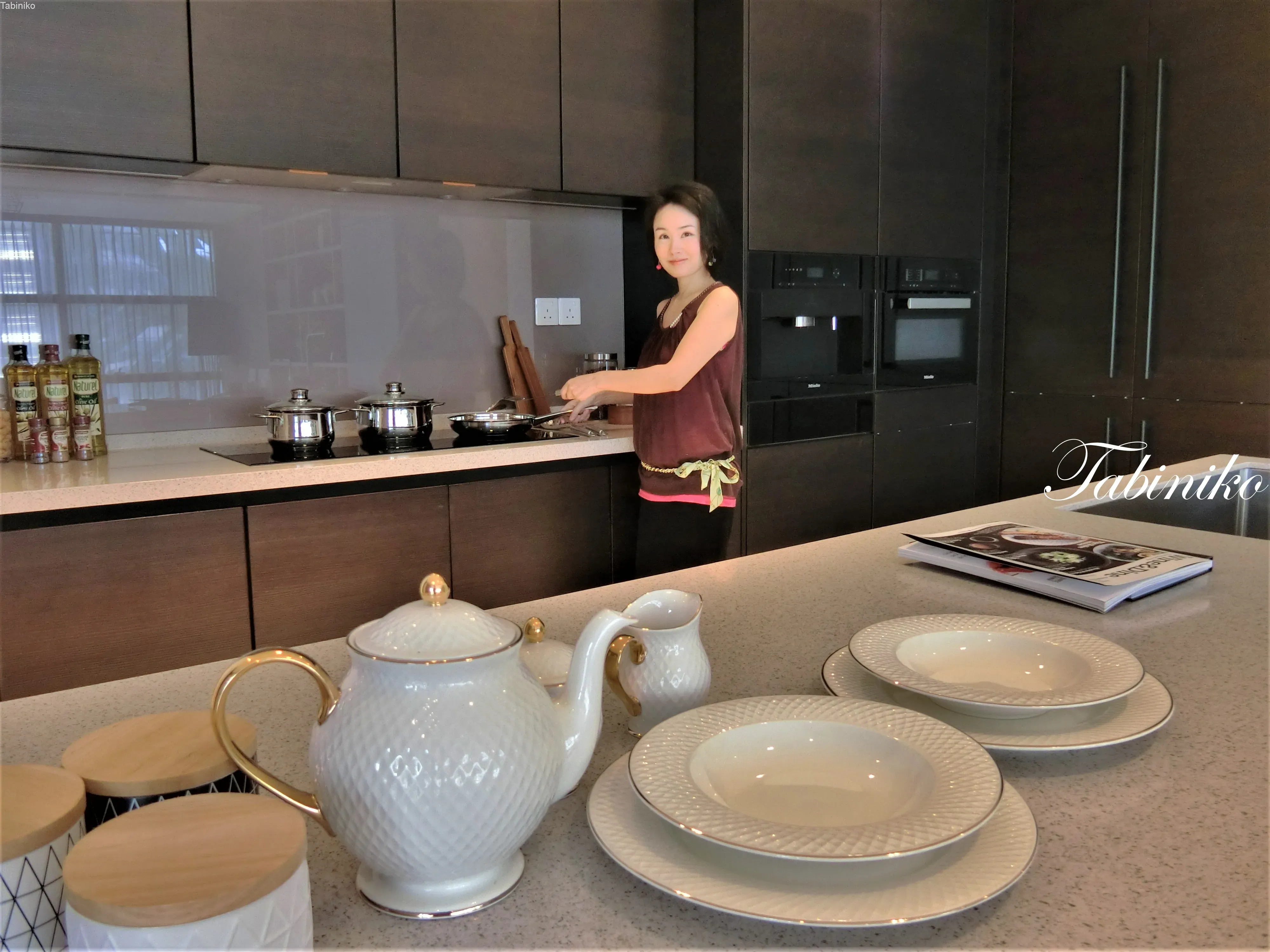 コーヒーメーカーや洗濯機、乾燥機の裏側は、Wet Kitchen(ウェットキッチン)といって、主に料理する台所があります。冷蔵庫も設置されています。Wet Kitchen(ウェットキッチン)、本当は床に水を流しながら掃除できる台所で、排水溝があり僅かに床が傾いている特徴があります。でも、マレーシアの住宅のWet Kitchenは、ほとんど床は水で掃除しないようです。