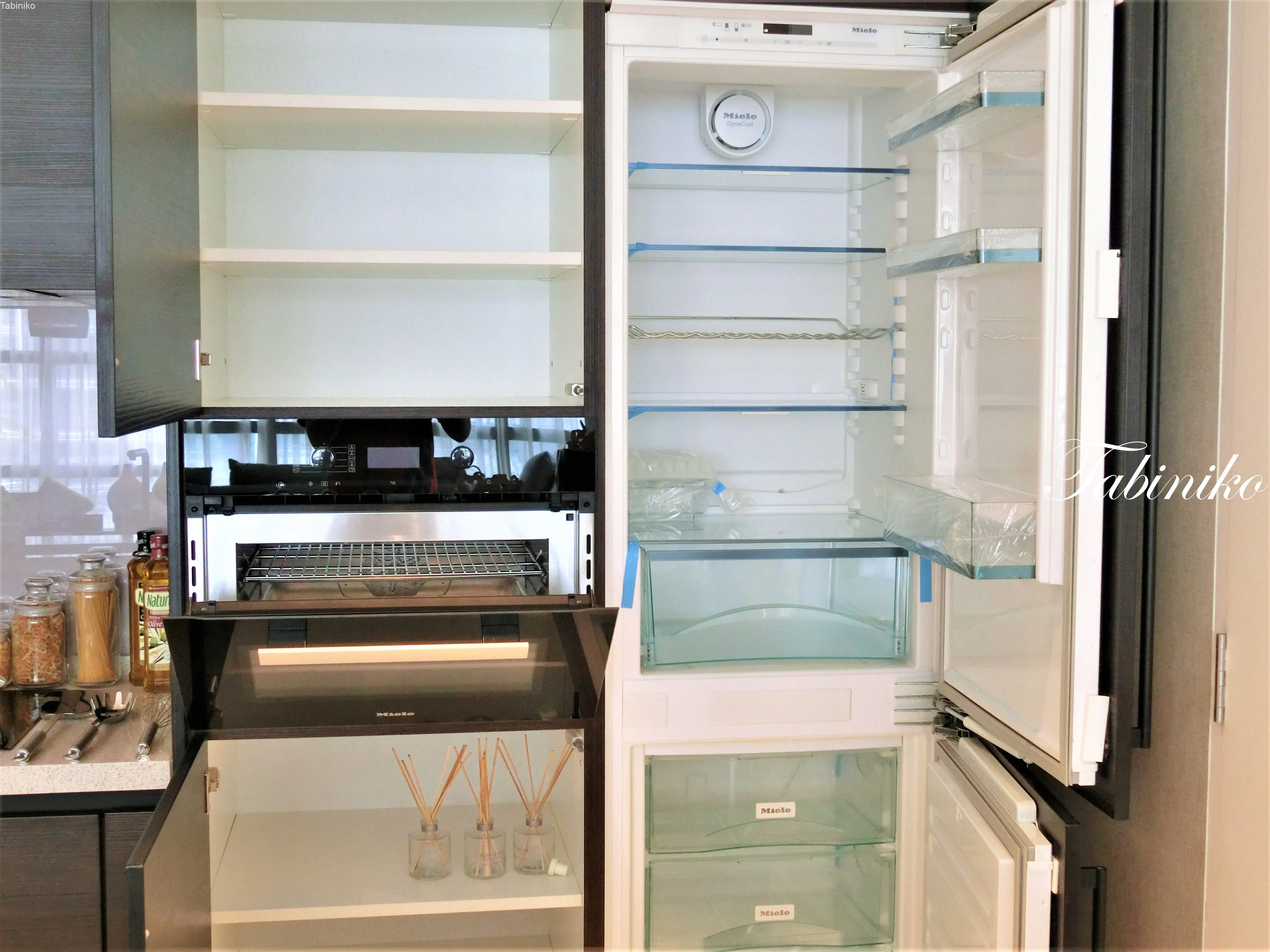 冷蔵庫、オーブン、写真の左にはIHクッキングヒーター。家電も、棚も沢山あるので色々収納出来ます。