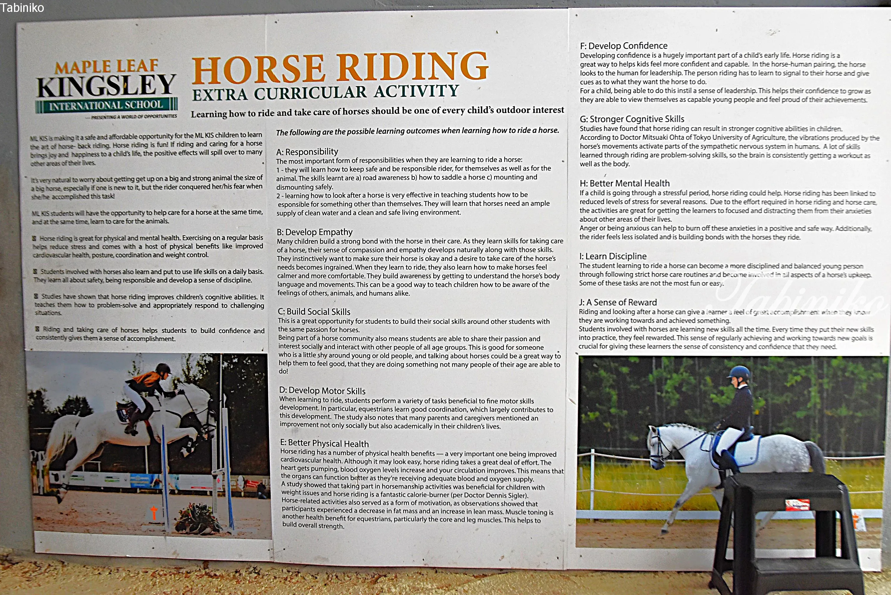 Maple Leafという教育組織に所属していて、中国、北アメリカ、東南アジアなどで複数の学校を管理しています。キングスレーはその一つです。キングスレーは、校舎も広く、施設も沢山!!そして他の学校にはない特別なポイントとしては、別途料金にはなりますが、何と乗馬も出来ます!馬も何頭か持っていて本格的な乗馬クラスもあります。室内には鉄棒や平均台など体操が出来る施設もあって、乗馬と体操器具は他のインターナショナルスクールでは見たことがありません。学費はおさえめでこれだけの施設があるので、人気がでる理由がわかります。学年によってはウェイティングです。 課外活動の選択肢が多いのはキングスレーの特徴だと思います。